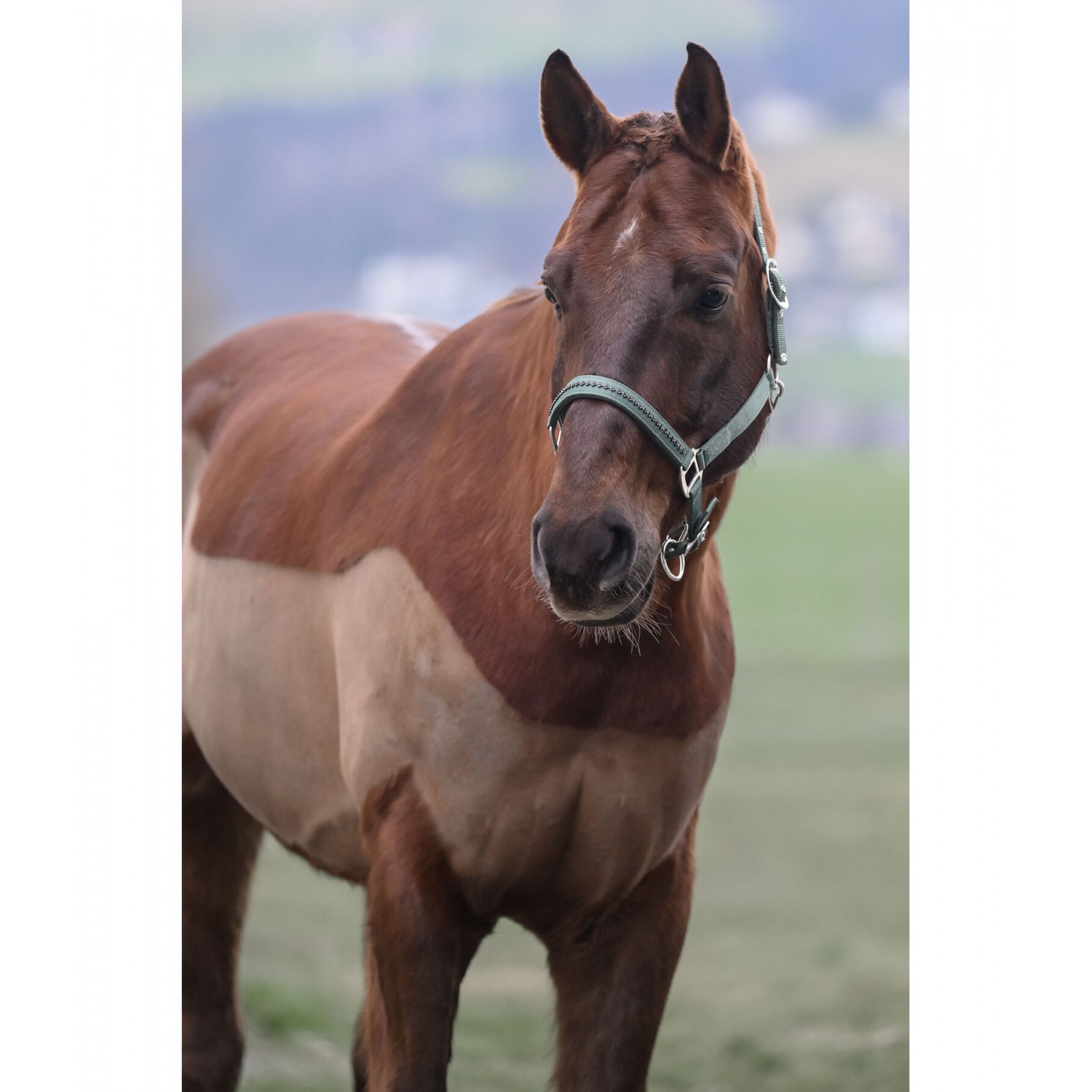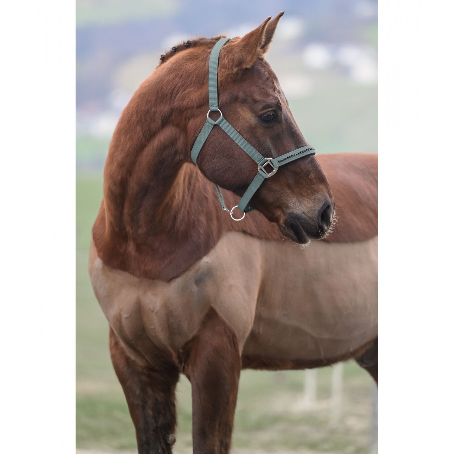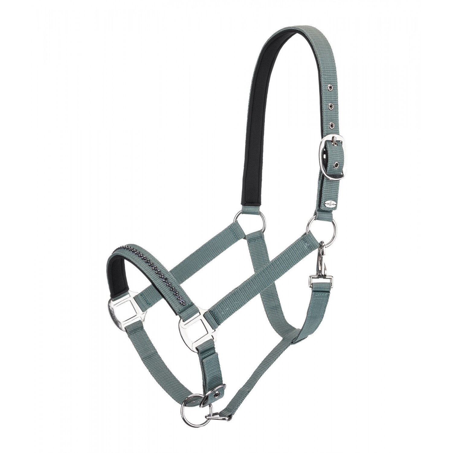 Элегантный, прочный недоуздок с мелкими стразами на носовом ремне и мягкой подкладкой из хлоропреновой резины на оголовье и носовом ремне для комфортного ношения. Регулируется на оголовье и подбородочном ремне с помощью фурнитуры. Недоуздок: 100% полипропилен, подкладка: 100% хлоропреновая резина.