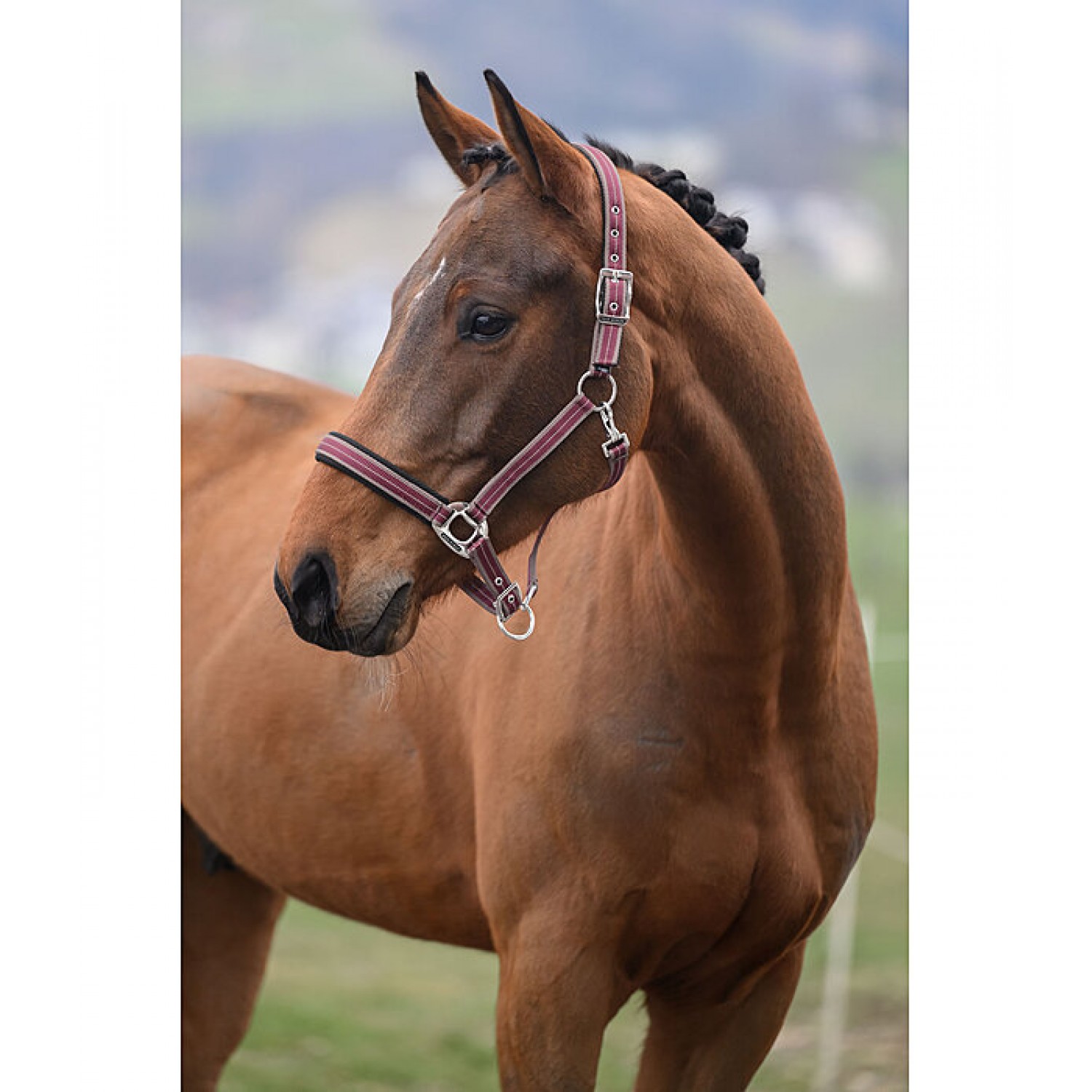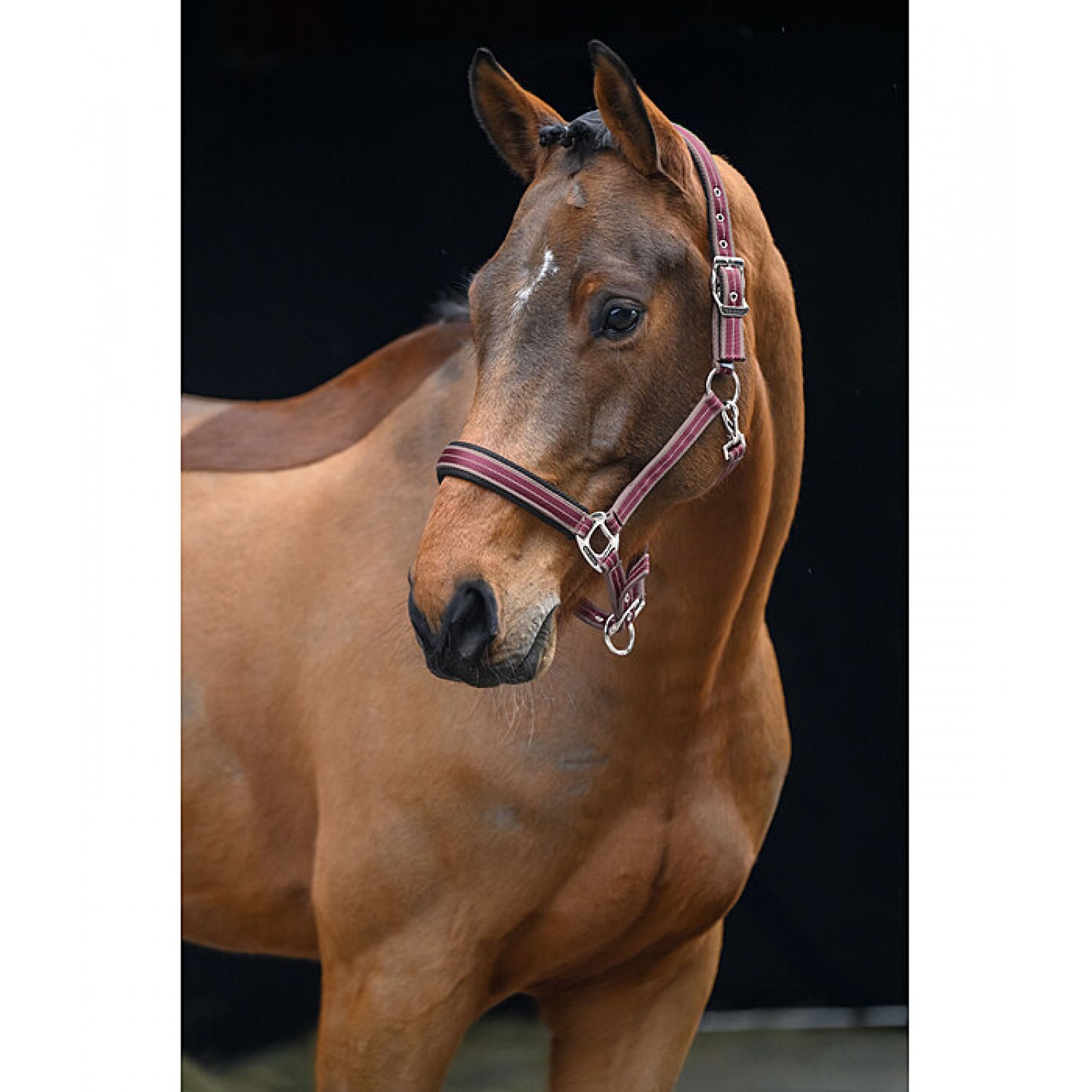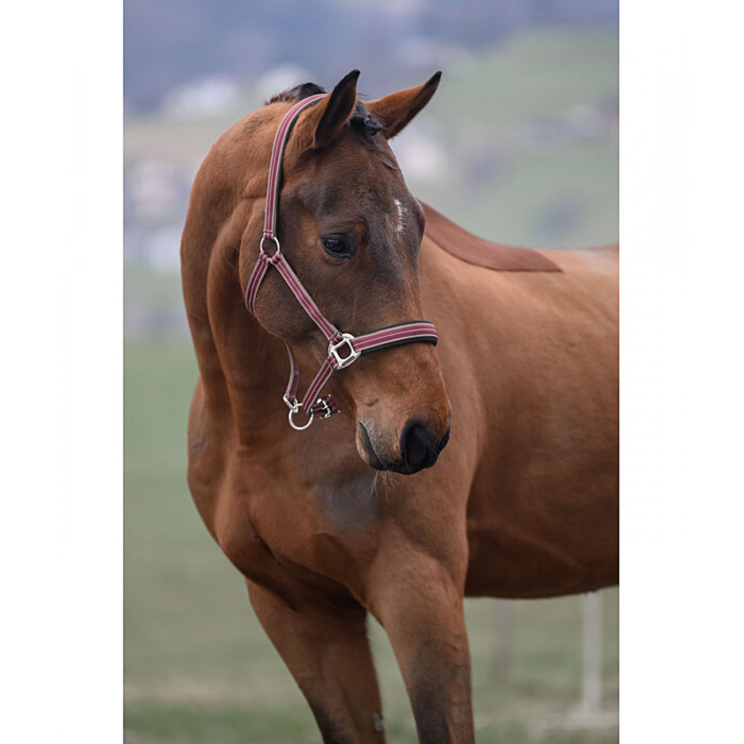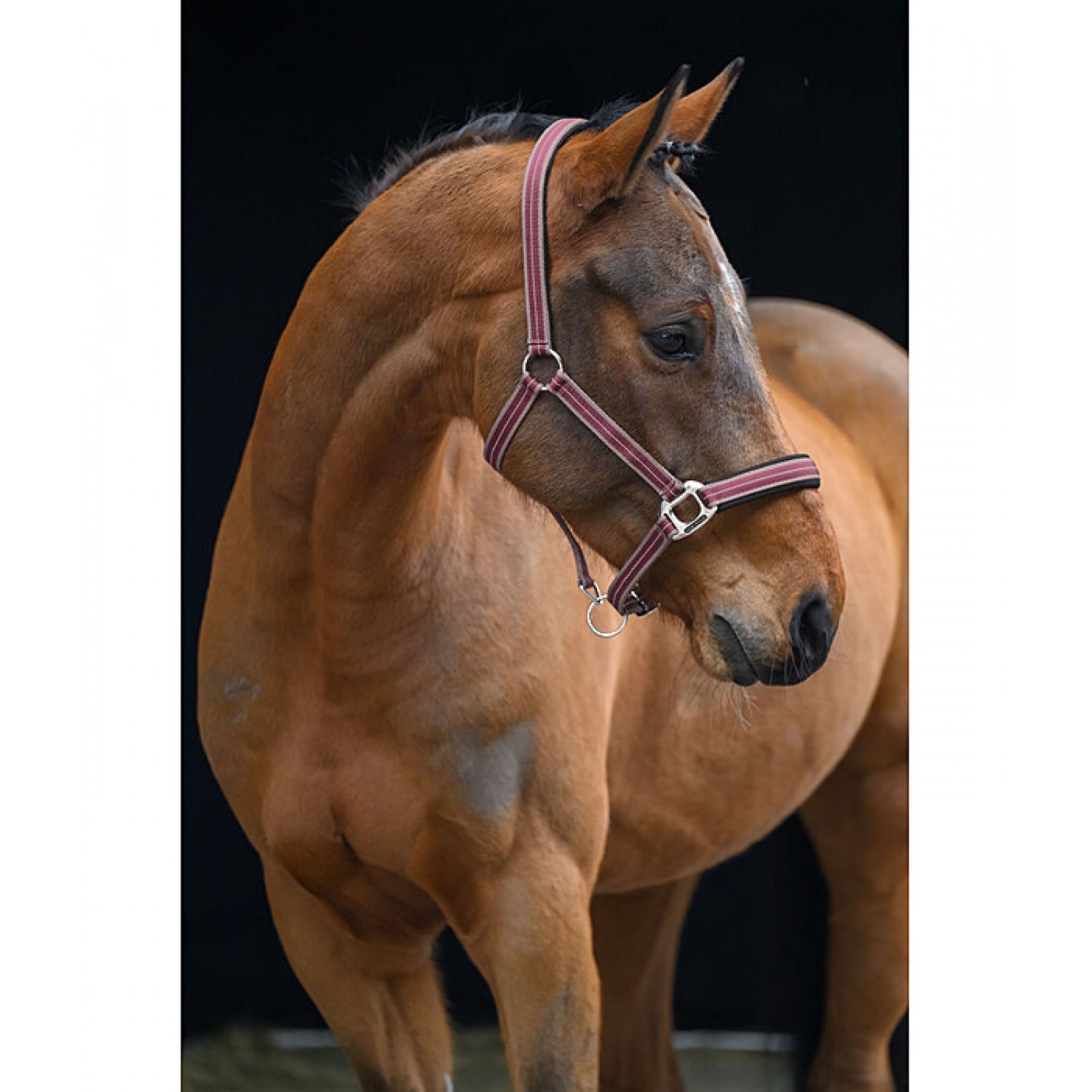 Спортивный полосатый недоуздок с дышащей сетчатой подкладкой на оголовье и носовом ремне. Легко регулируется на оголовье и подбородочных ремнях. Недоуздок изготовлен из 100% полипропилена.