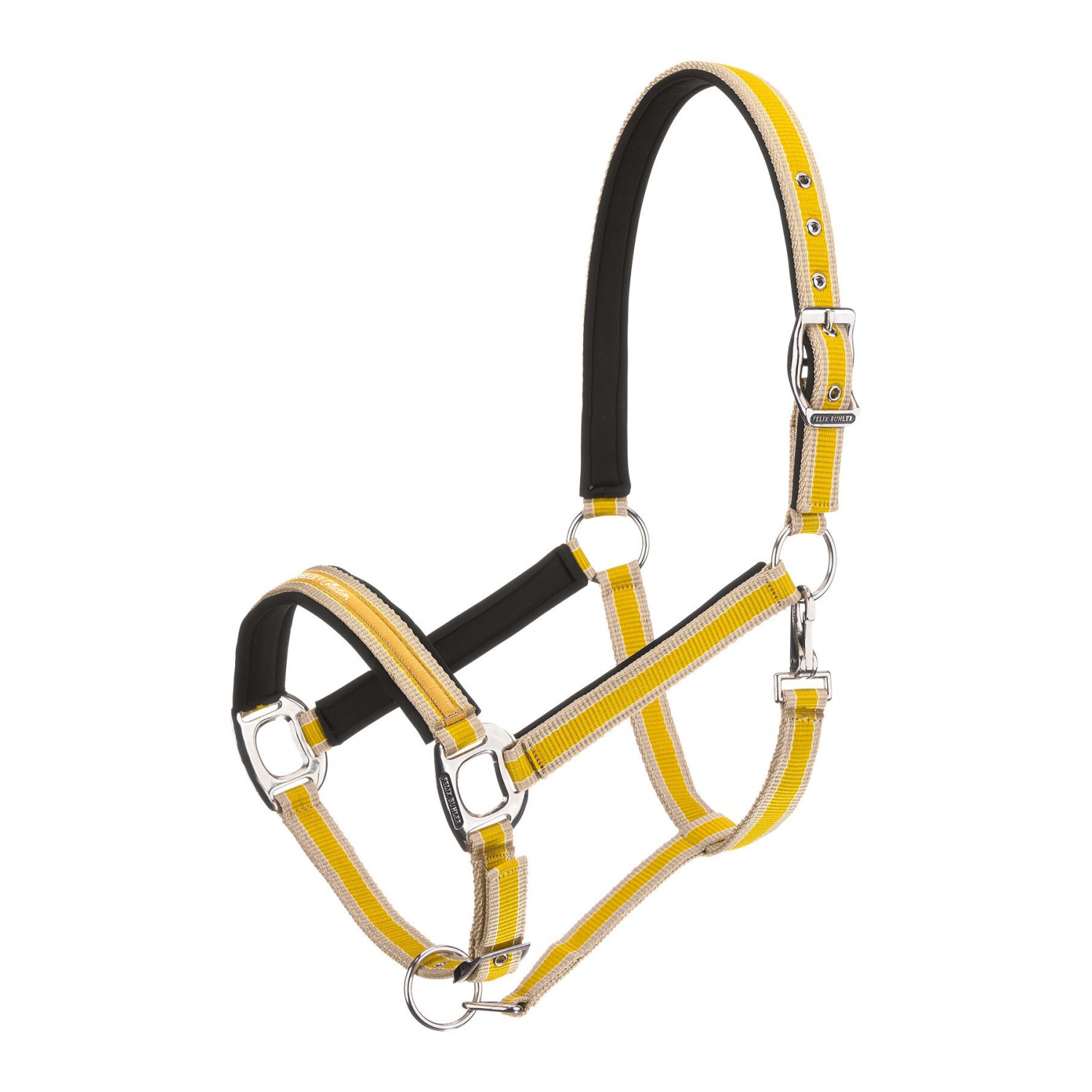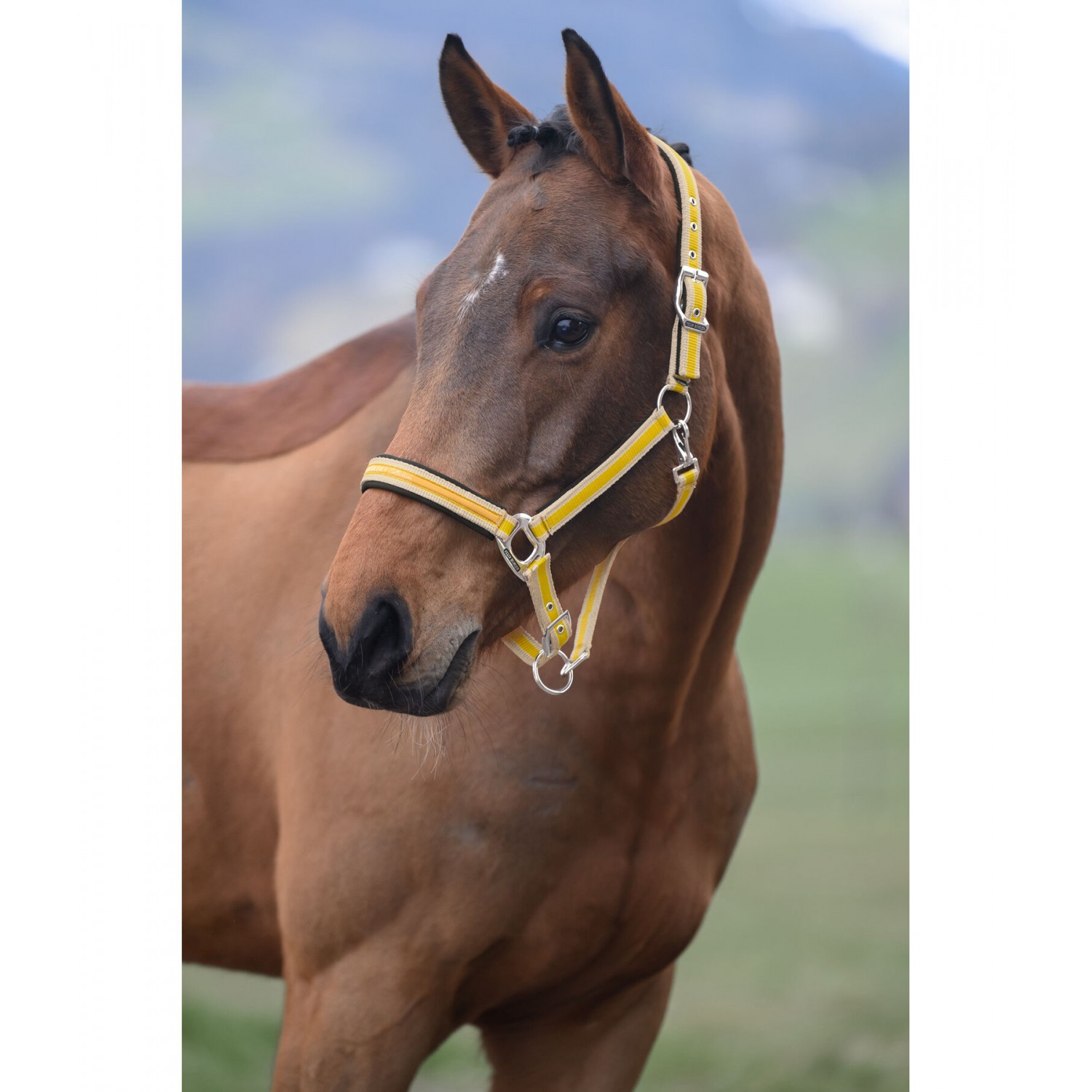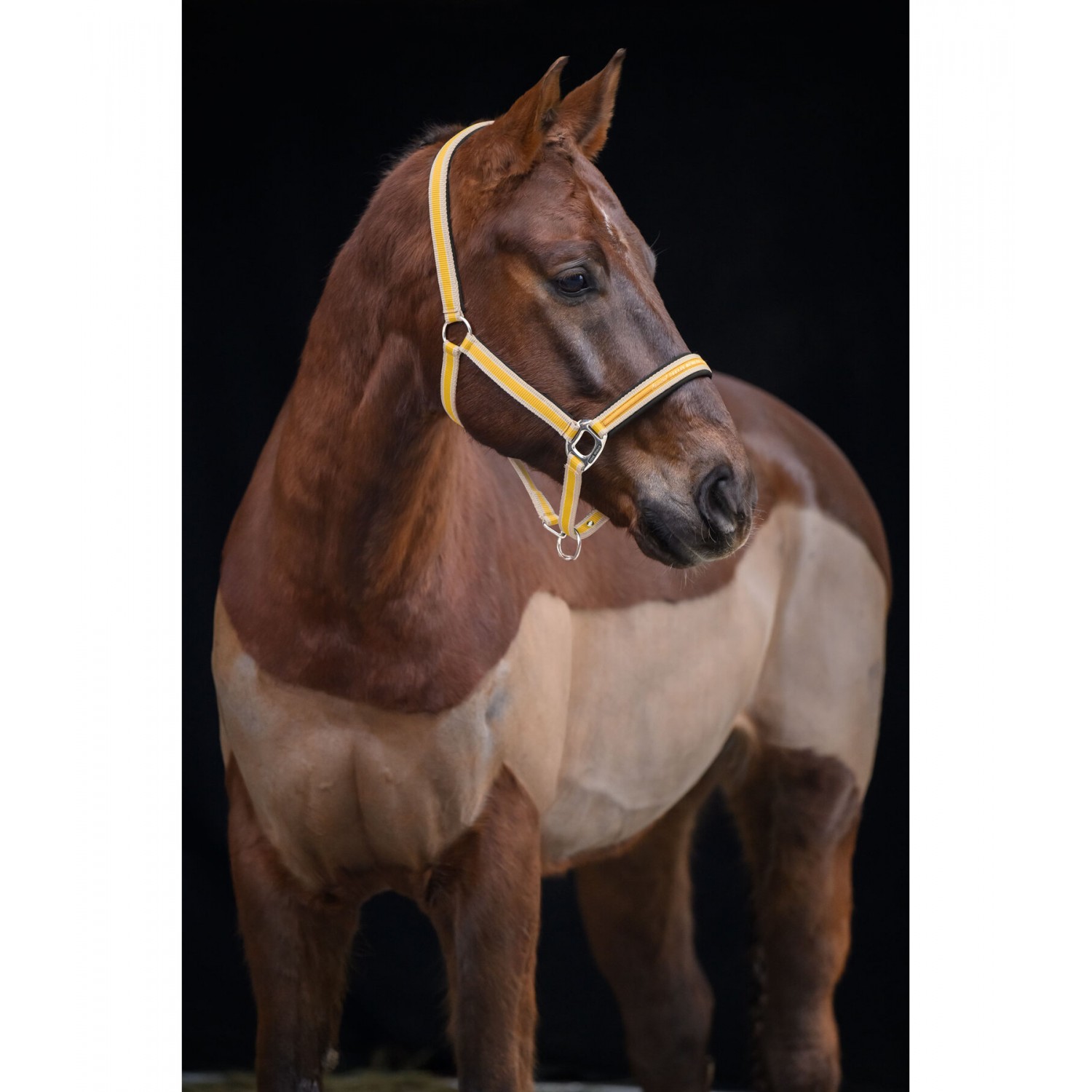 Полосатый недоуздок с красивым тканым узором на носовом ремне. Мягкие подкладки из хлоропреновой резины на оголовье, носовом ремне и щечных ремнях. Легко регулируется на оголовье и подбородочном ремне. Недоуздок изготовлен из 100% полипропилена.