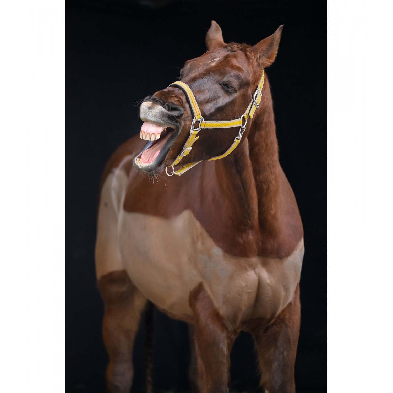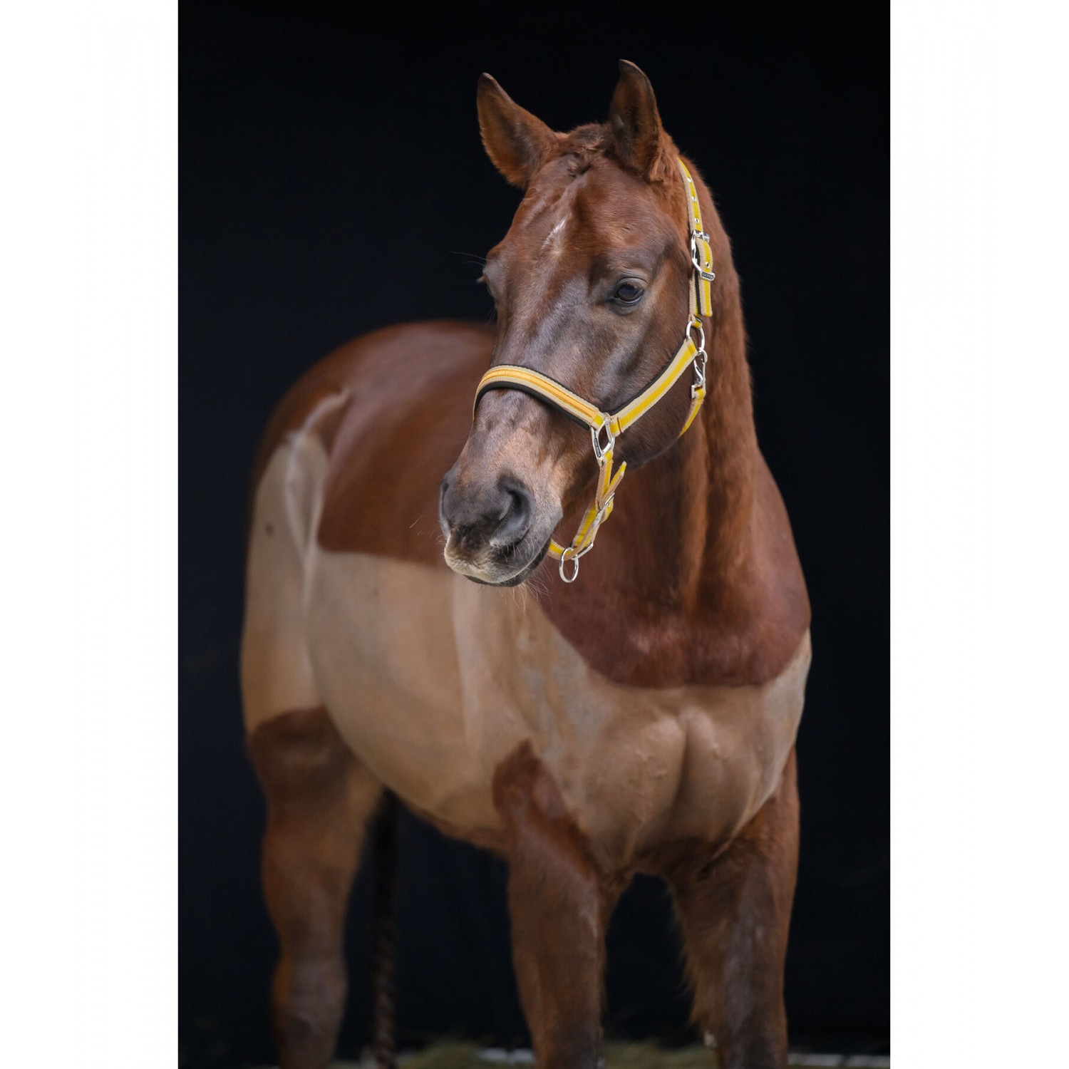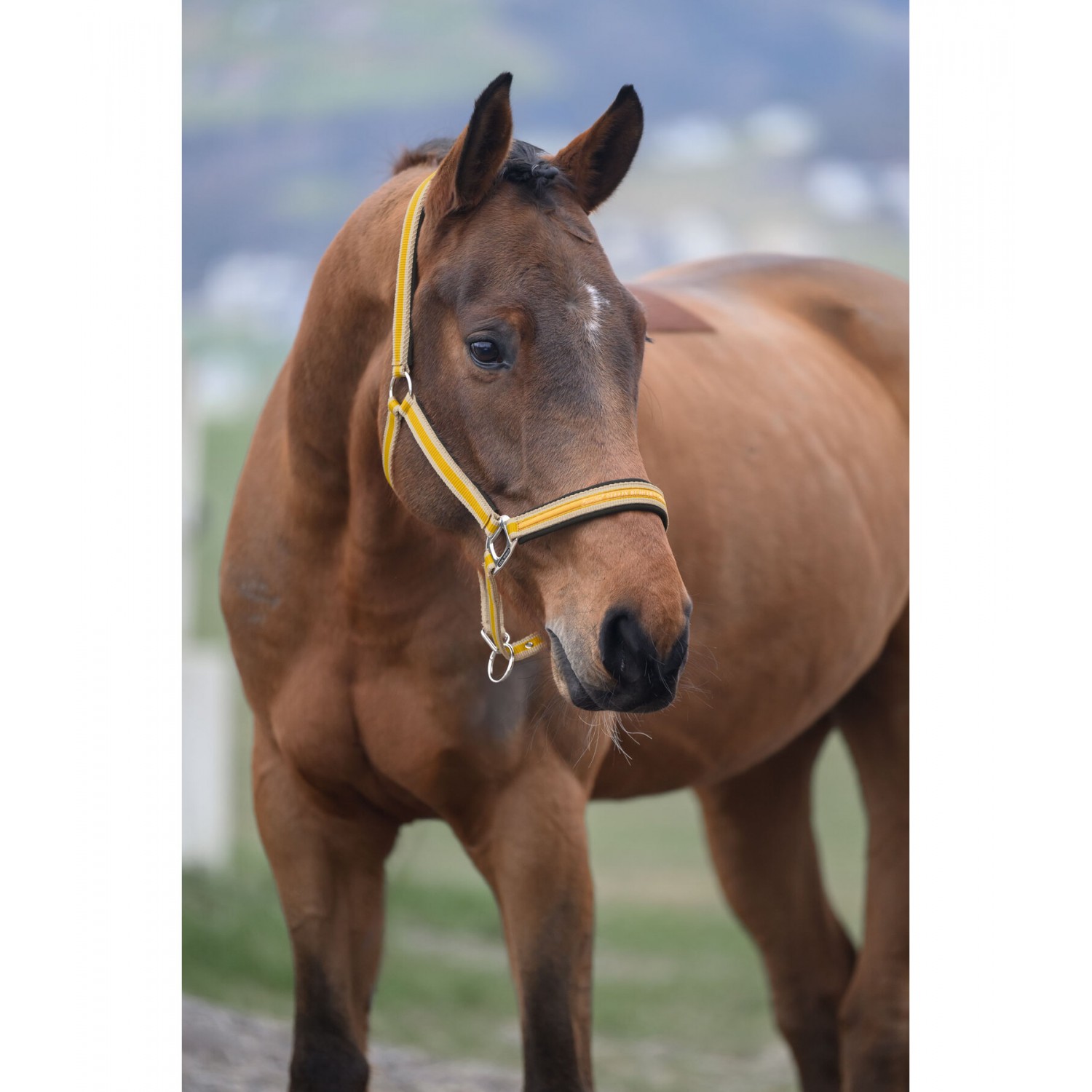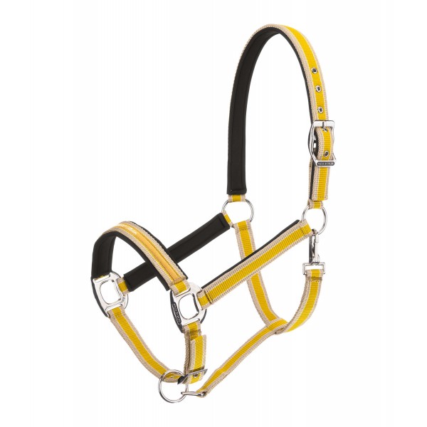 Полосатый недоуздок с красивым тканым узором на носовом ремне. Мягкие подкладки из хлоропреновой резины на оголовье, носовом ремне и щечных ремнях. Легко регулируется на оголовье и подбородочном ремне. Недоуздок изготовлен из 100% полипропилена.
