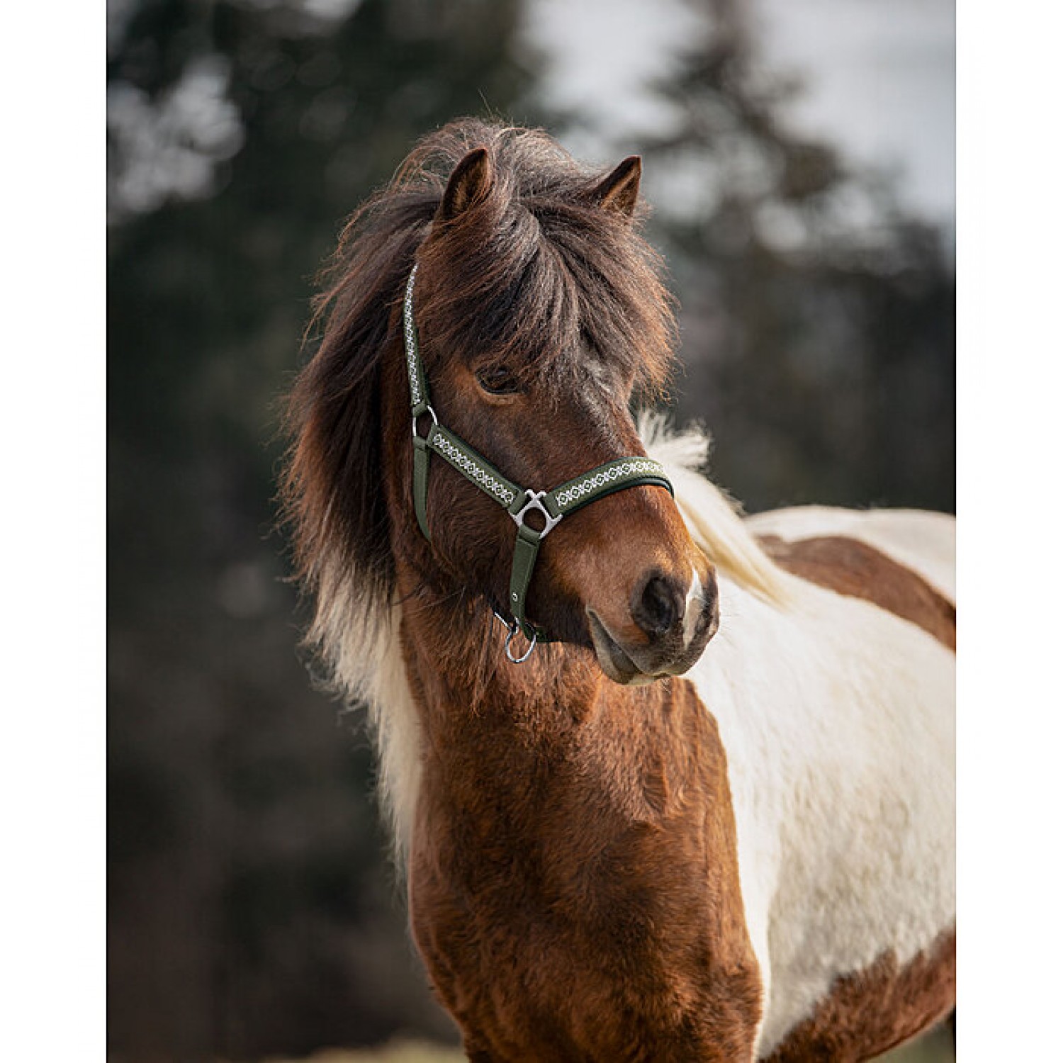 Недоуздок с нордическим рисунком. Мягкие накладки на носу, щеках и затылке. Размер регулируется на шее и подбородочном ремне. Недоуздок 100% полипропилен, набивка 100% полиэстер.