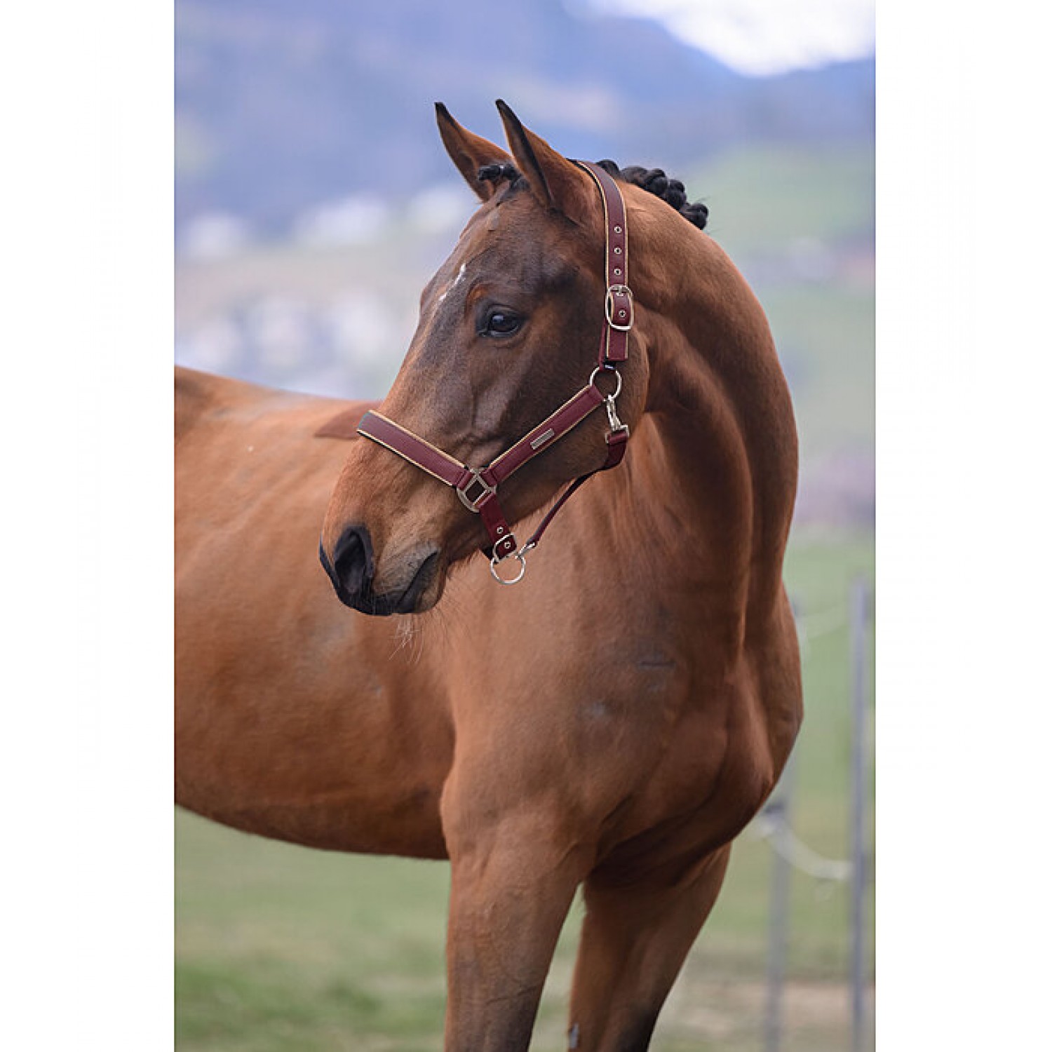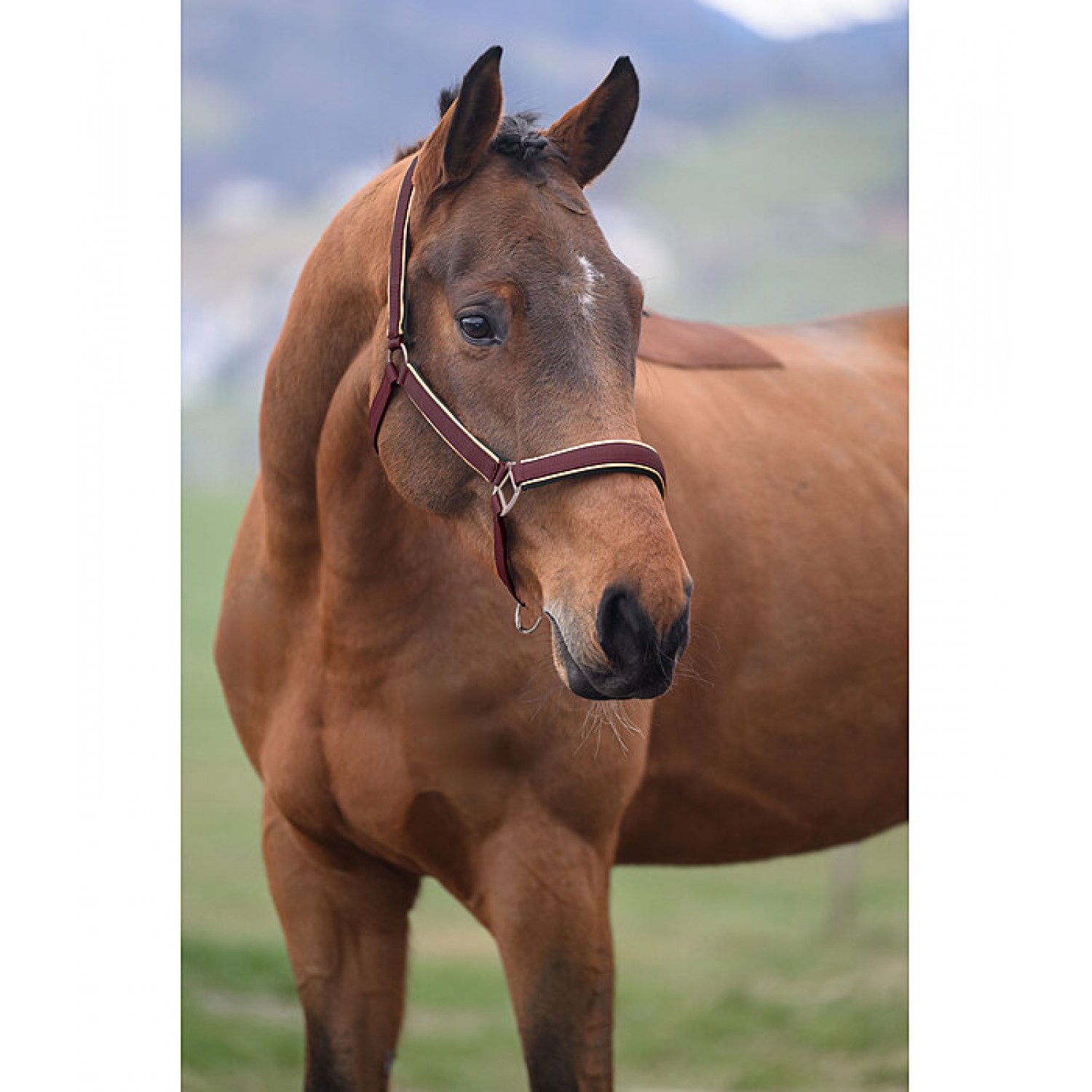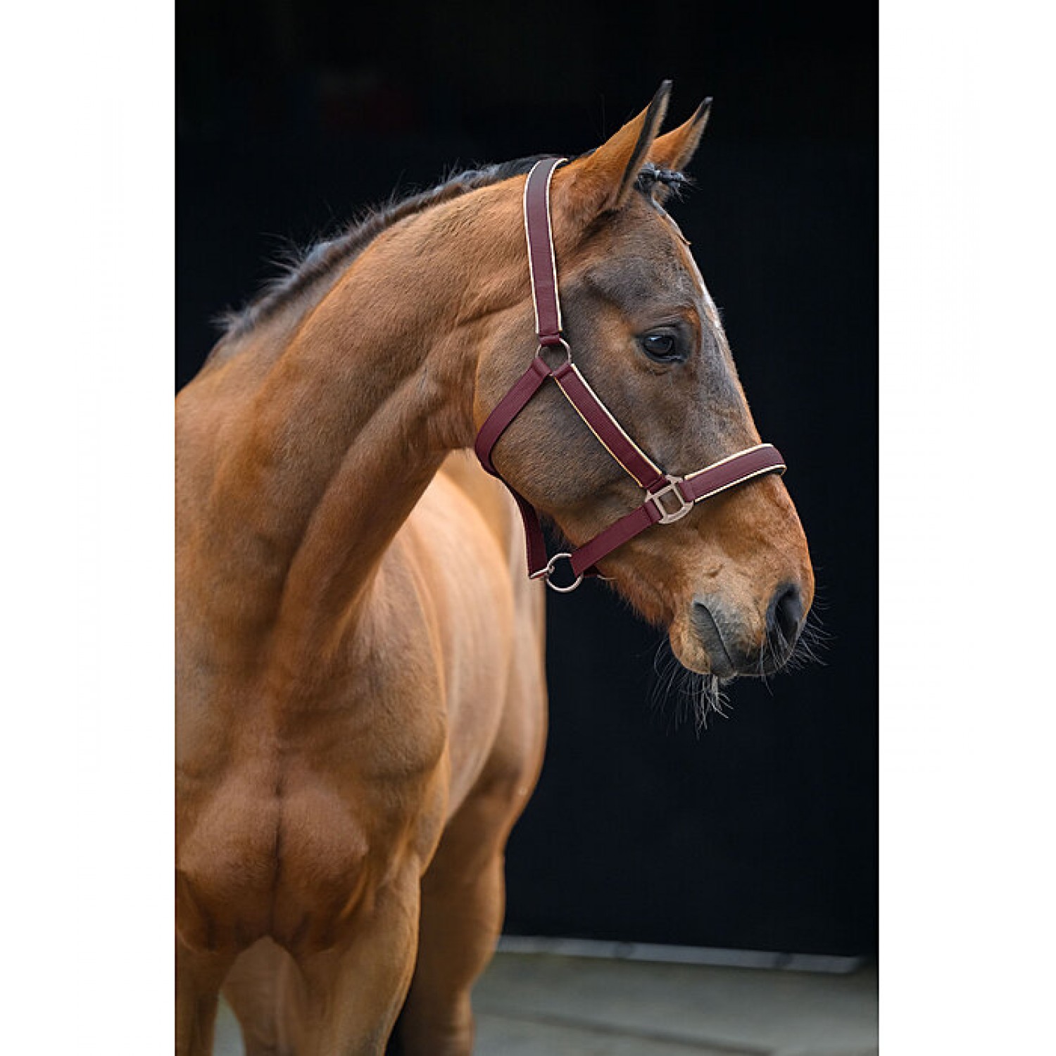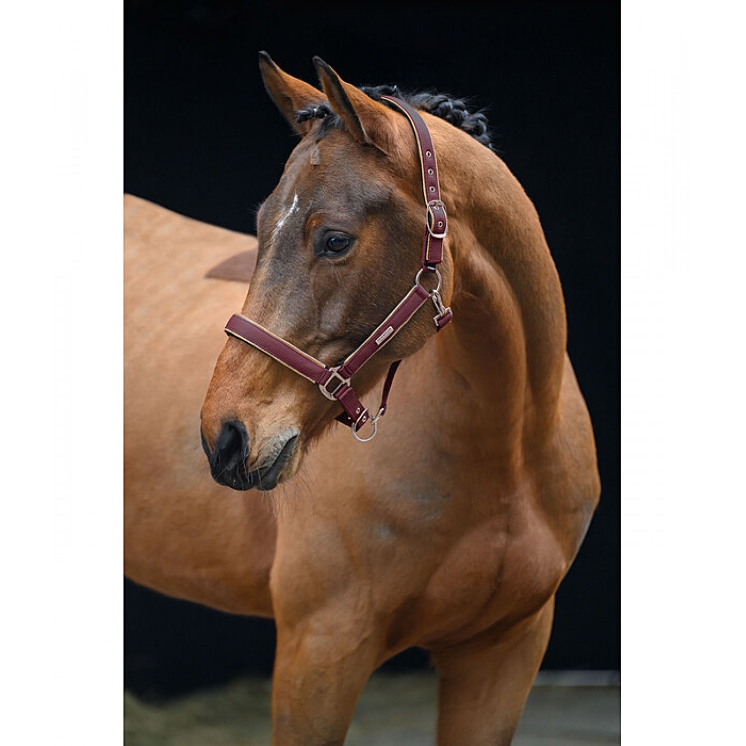 Стильный недоуздок с блестящей окантовкой и фурнитурой в тон. Мягкие подкладки из хлоропреновой резины на оголовье, носовом ремне и щечных накладках обеспечивают комфорт при ношении. Металлическая пластина с гравировкой логотипа на щечной накладке. Легко регулируется на оголовье и подбородочном ремне. 100% полипропилен.