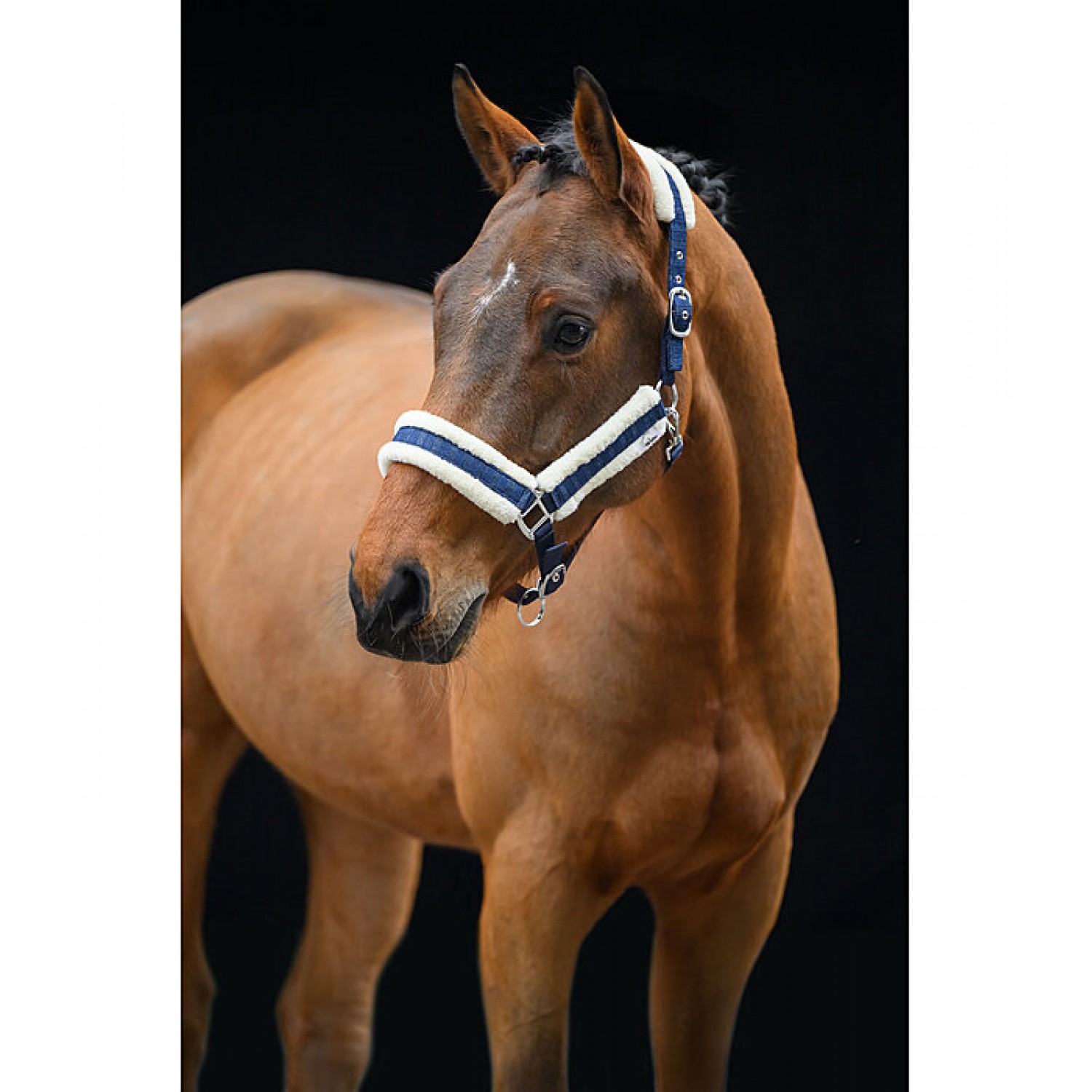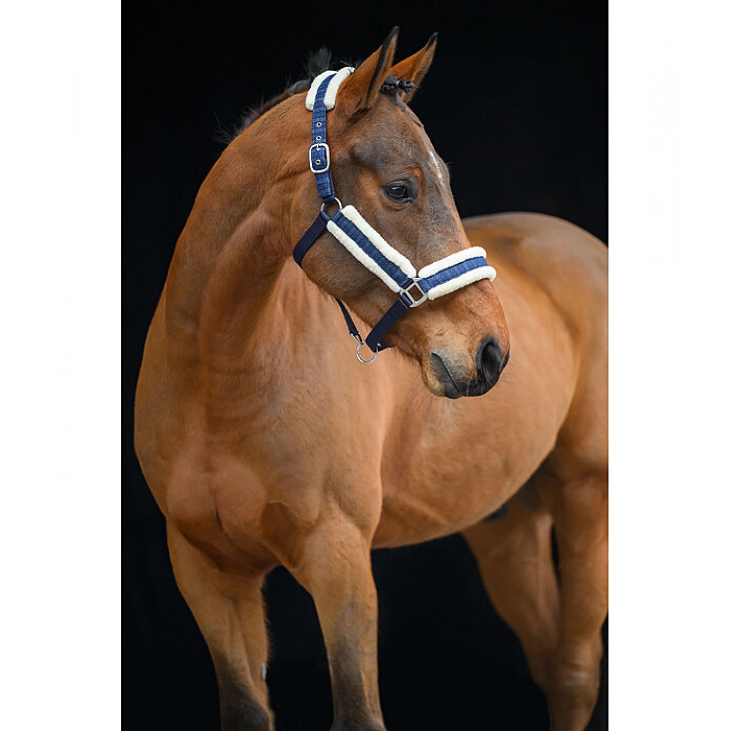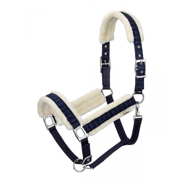 Блестящий недоуздок с мягкой флисовой подкладкой на оголовье, носовом ремне и щечных ремешках. Регулируется с обеих сторон на оголовье и ремешком на подбородке. Фурнитура серебристого цвета. 100% полипропилен.