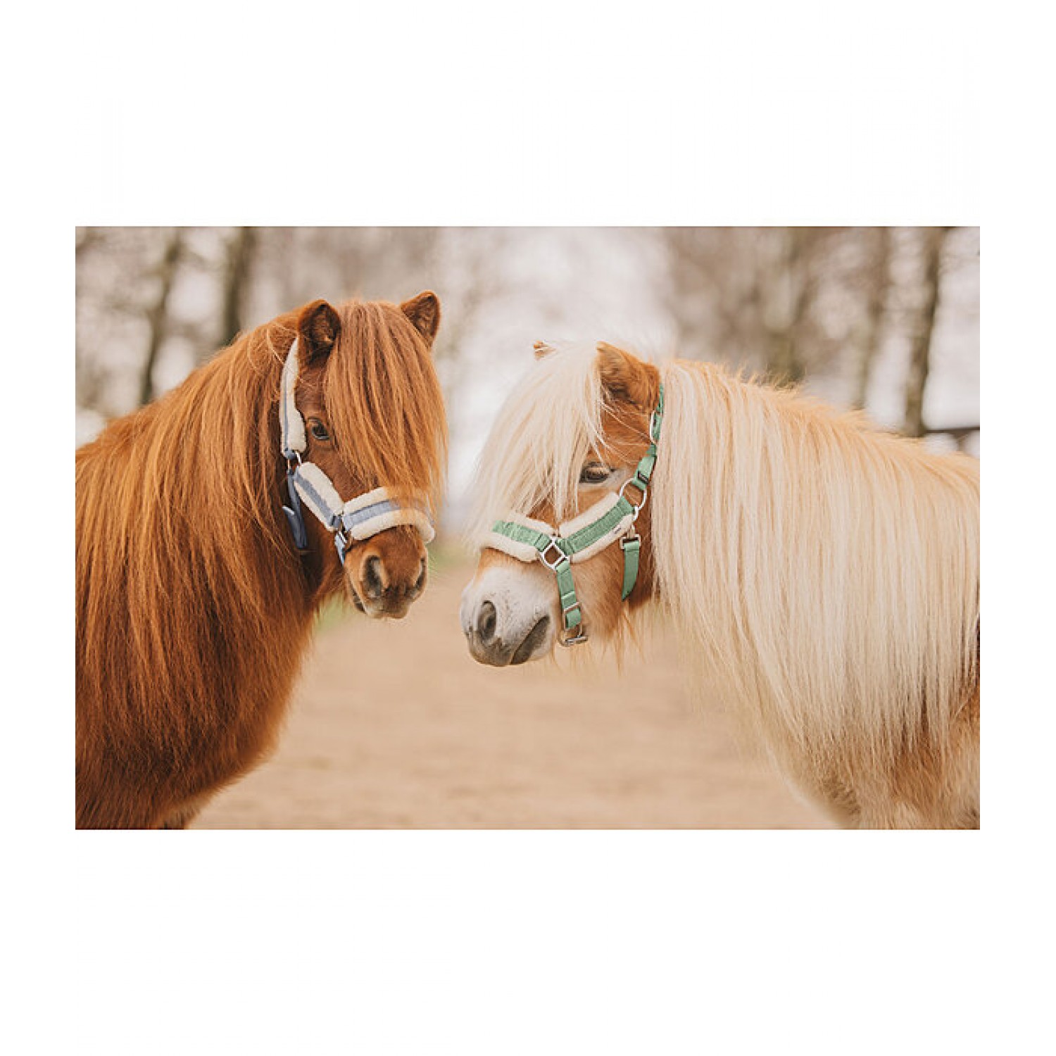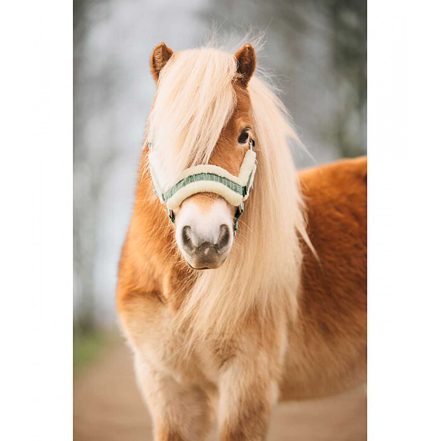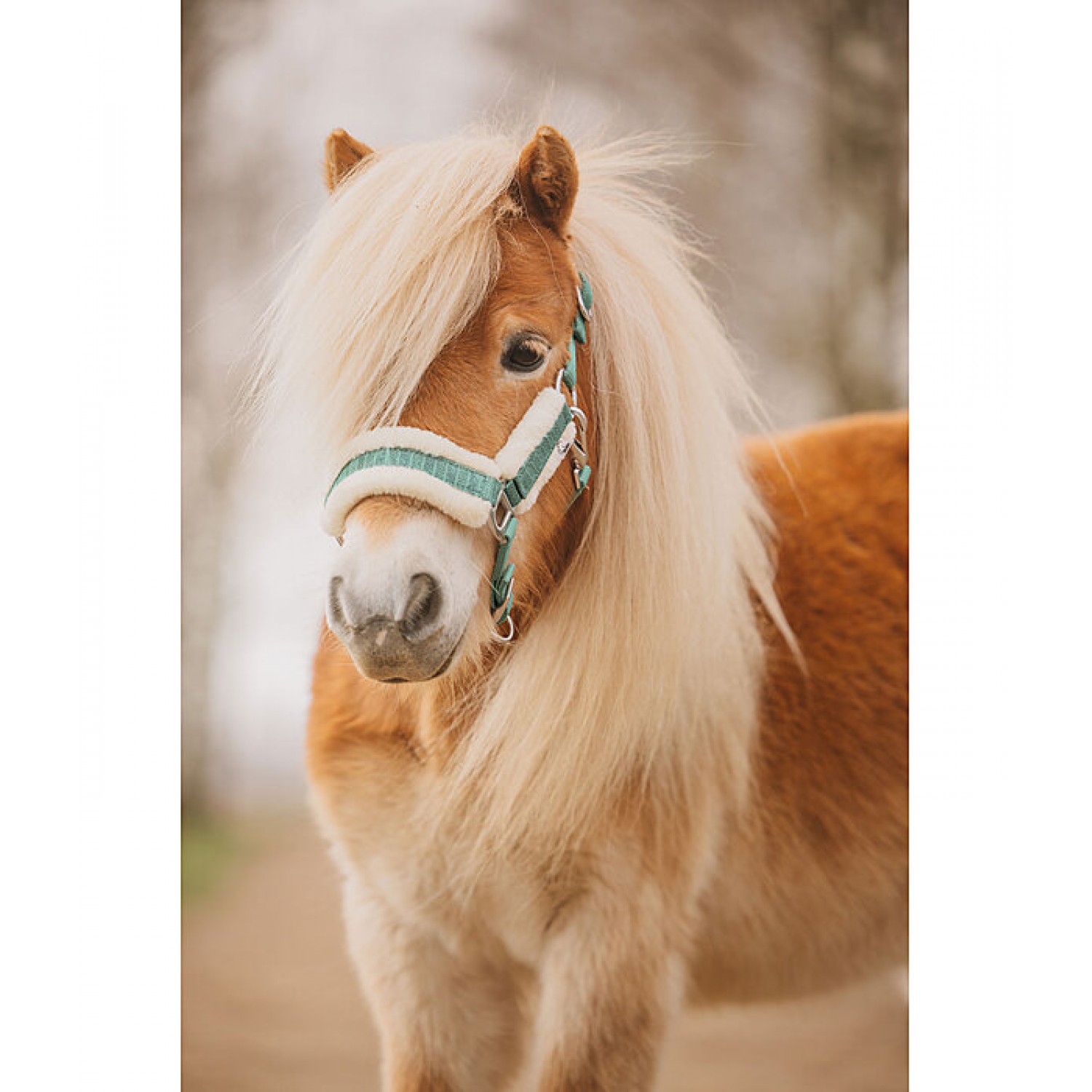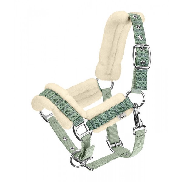 Блестящий недоуздок с мягкой флисовой подкладкой на оголовье, носовом ремне и щечных ремешках. Широкая регулировка размера на оголовье и подбородочном ремне. Фурнитура серебристого цвета. 100% полипропилен.