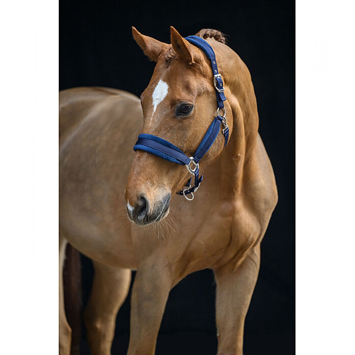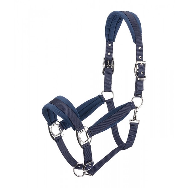 Элегантный недоуздок с мягкой бархатистой подкладкой на оголовье, носовом ремне и щечных ремнях. Регулируется с обеих сторон на оголовье и регулируется ремешком на подбородке. Фурнитура серебристого цвета. 100% полипропилен.