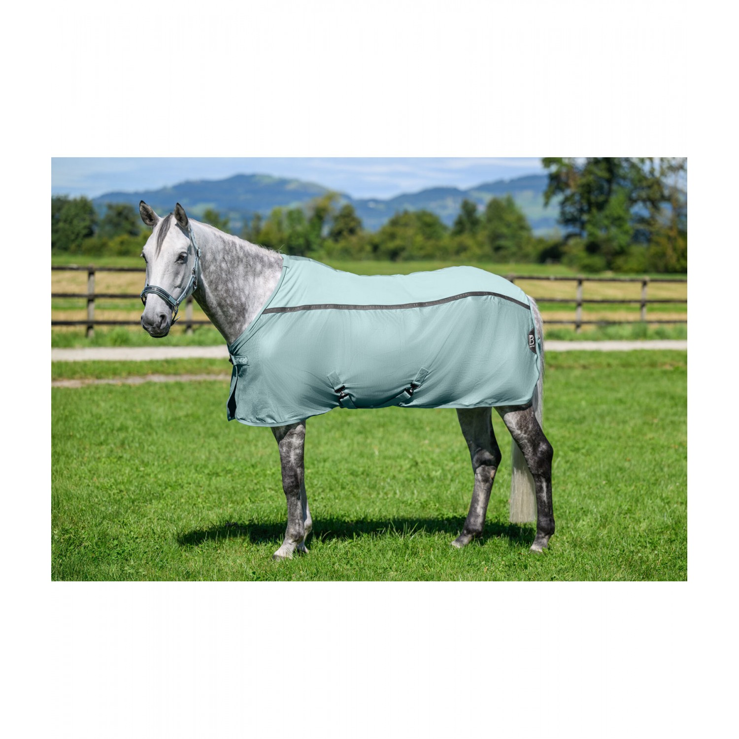 Попона, сочетающая в себе легкий флис, защищающий от сквозняков в области чувствительного позвоночника, и дышащую сетку по бокам. Слегка согревающий флис защищает мышцы спины и позволяет лошади медленно и мягко охлаждаться, даже при сквозняках. Также идеально подходит в качестве дорожной попоны или для использования на соревнованиях. Перекрещивающиеся ремни отстегиваются с обеих сторон. Имеет простую Т-образную застежку на груди и мягкую флисовую подкладку в области холки. Спинка отделана контрастным логотипом коллекции. 100% полиэстер.