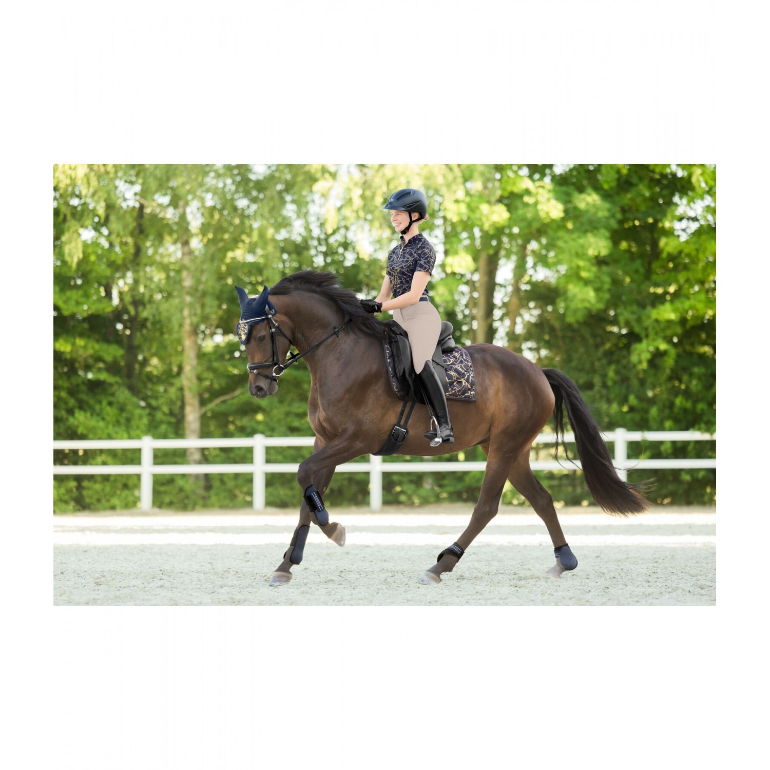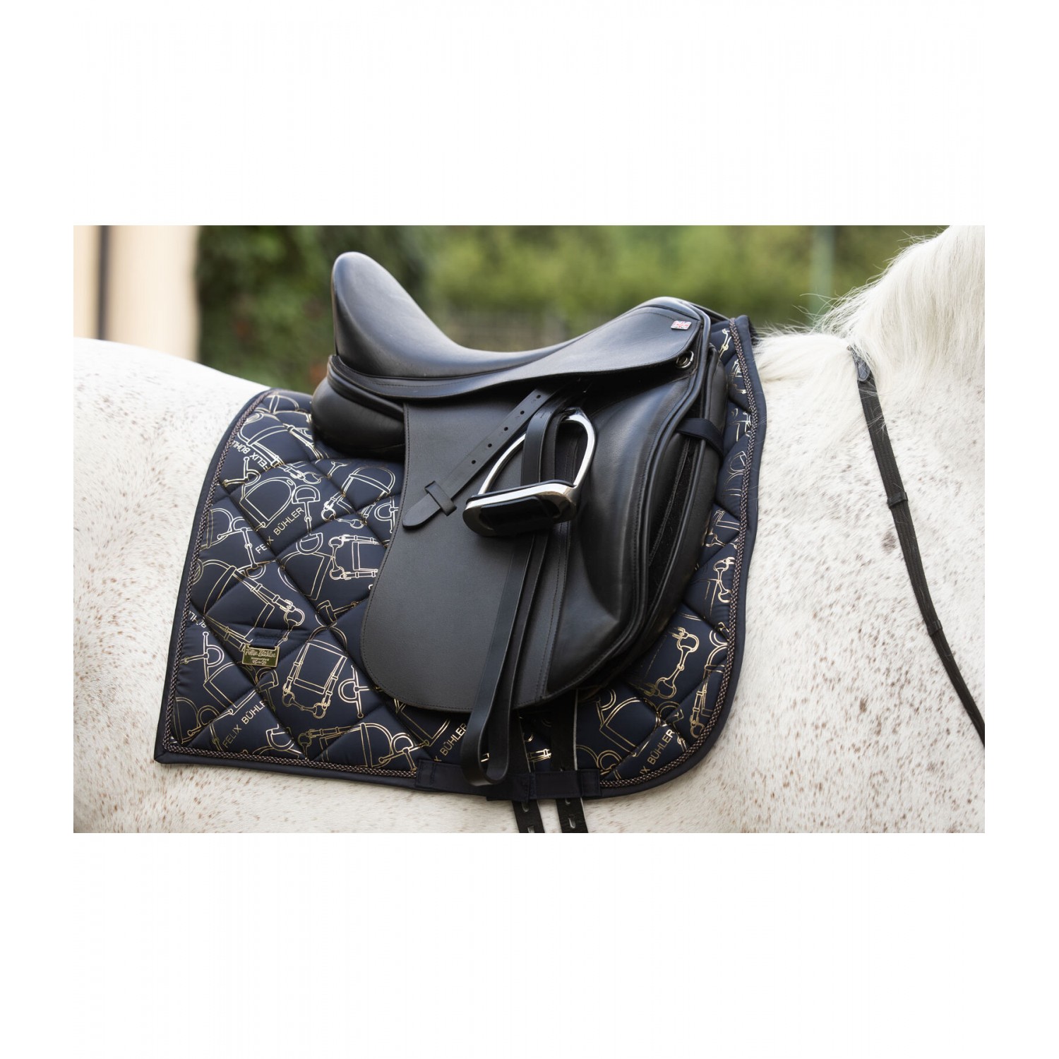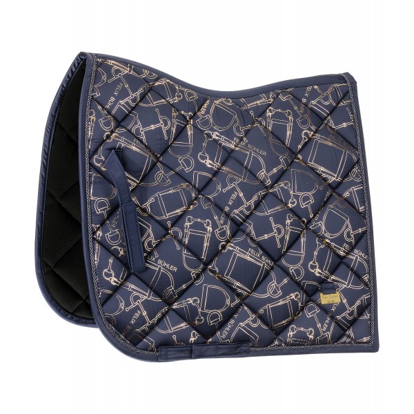 Элегантный, блестящий вальтрап с гладкой внешней поверхностью и металлическим принтом по всей поверхности, имитирующим модный узор трензеля. Декоративная отделка шнуром и металлические логотипы с обеих сторон. Дышащая и влагоотводящая сетчатая подкладка. 100% полиэстер.
