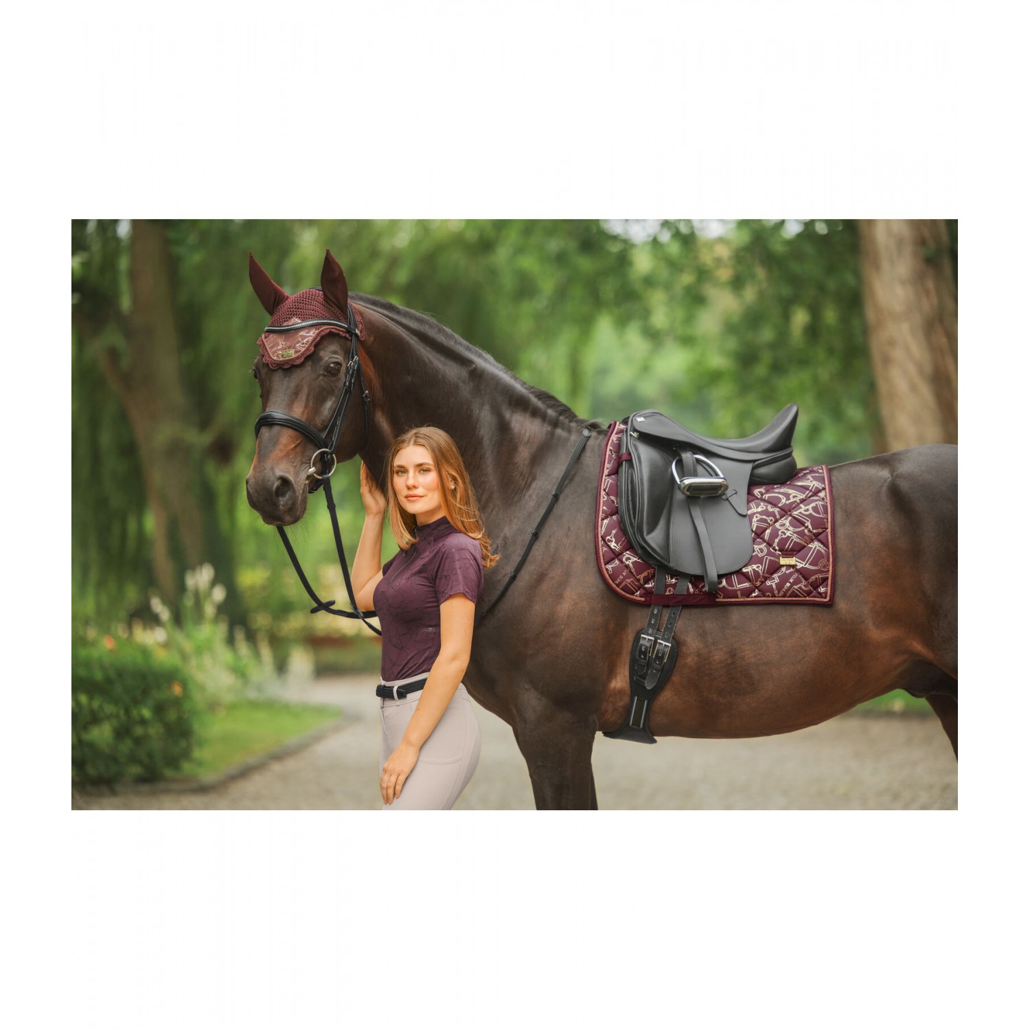Элегантный, блестящий вальтрап с гладкой внешней поверхностью и металлическим принтом по всей поверхности, имитирующим модный узор трензеля. Декоративная отделка шнуром и металлические логотипы с обеих сторон. Дышащая и влагоотводящая сетчатая подкладка. 100% полиэстер.