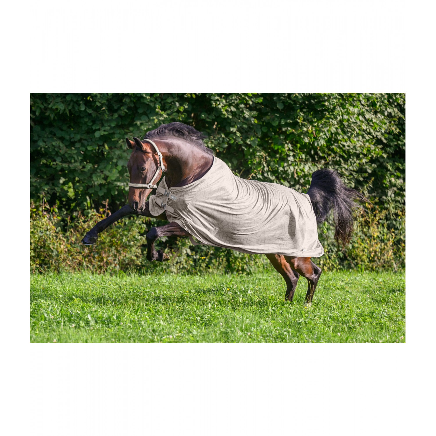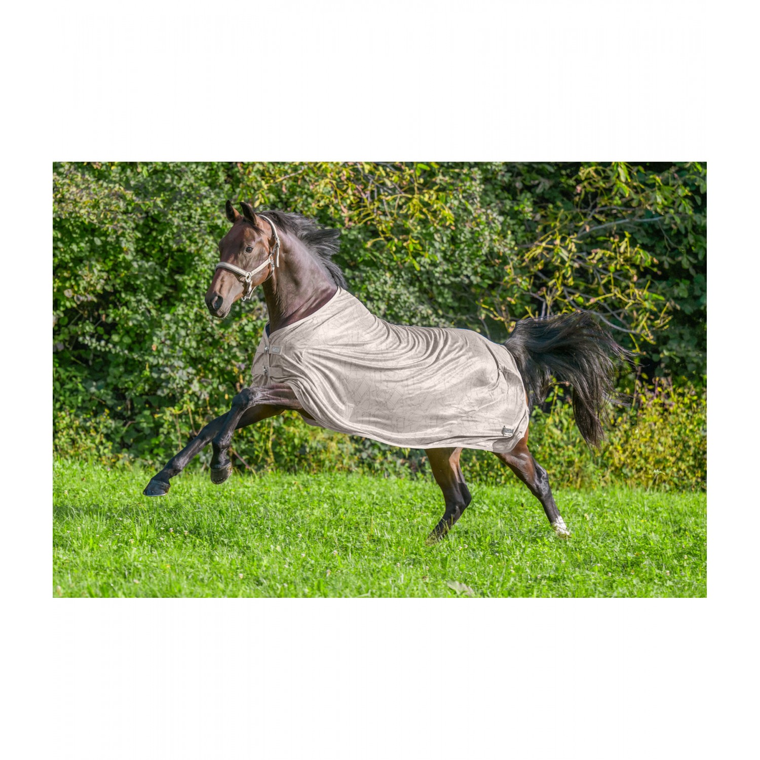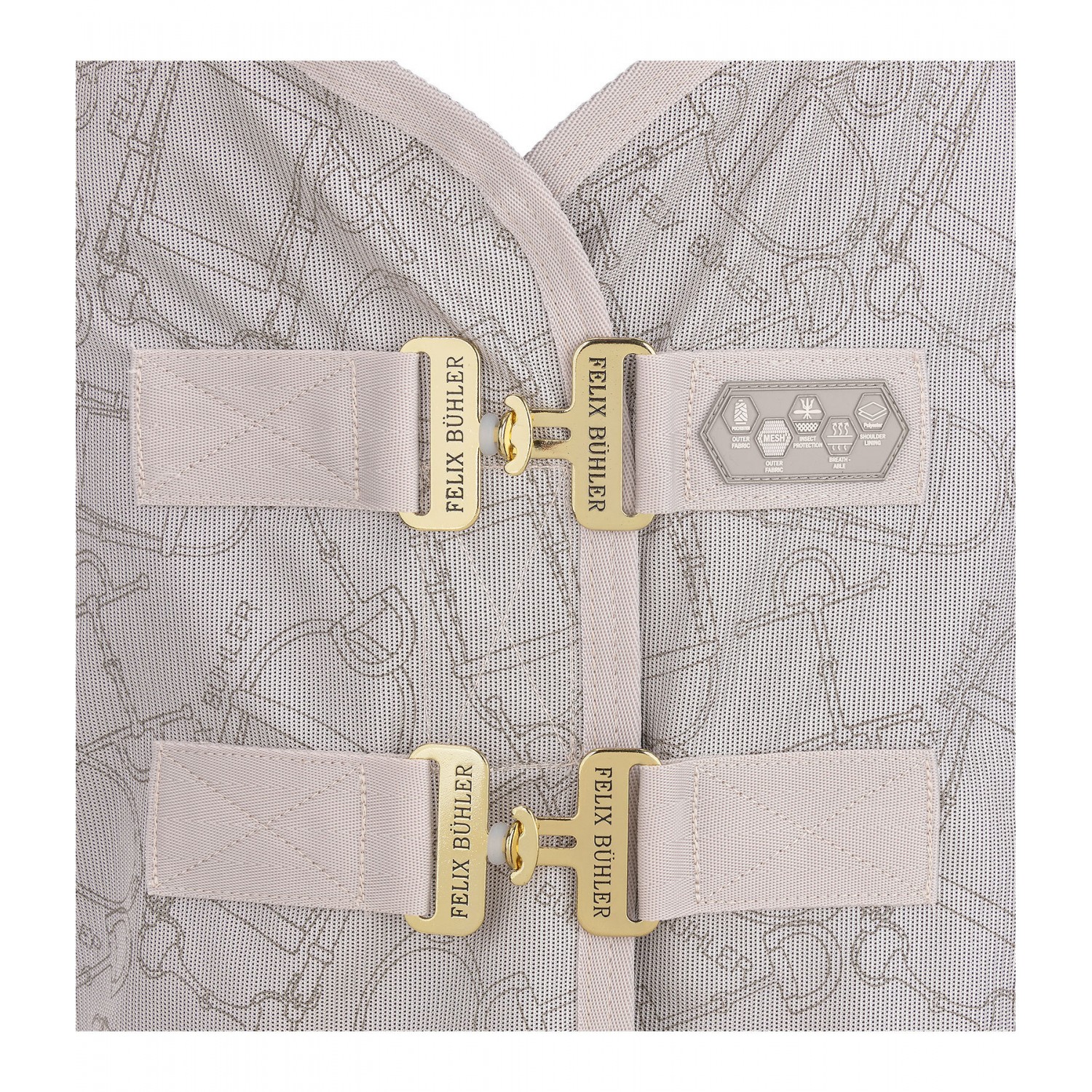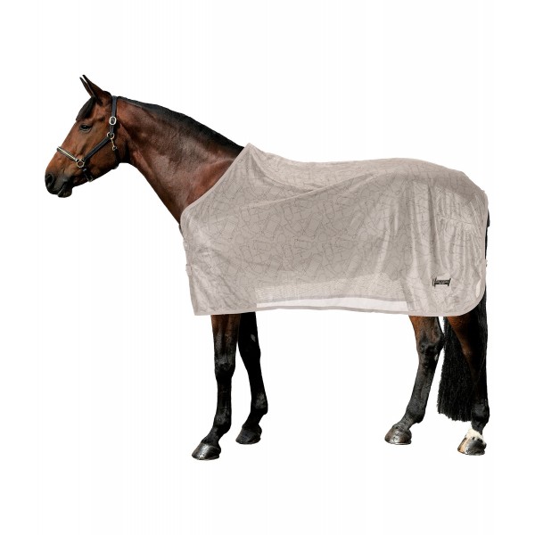 Самая привлекательная попона среди противомоскитных попон! Эта стильная, легкая попона из тонкой сетчатой ткани идеально сочетается с коллекцией Horsefashion и украшена принтом по всей поверхности. Она имеет съемные боковые ремни, двойную Т-образную застежку на груди и регулируемый ремень для хвоста. Плечевая область и клапан хвоста имеют подкладку для защиты шерсти лошади. Особое внимание привлекает золотистая металлическая пластина с левой стороны. 100% полиэстер.