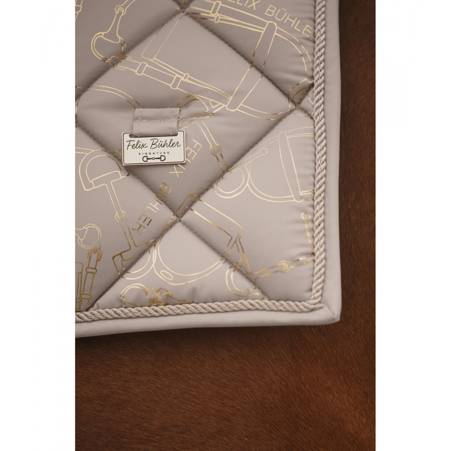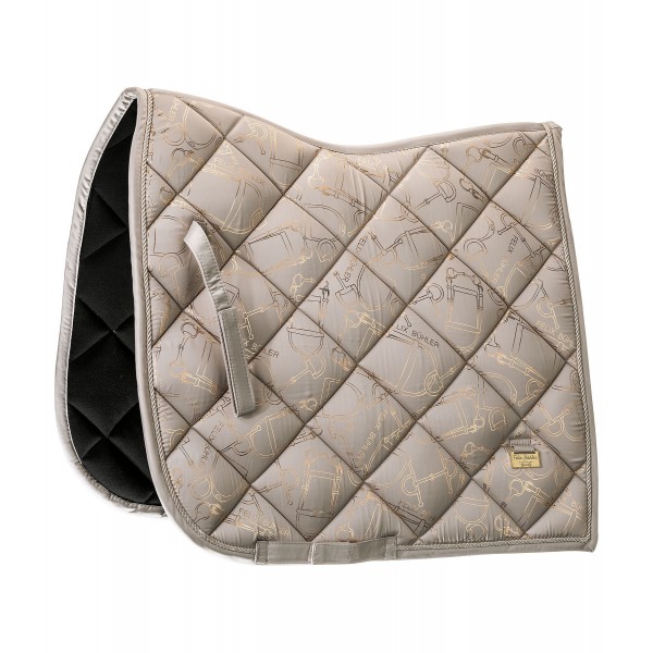 Элегантный, блестящий вальтрап с гладкой внешней поверхностью и металлическим принтом по всей поверхности, имитирующим модный узор трензеля. Декоративная отделка шнуром и металлические логотипы с обеих сторон. Дышащая и влагоотводящая сетчатая подкладка. 100% полиэстер.