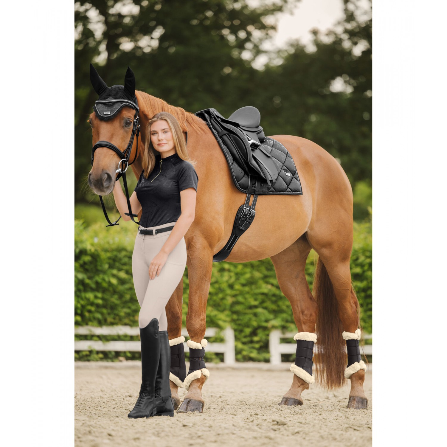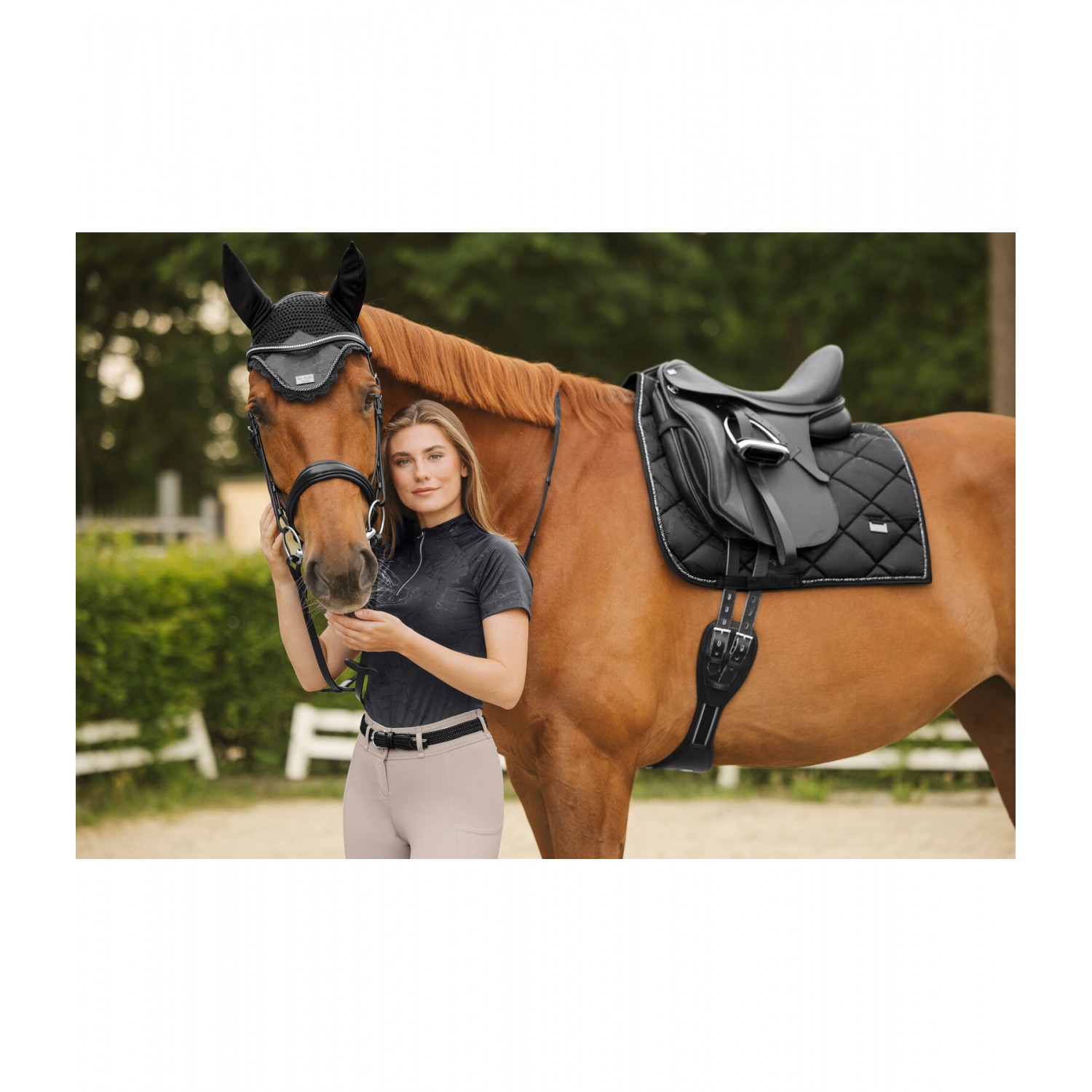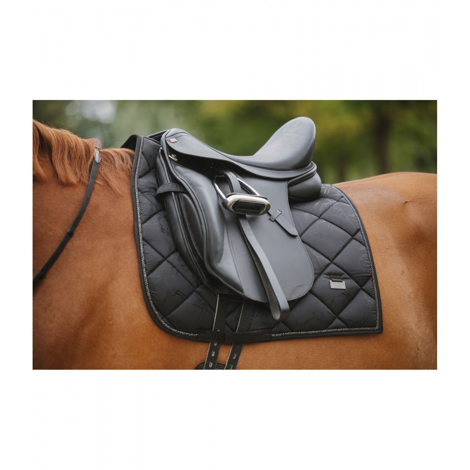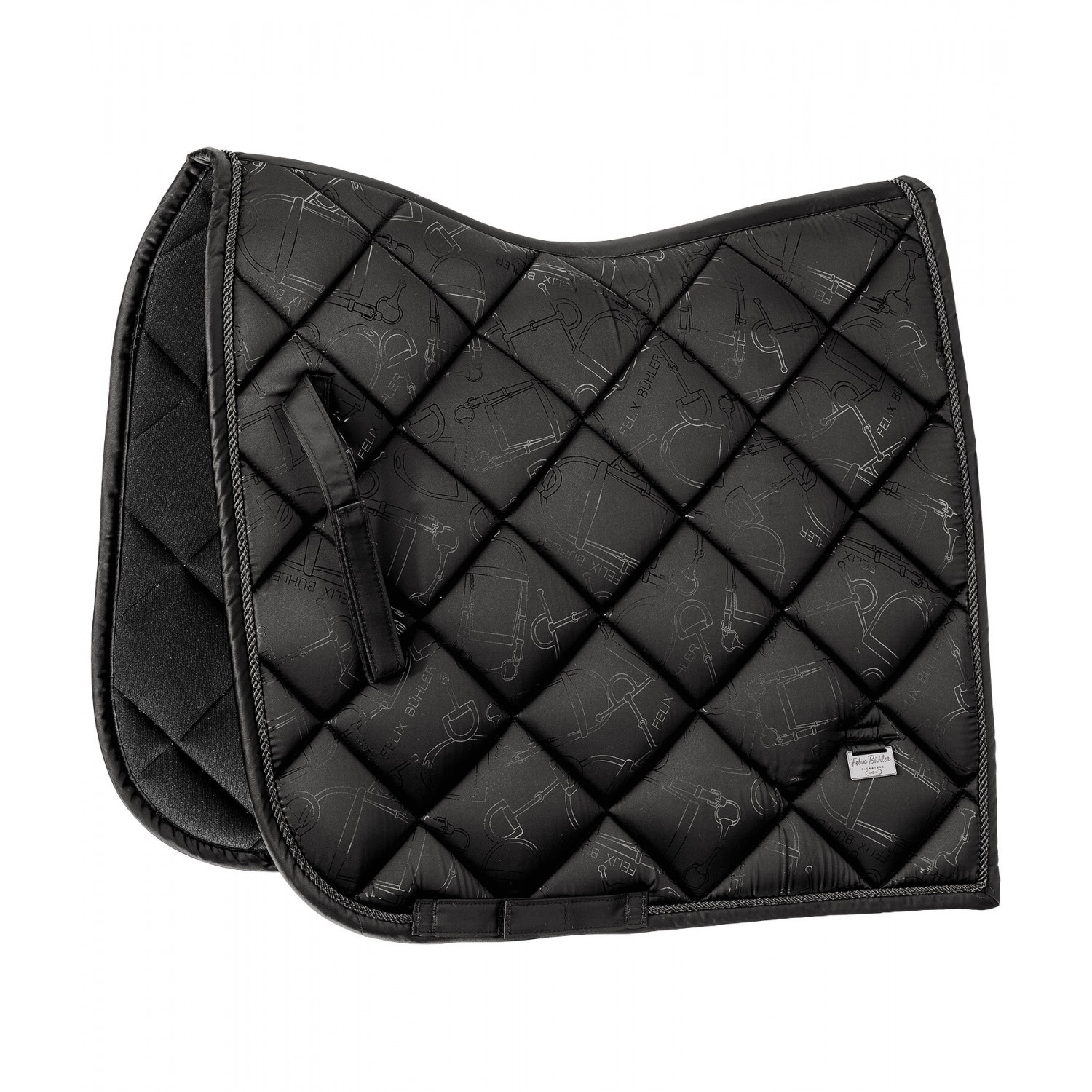 Элегантный, блестящий вальтрап с гладкой внешней поверхностью и металлическим принтом по всей поверхности, имитирующим модный узор трензеля. Декоративная отделка шнуром и металлические логотипы с обеих сторон. Дышащая и влагоотводящая сетчатая подкладка. 100% полиэстер.