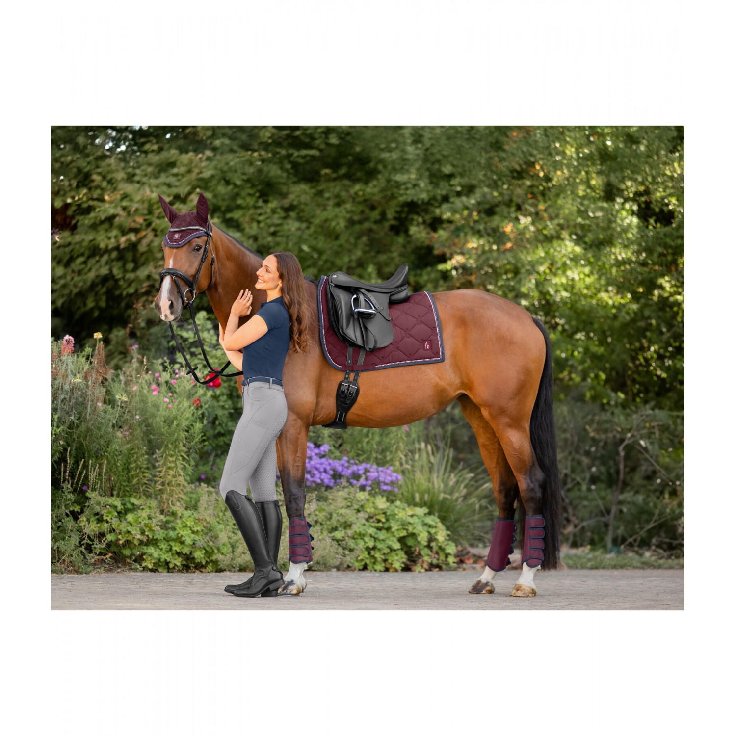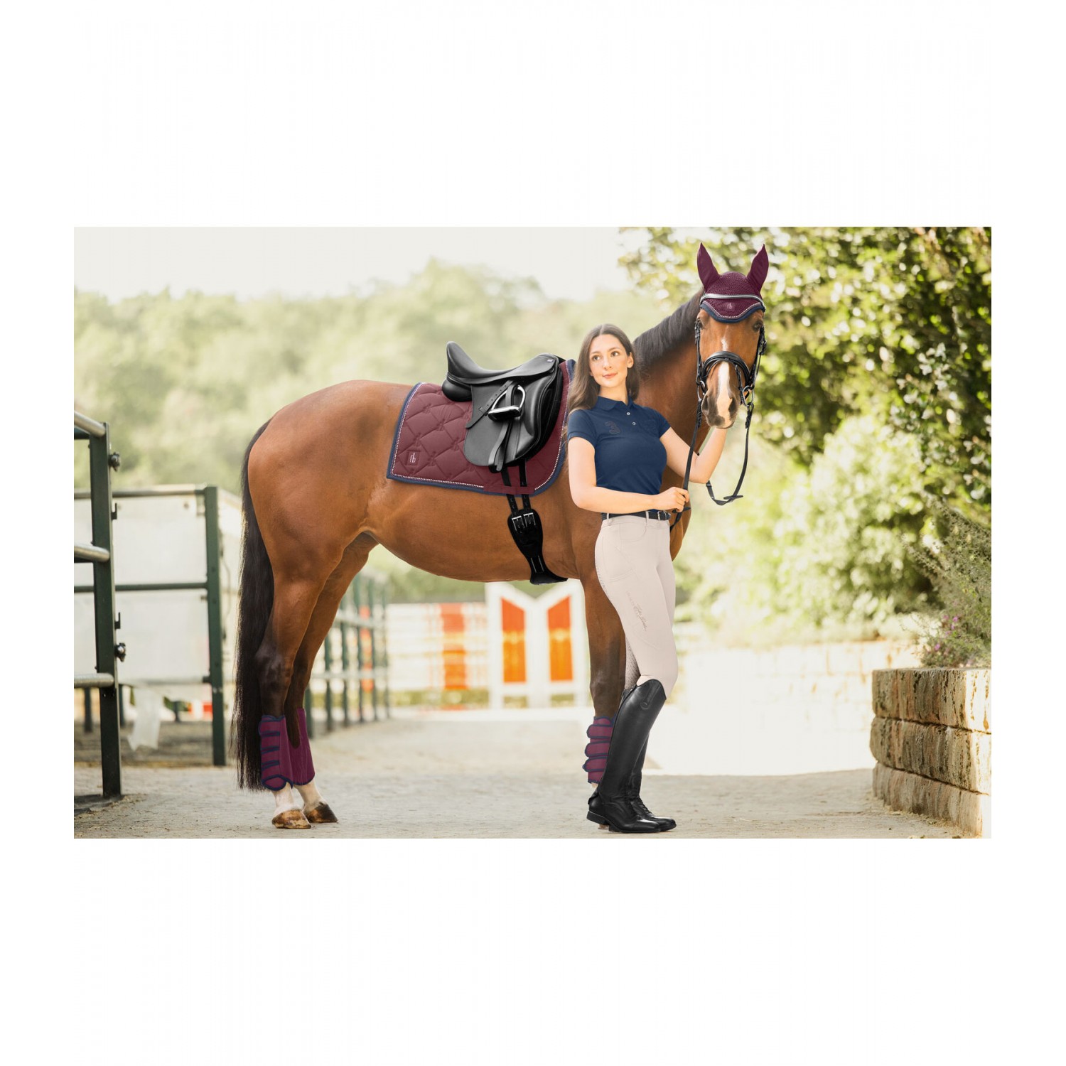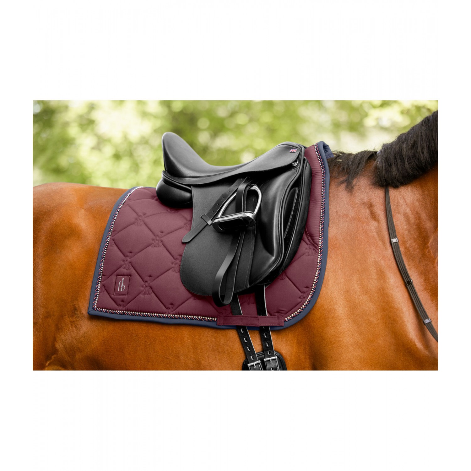 Элегантнаый вальтрап в классическом дизайне с блестящими стразами и декоративным шнуром в двухцветном исполнении. Блестящий логотип. Мягкий передний клапан, идеально удерживающий седло на месте. Нижняя сторона выполнена из влагоотводящей и дышащей сетчатой ткани. 100% полиэстер.
