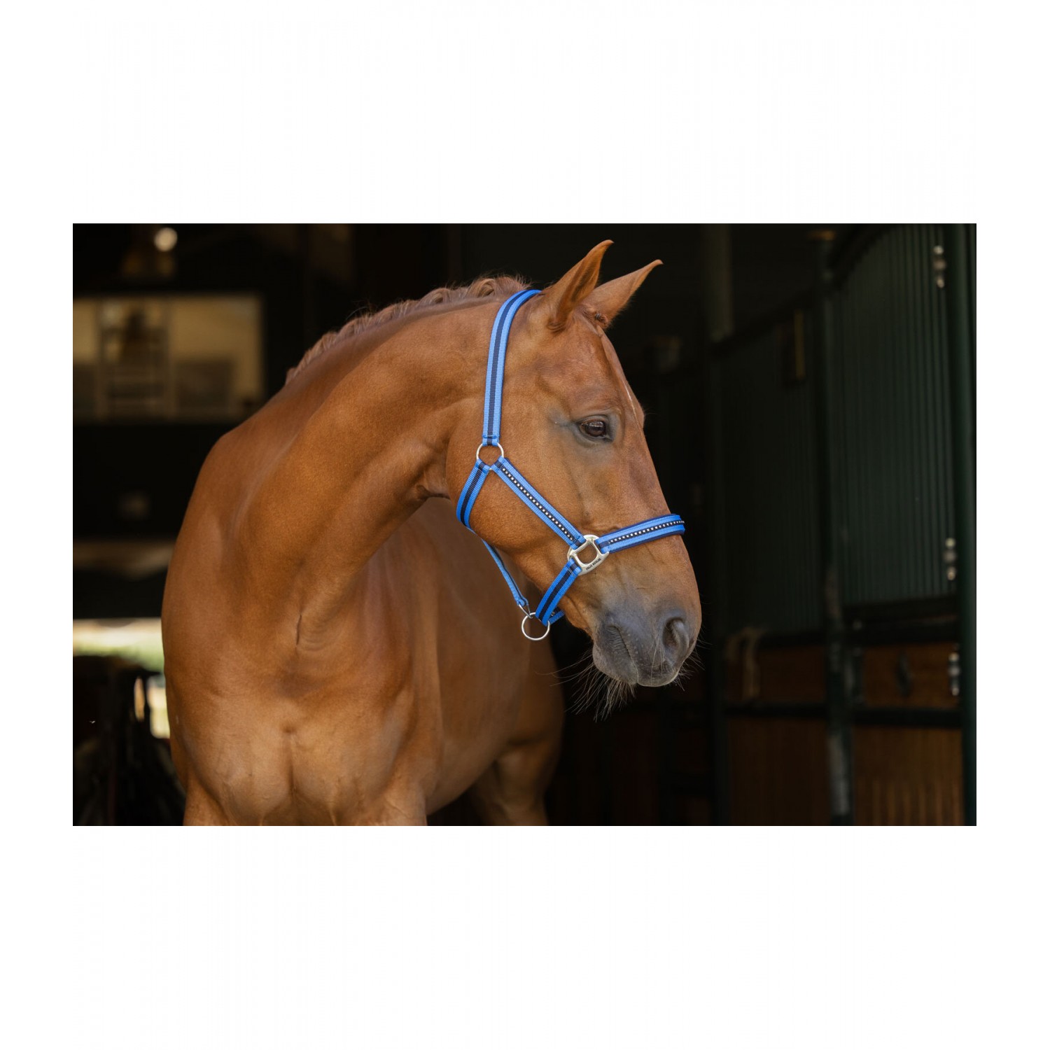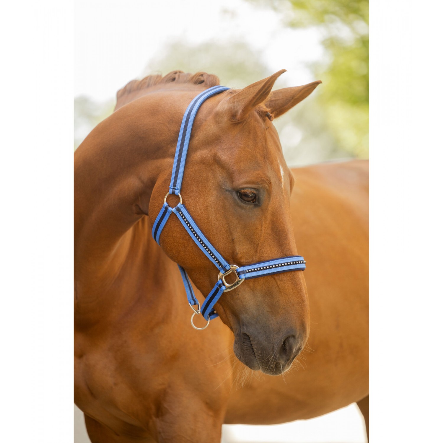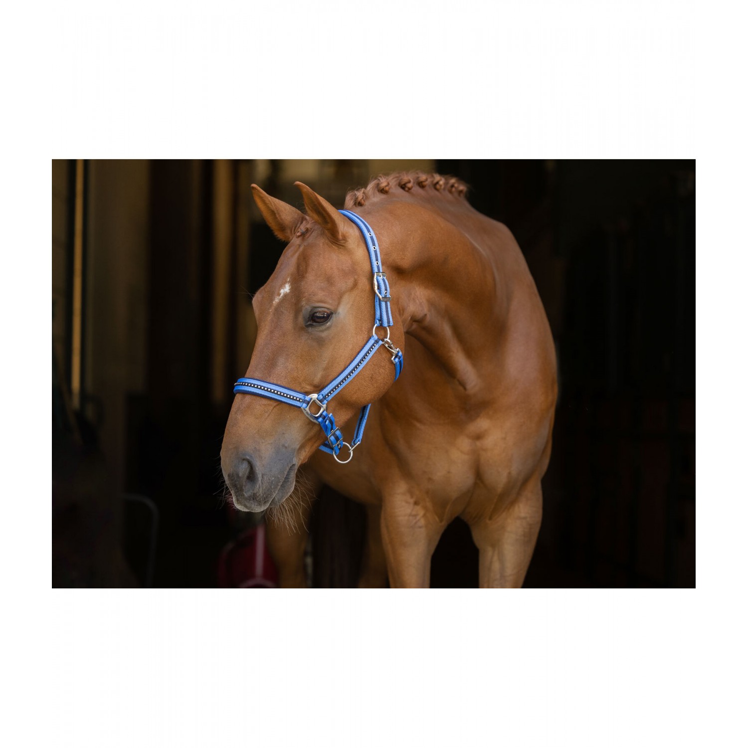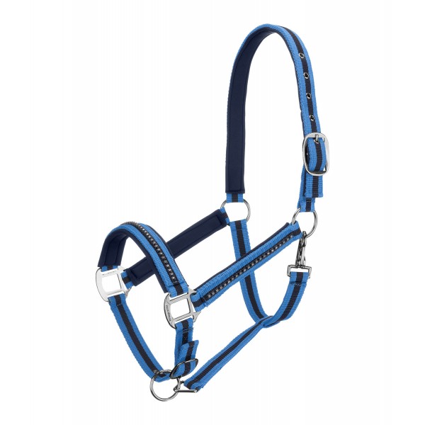 Элегантный двухцветный недоуздок с блестящими стразами на носовом и щечных ремнях. Мягкая подкладка из хлоропреновой резины обеспечивает комфортное ношение на оголовье, щечных ремнях и носовом ремне. Регулируется как на затылке, так и на подбородочном ремне. Имеет удобную застежку-карабин. Фурнитура серебристого цвета. Недоуздка: 100% полипропилен, подкладка: 100% хлоропреновая резина.