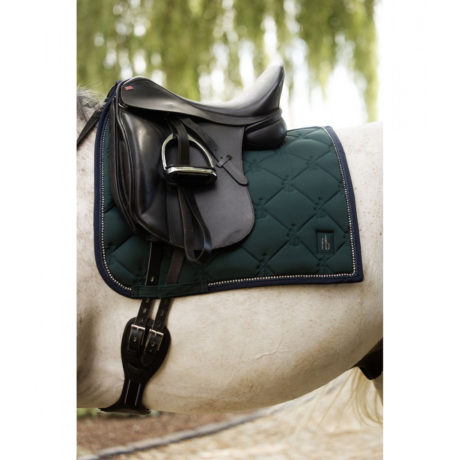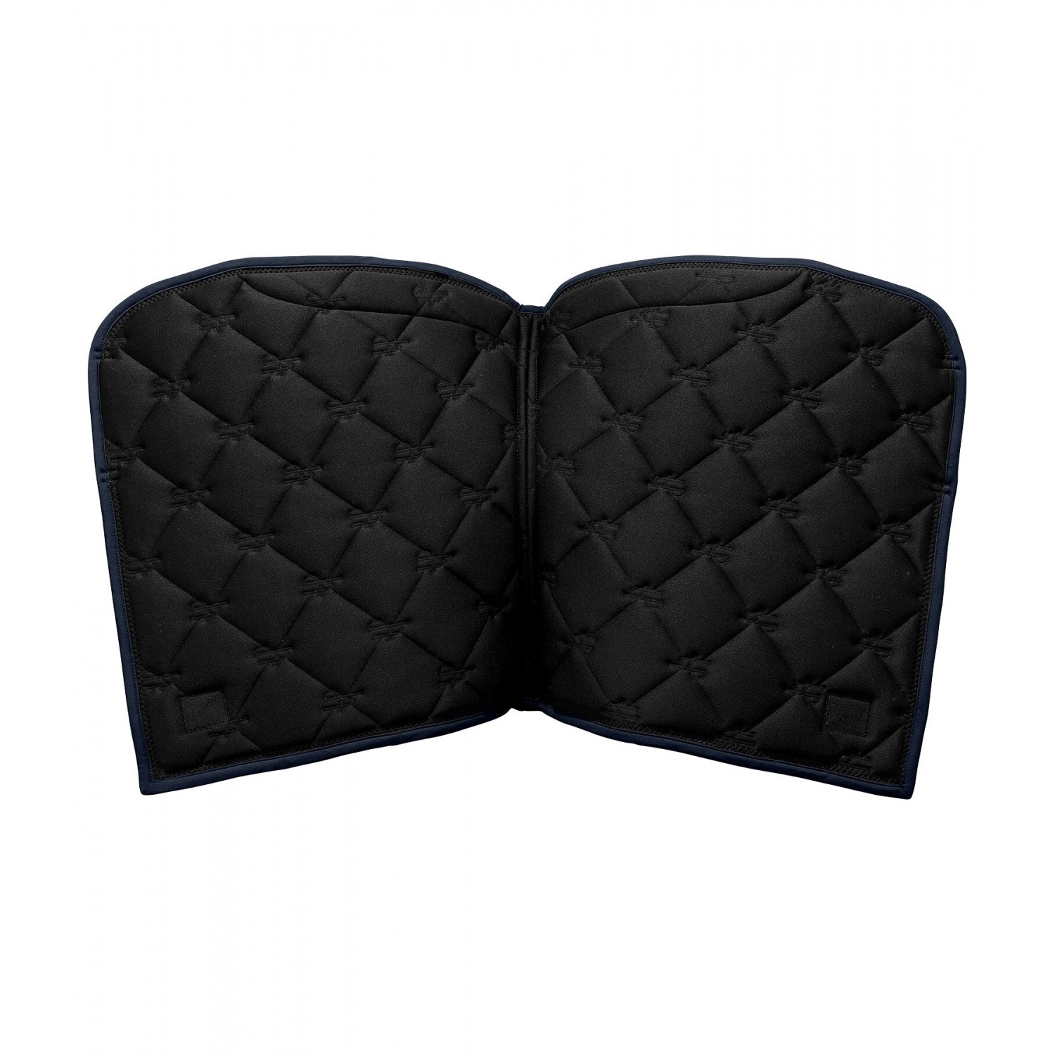 Элегантнаый вальтрап в классическом дизайне с блестящими стразами и декоративным шнуром в двухцветном исполнении. Блестящий логотип. Мягкий передний клапан, идеально удерживающий седло на месте. Нижняя сторона выполнена из влагоотводящей и дышащей сетчатой ткани. 100% полиэстер.