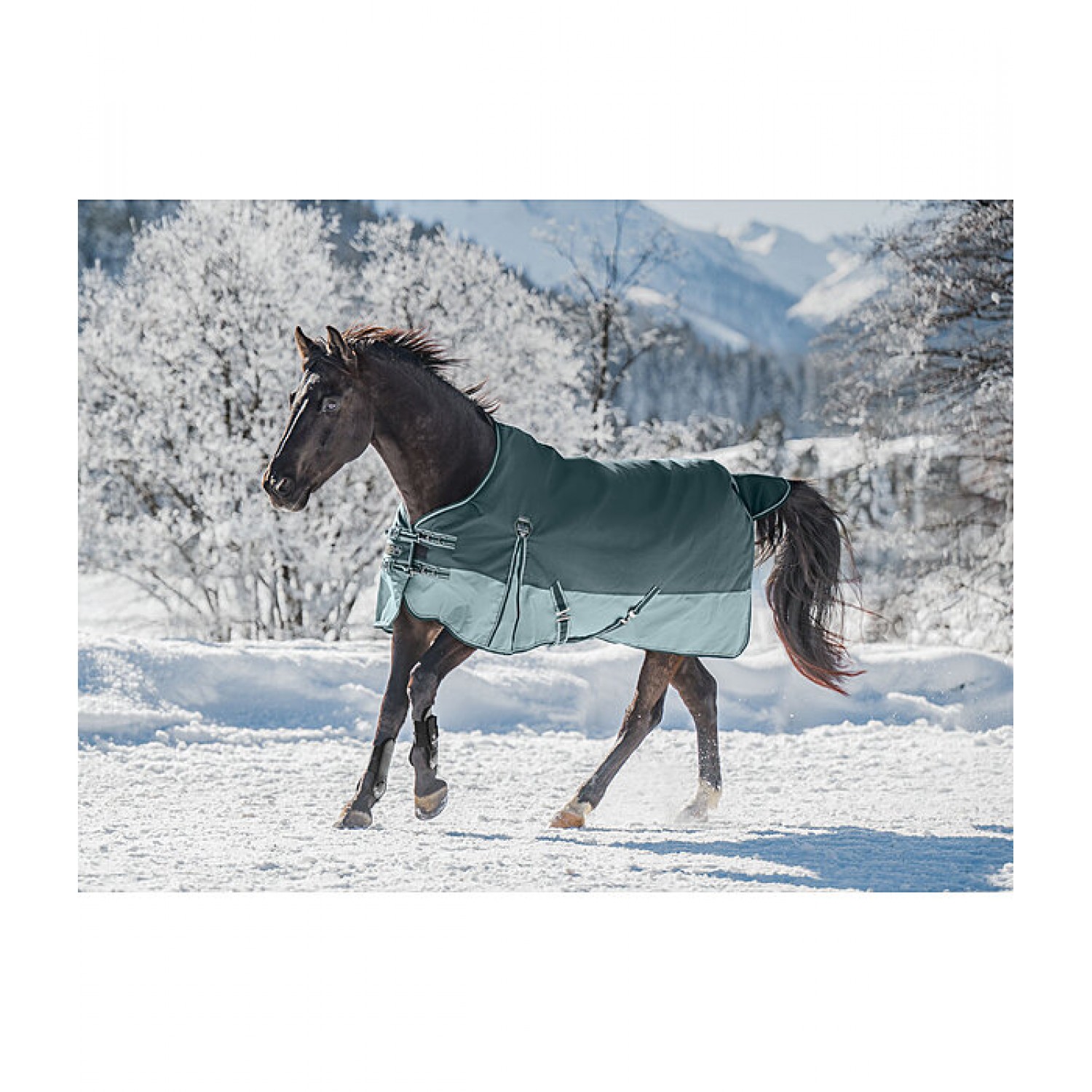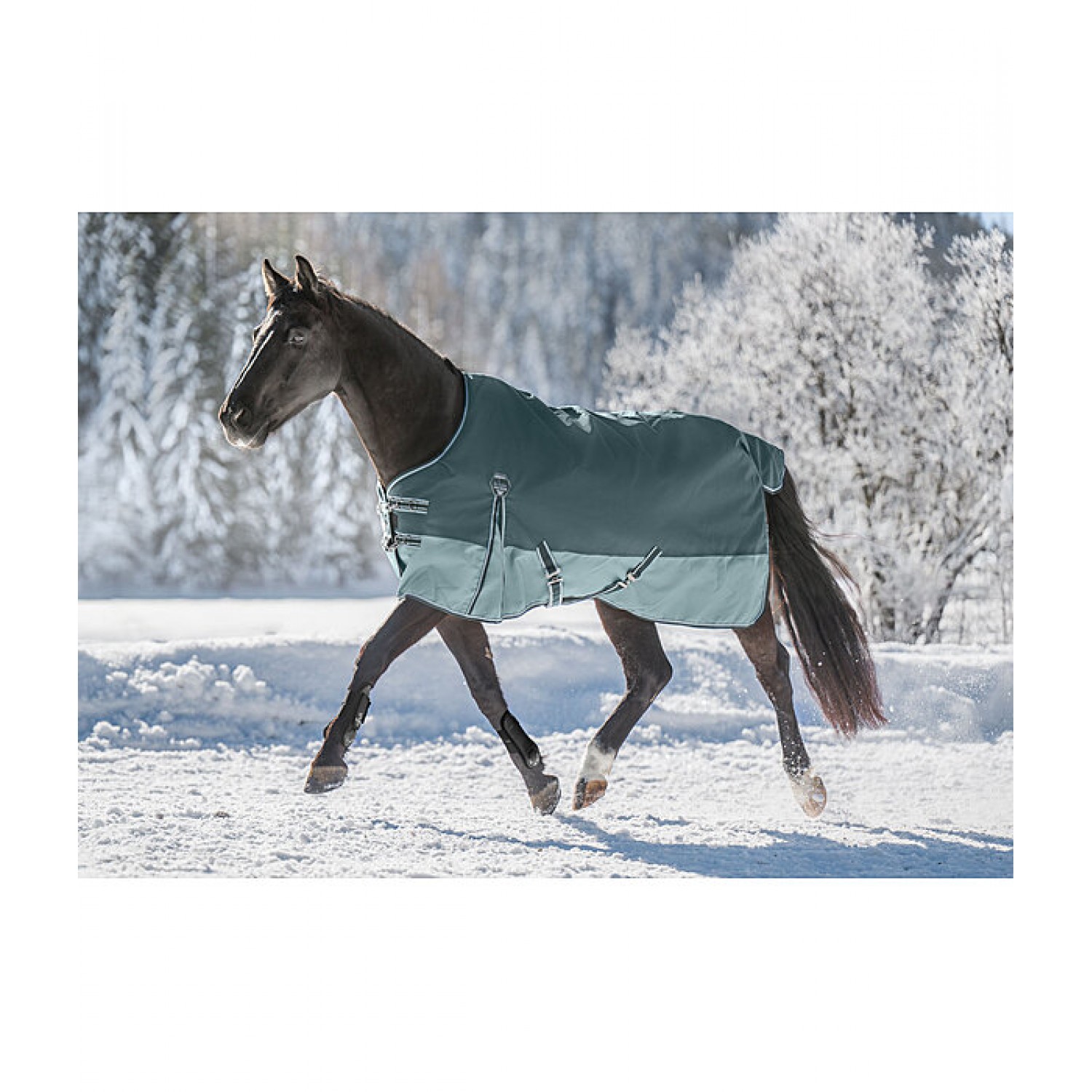 Двухцветная, прочная на разрыв, водонепроницаемая и дышащая попона из прочного материала рипстоп (1200 DEN). Внутренняя набивка, чтобы избежать точек давления в области холки. Легкий наполнитель 50 г. Гладкая внутренняя подкладка. Двойная регулируемая по размеру застежка на груди с карабинами и дополнительной липучкой для оптимальной фиксации. Высокая складка для идеальной свободы движений. Оснащена поперечными ремнями, устройством для дополнительного крепления ножных шнуров и регулируемым по длине хвостовым ремнем. 100% полиэстер.