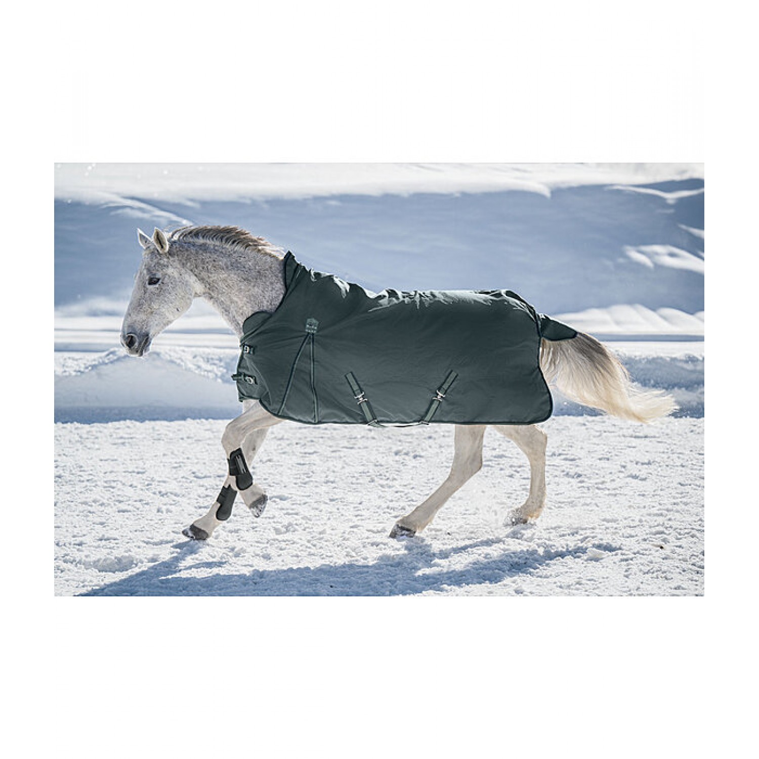 Инновационная прогулочная попона с высоким воротом для защиты от проникновения воды и избежания натирания в области холки, а также с мягкими, прикрепленные сбоку подплечниками (внутренняя часть из флиса), которые обеспечивают оптимальное распределение давления даже при опущенной голове. Изготовлена из дышащего и водонепроницаемого материала рипстоп. Мягкая внутренняя подкладка из флиса (без дополнительной набивки), а также гладкая внутренняя подкладка в области плеч и груди. Двойная регулируемая передняя застежка с D-образными кольцами и карабинами, а также дополнительные липучки и регулируемые поперечные ремни. 100% полиэстер.