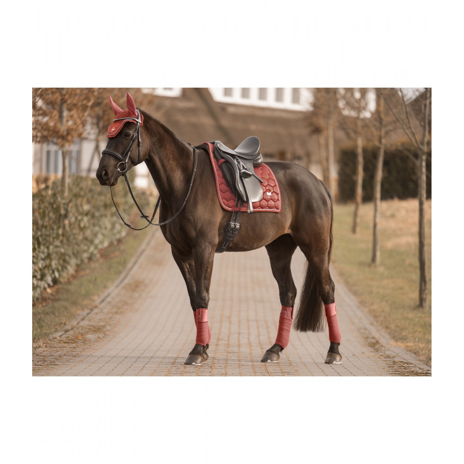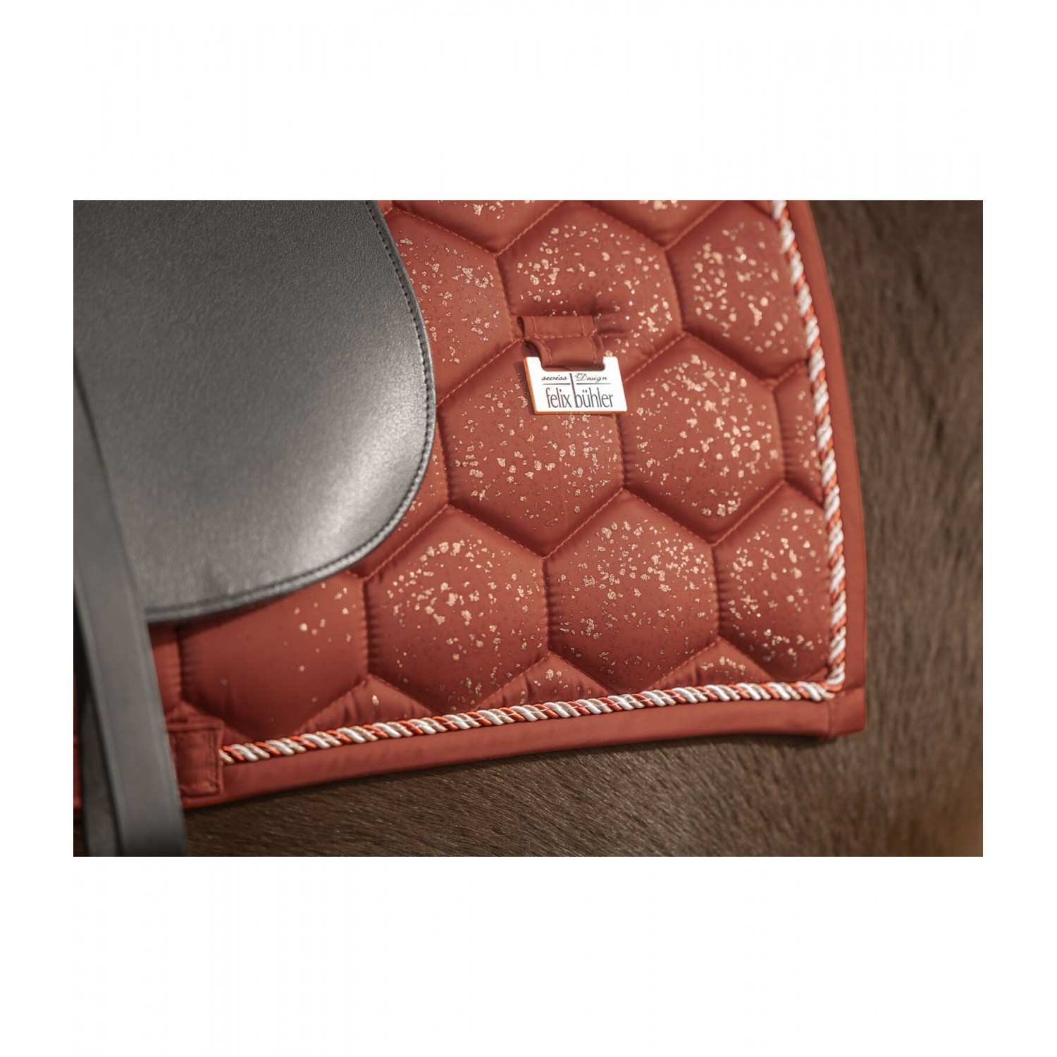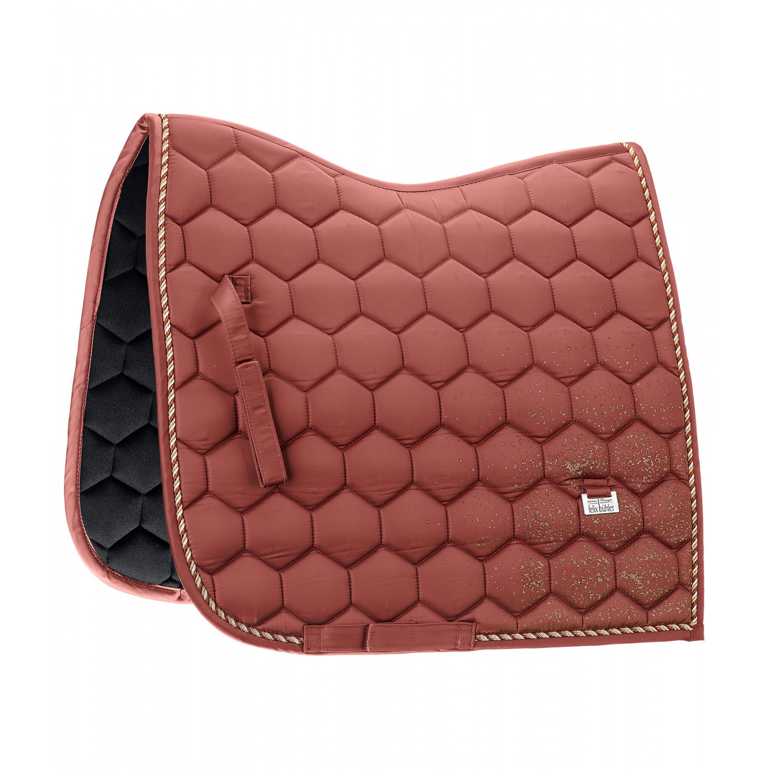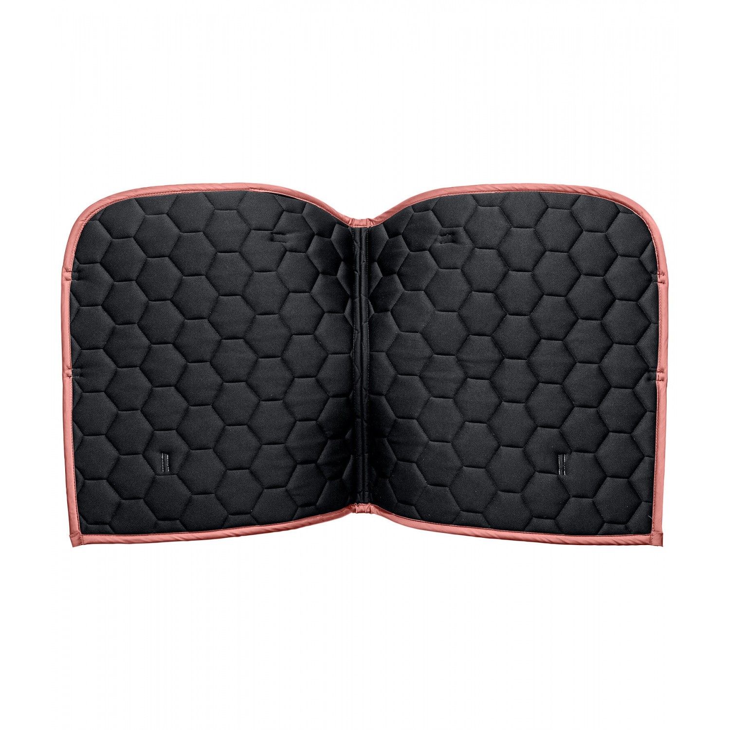 Квадратный крой, с металлическими пластинами и тисненым логотипом в обрамлении разноцветных блесток и трехцветного блестящего декоративного шнура. Внутри из дышащей и влагопоглощающей воздушной сетки. 100% полиэстер. DR: длина спинки 60 см, высота 53 см VS: длина спинки 60 см, высота 51 см.