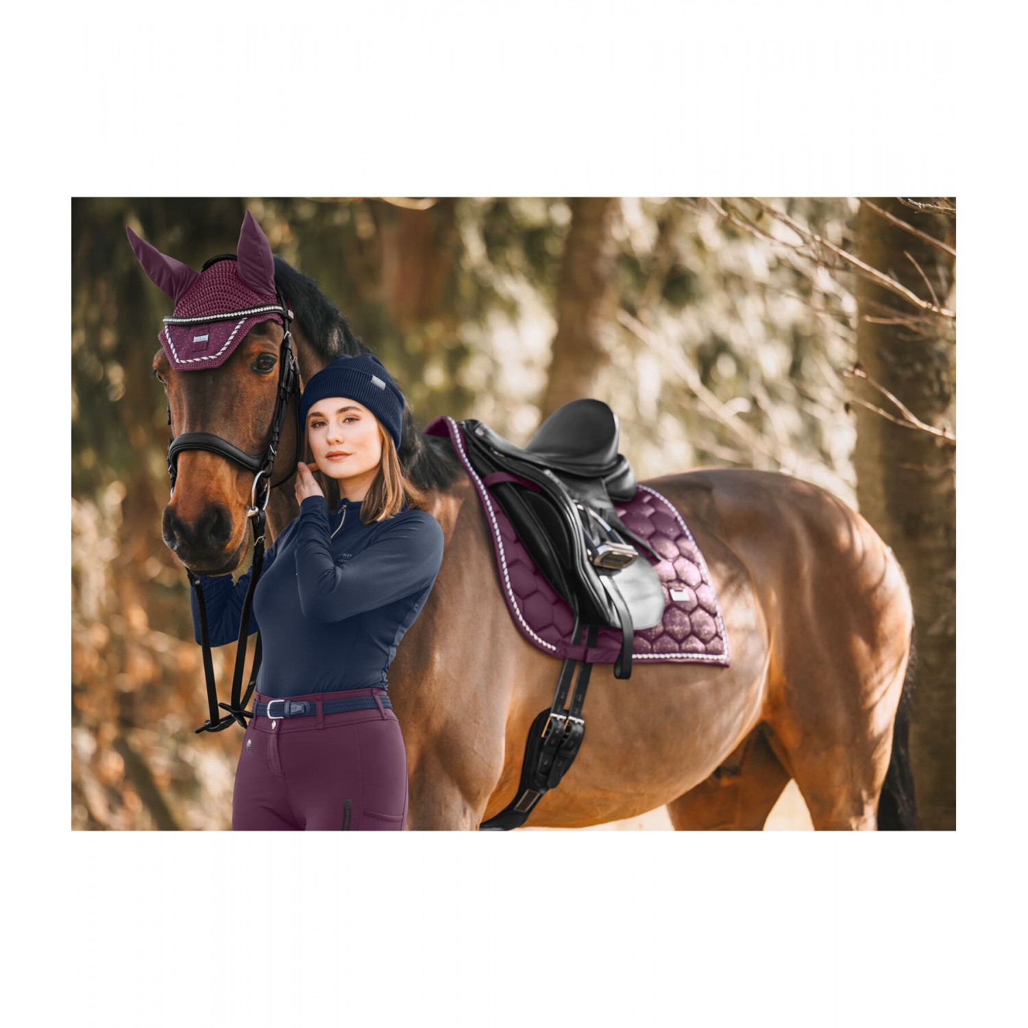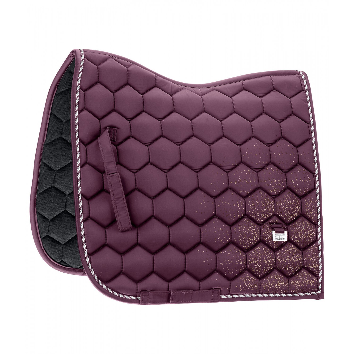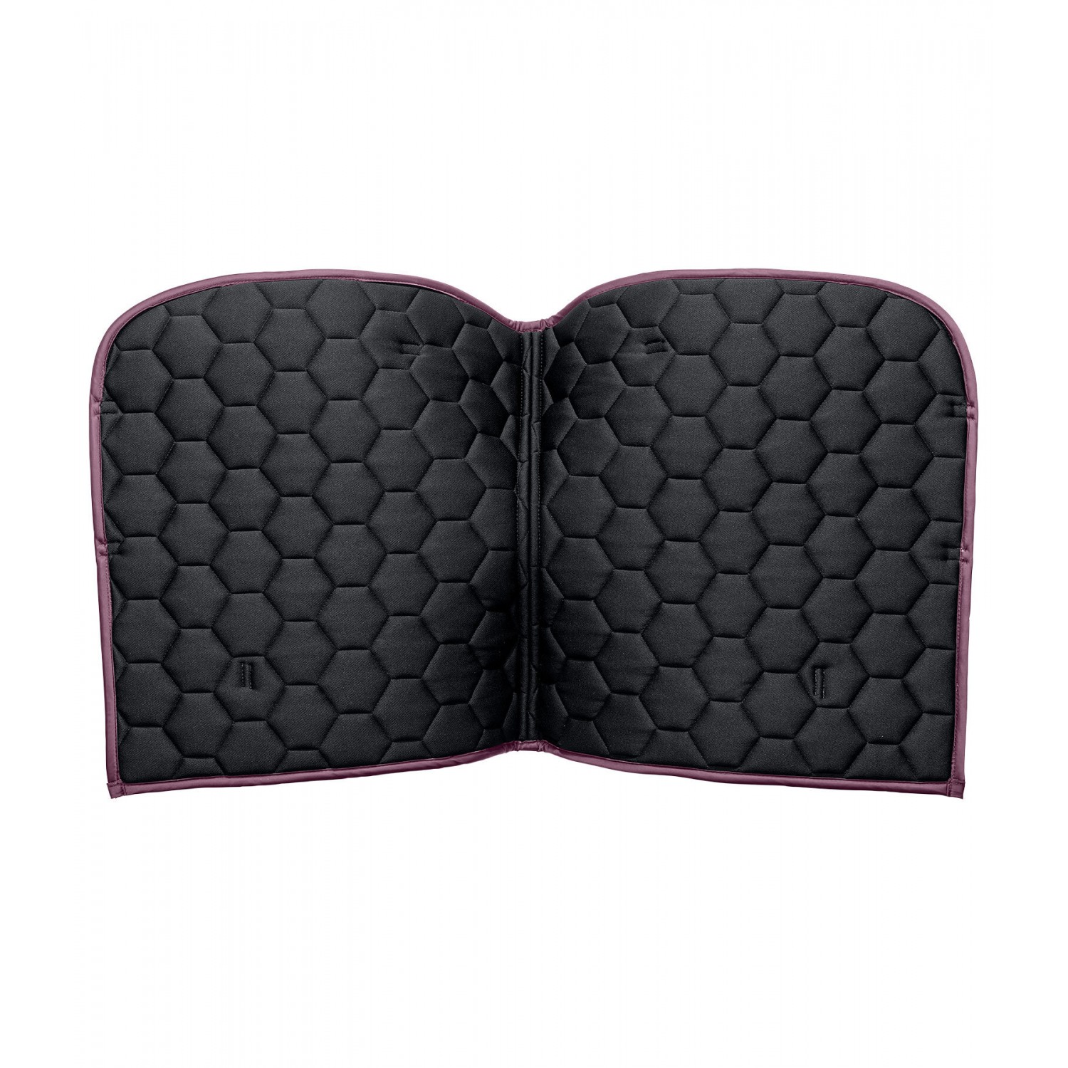 Квадратный крой, с металлическими пластинами и тисненым логотипом в обрамлении разноцветных блесток и трехцветного блестящего декоративного шнура. Внутри из дышащей и влагопоглощающей воздушной сетки. 100% полиэстер. DR: длина спинки 60 см, высота 53 см VS: длина спинки 60 см, высота 51 см.