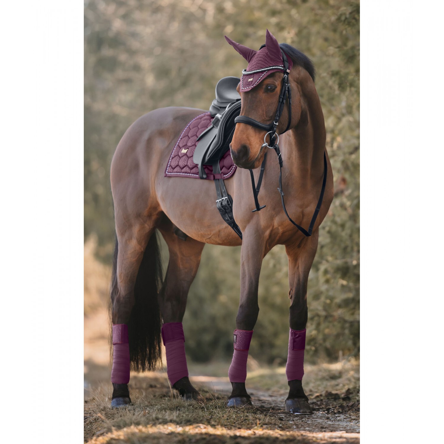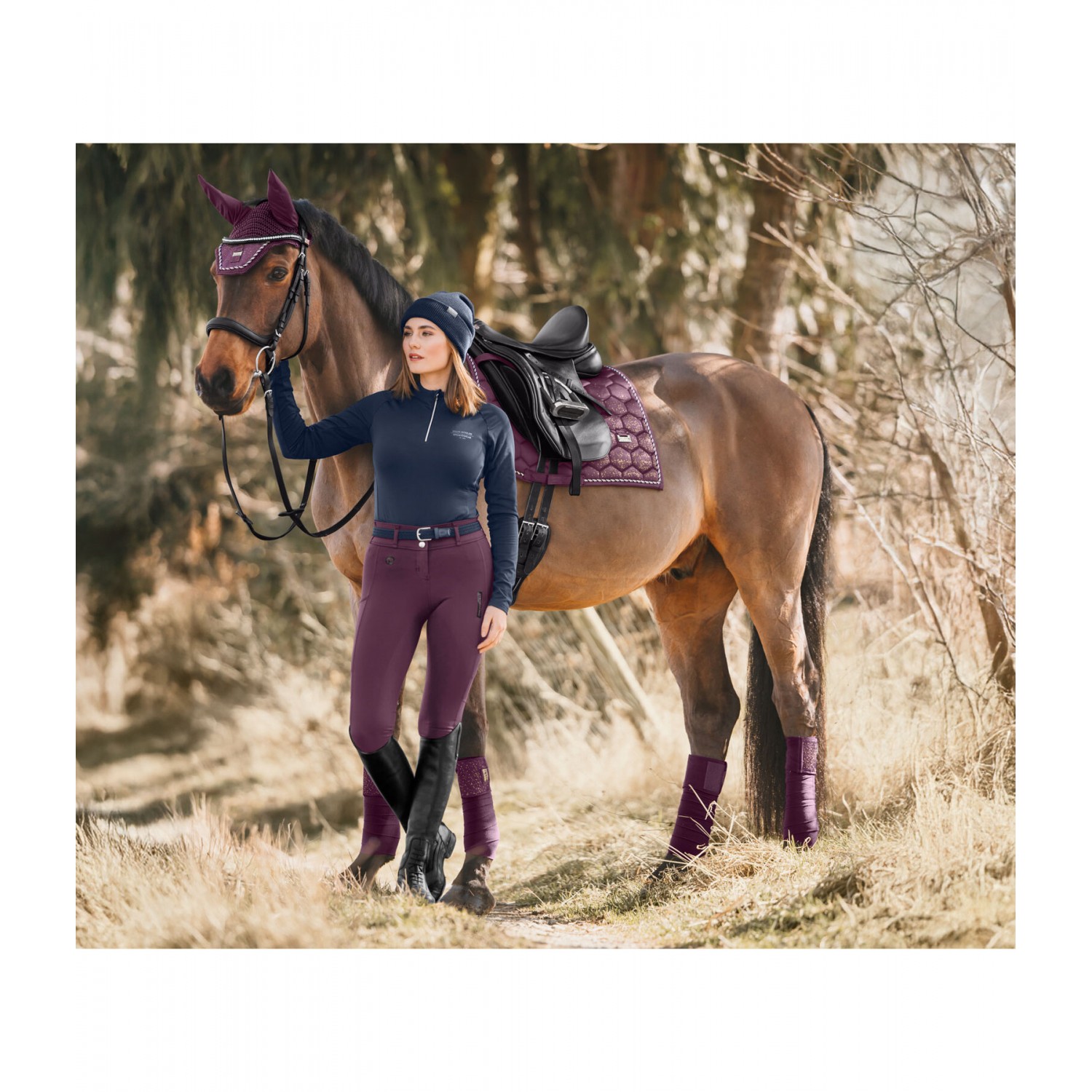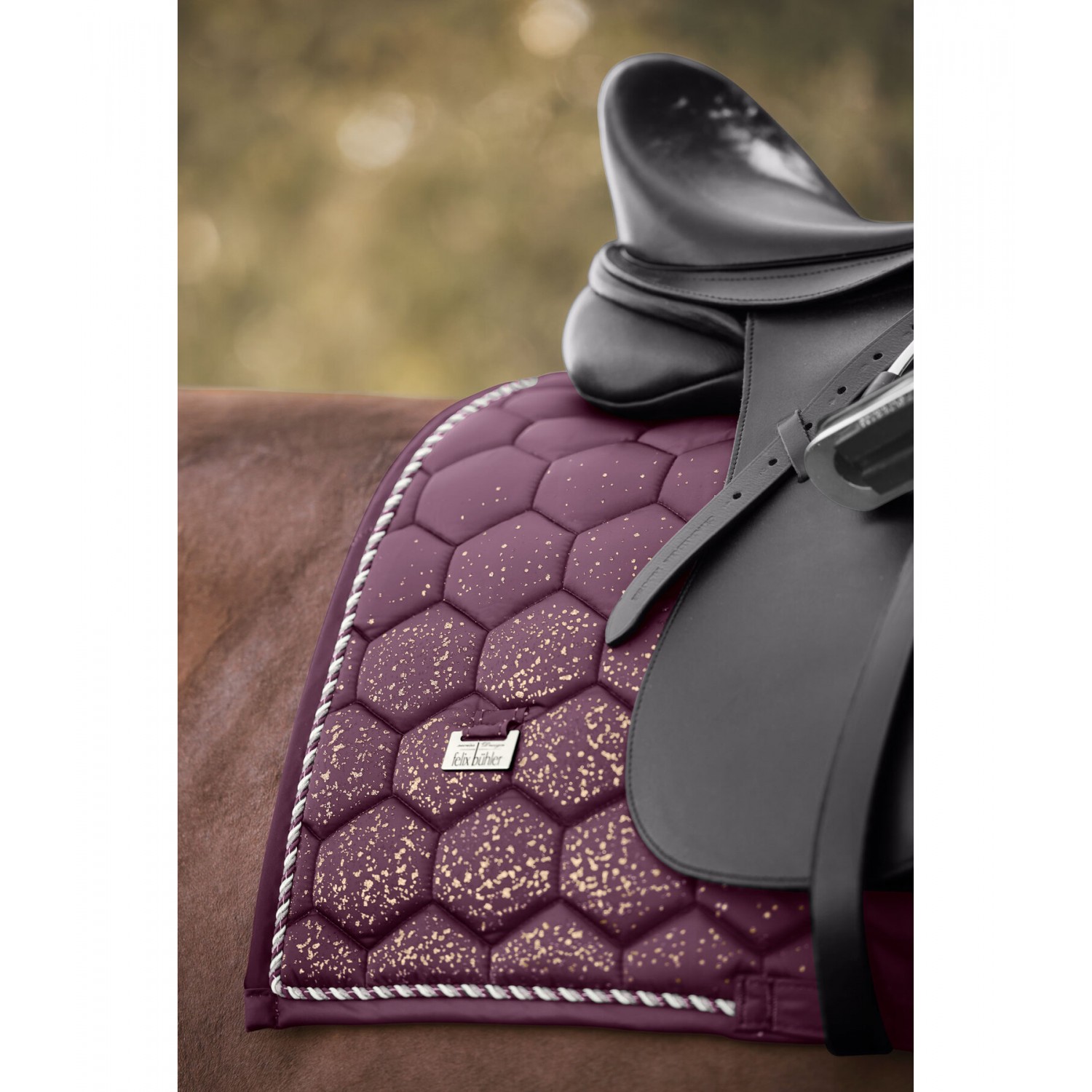 Квадратный крой, с металлическими пластинами и тисненым логотипом в обрамлении разноцветных блесток и трехцветного блестящего декоративного шнура. Внутри из дышащей и влагопоглощающей воздушной сетки. 100% полиэстер. DR: длина спинки 60 см, высота 53 см VS: длина спинки 60 см, высота 51 см.