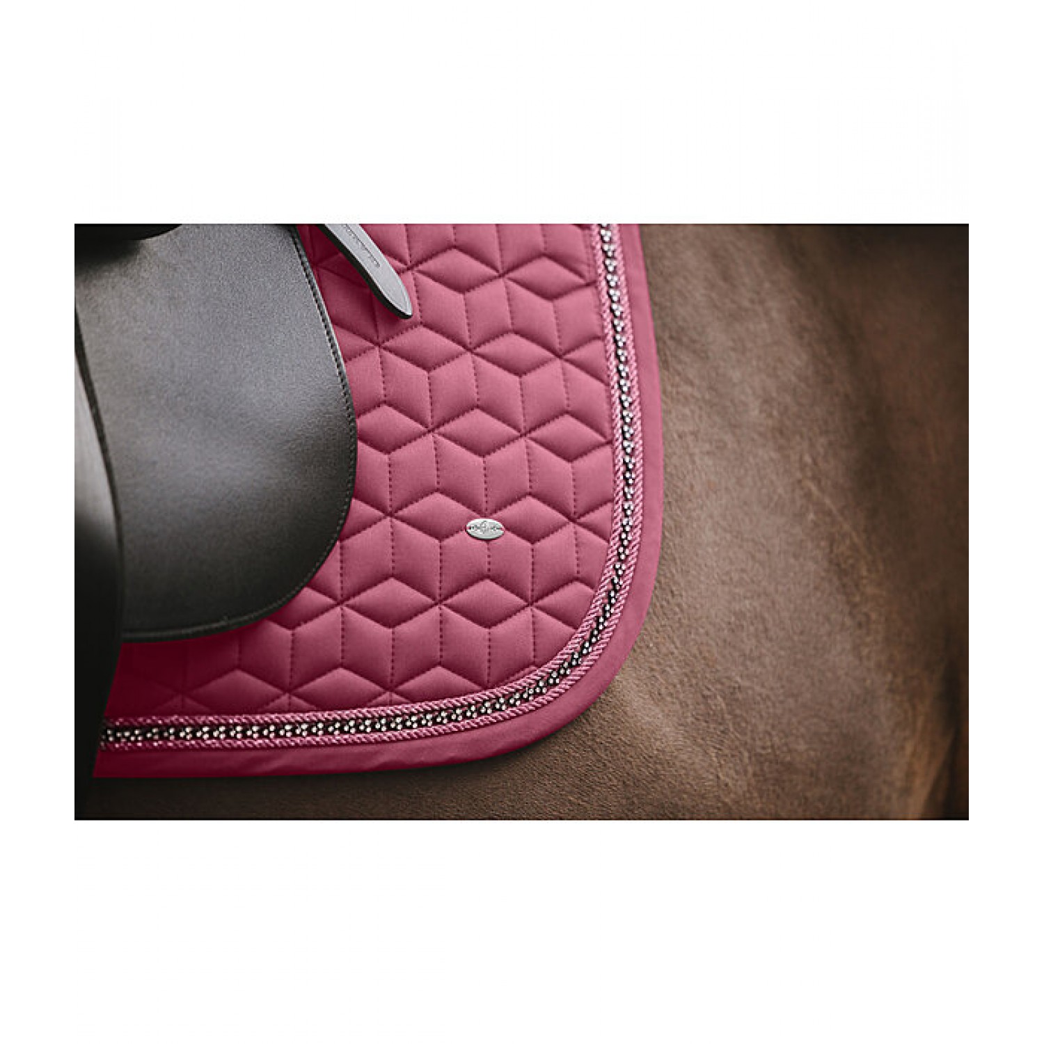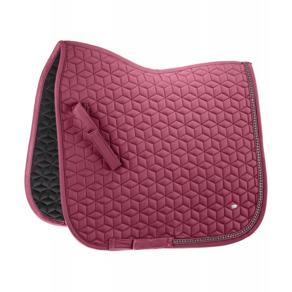Блестящий вальтрап, украшенный мелкими стразами и двойным мерцающим декоративным шнуром. Изящная серебряная пластинка с логотипом и изысканная стёжка. Нижняя часть изготовлена из влагоотводящей и воздухопроницаемой сетчатой ткани. 100% полиэстер.