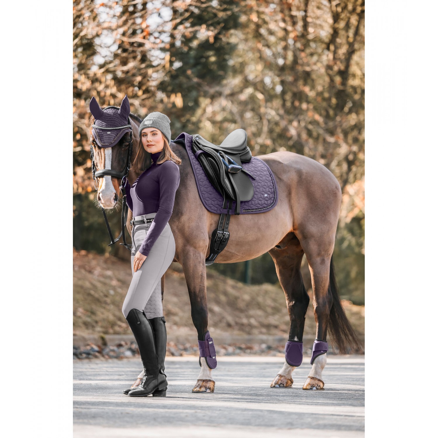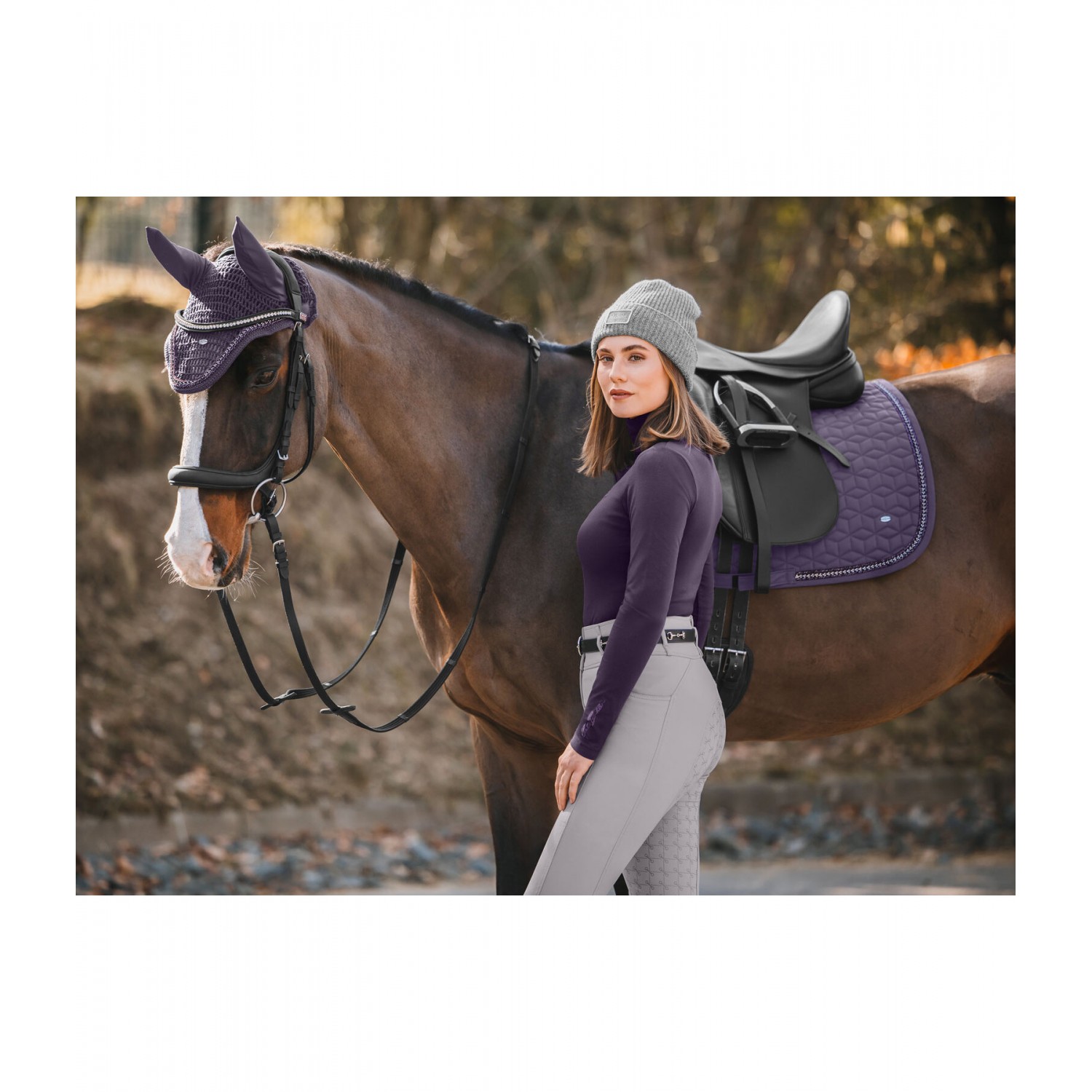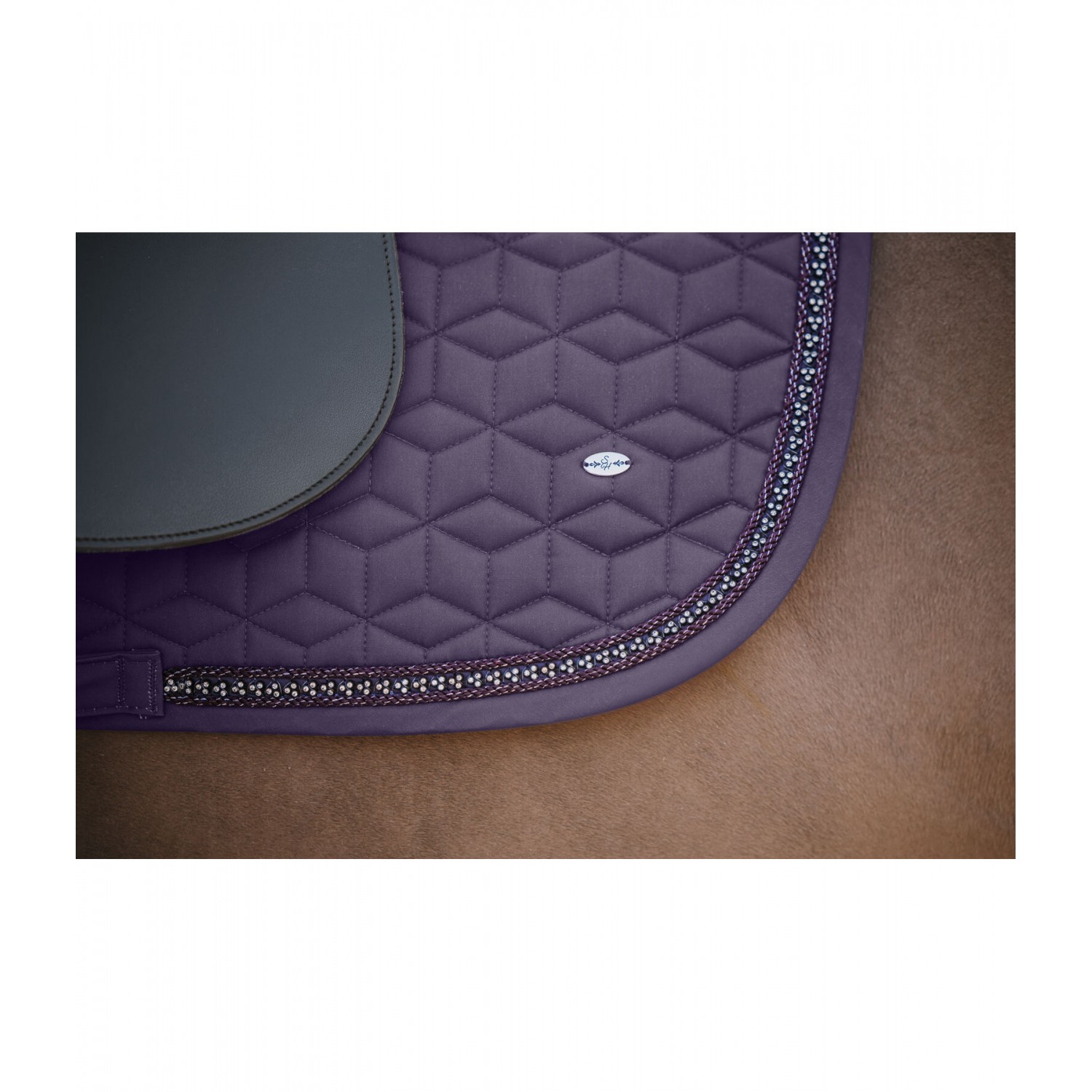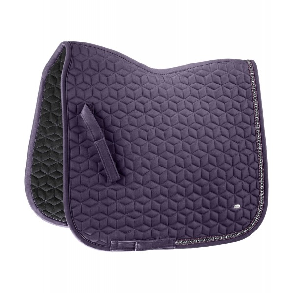 Блестящий вальтрап, украшенный мелкими стразами и двойным мерцающим декоративным шнуром. Изящная серебряная пластинка с логотипом и изысканная стёжка. Нижняя часть изготовлена из влагоотводящей и воздухопроницаемой сетчатой ткани. 100% полиэстер.