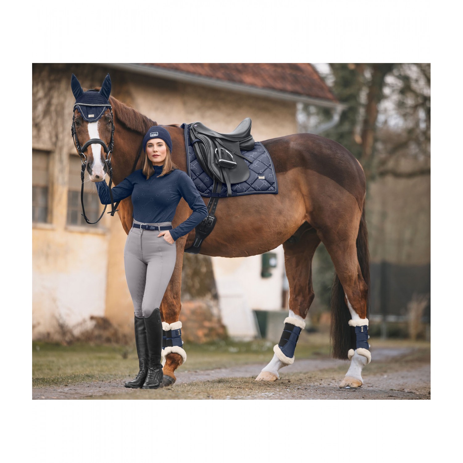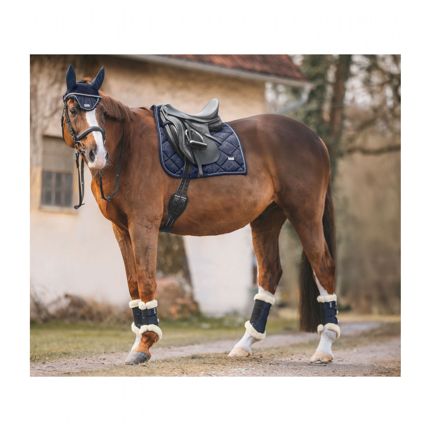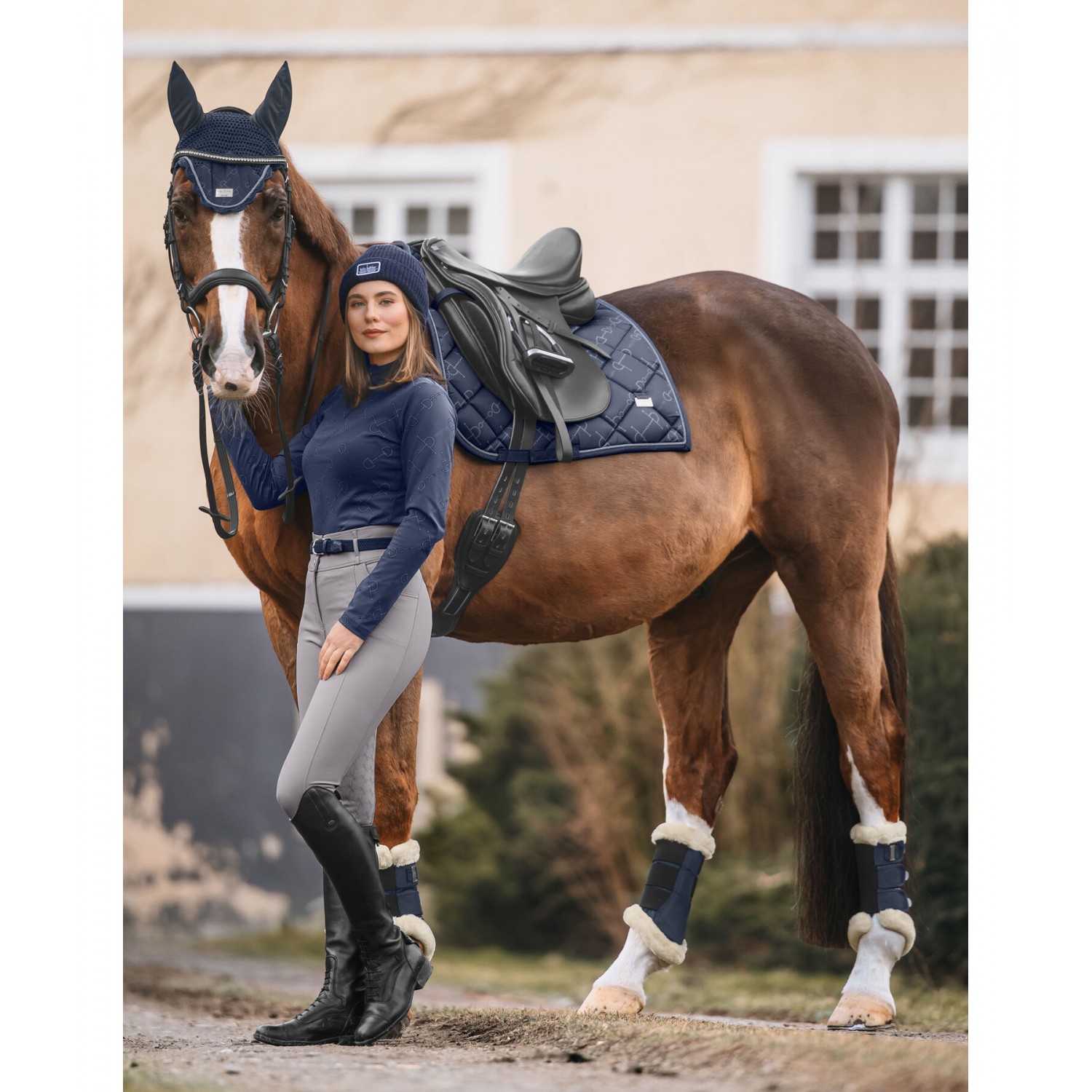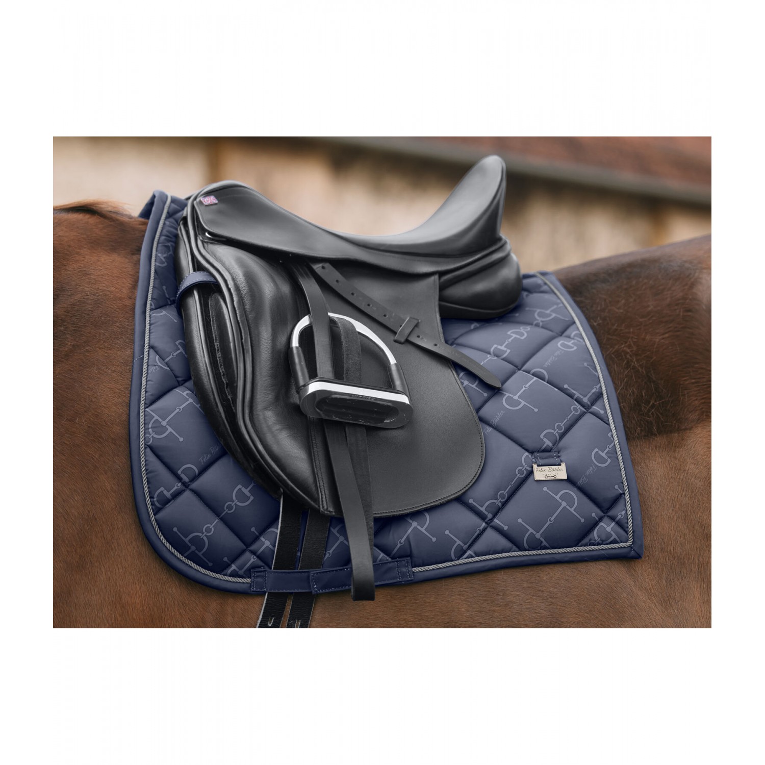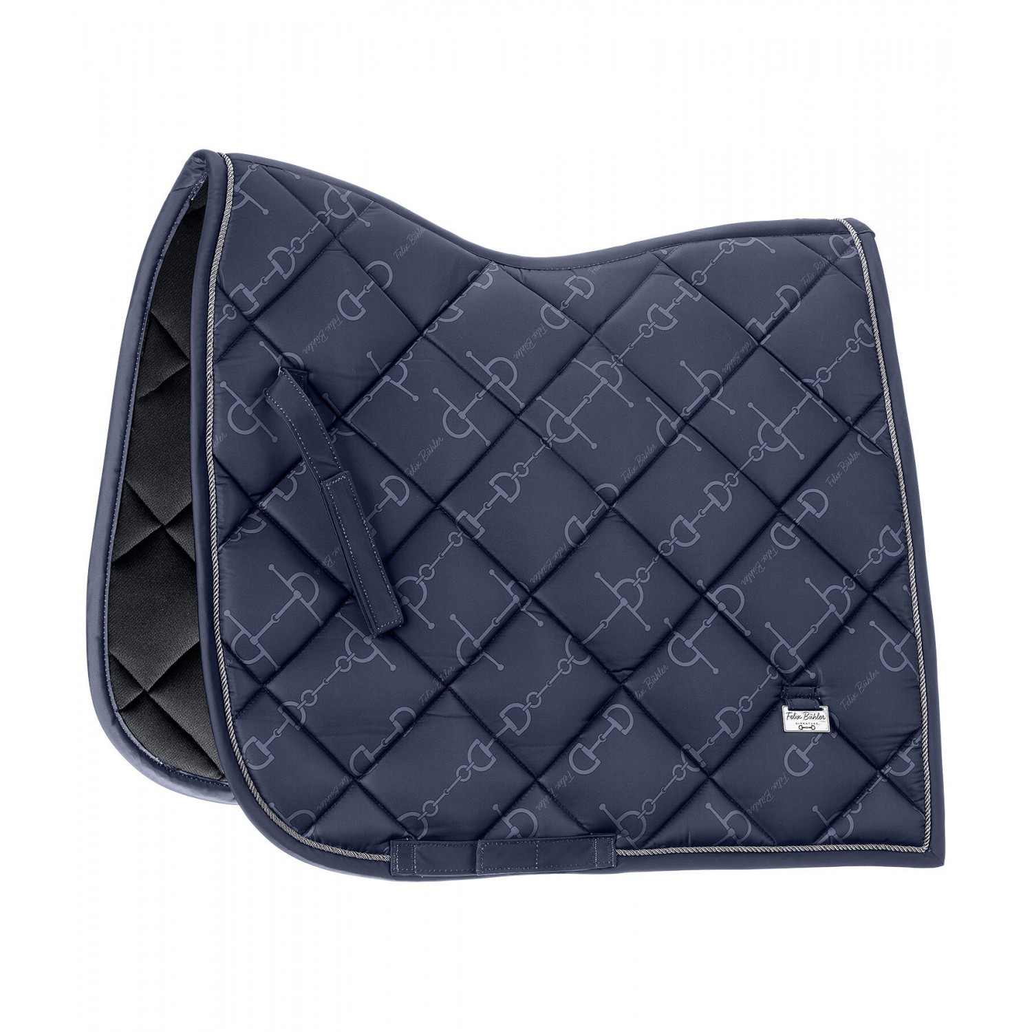 Элегантный вальтрап с металлическими пластинами-логотипами с обеих сторон. Декоративный шнур антрацитового цвета и нежный принт по всей поверхности с модным рисунком трензеля. Нижняя часть изготовлена из дышащей и влагоотводящей сетки. 100% полиэстер.