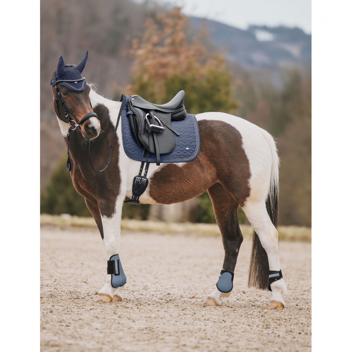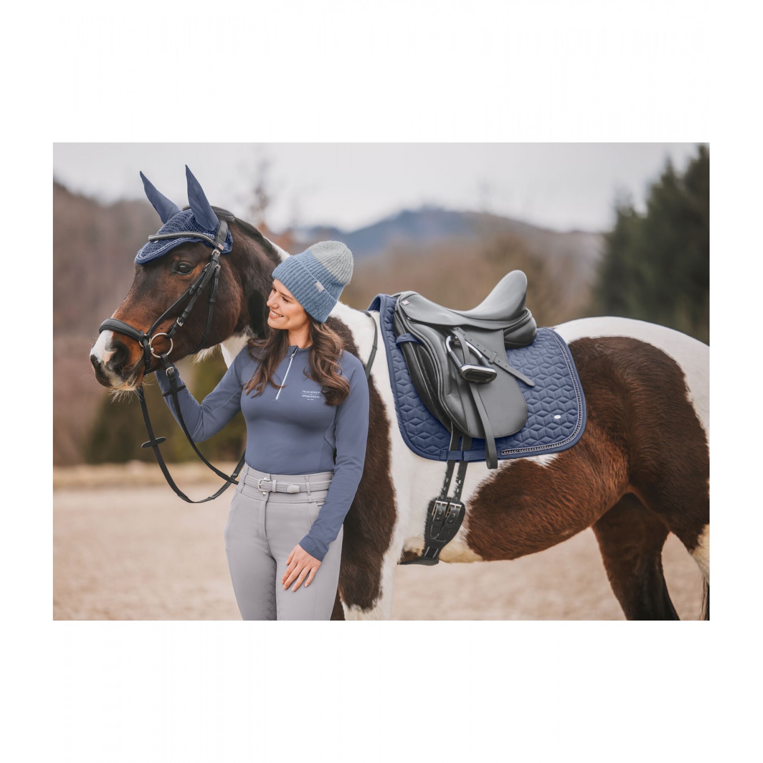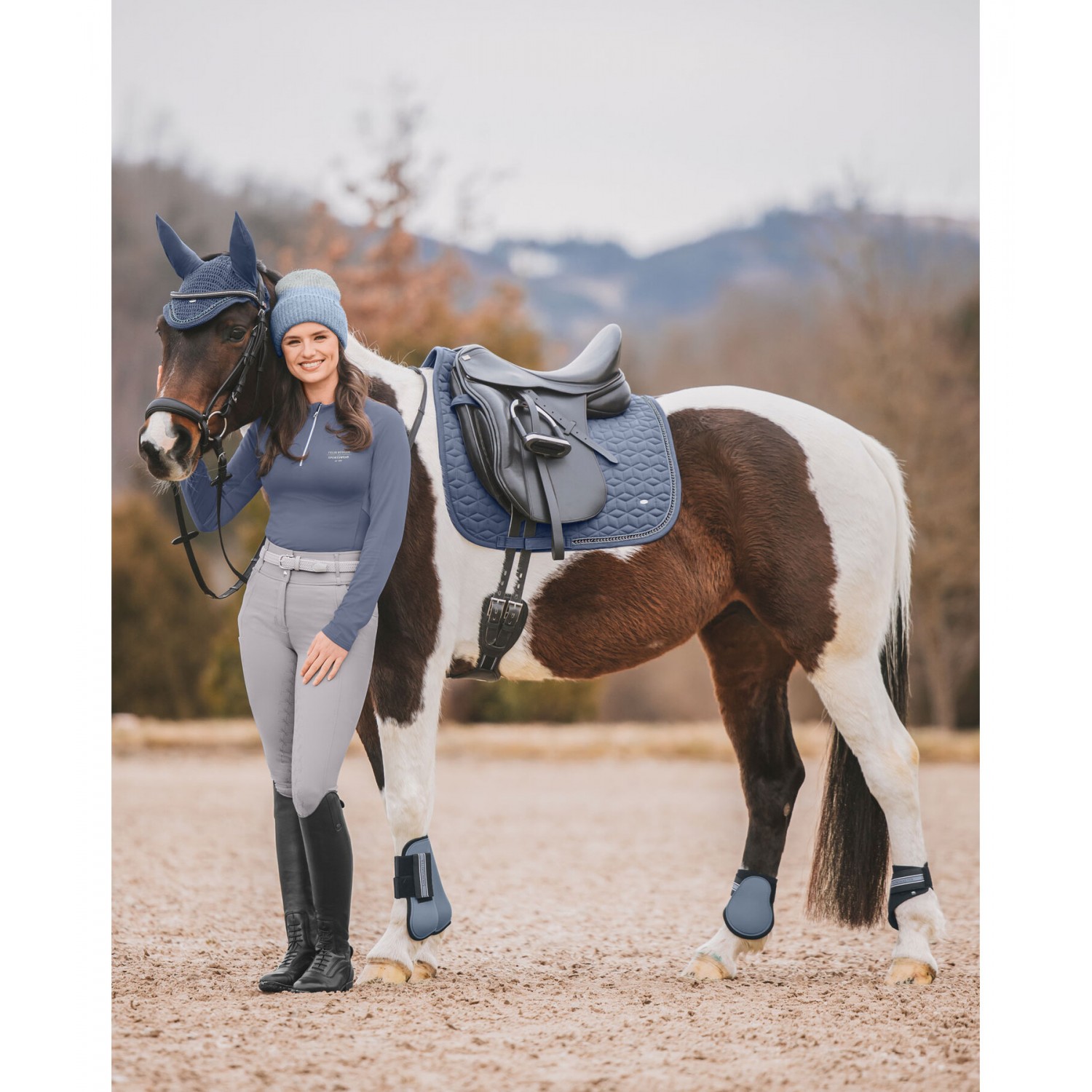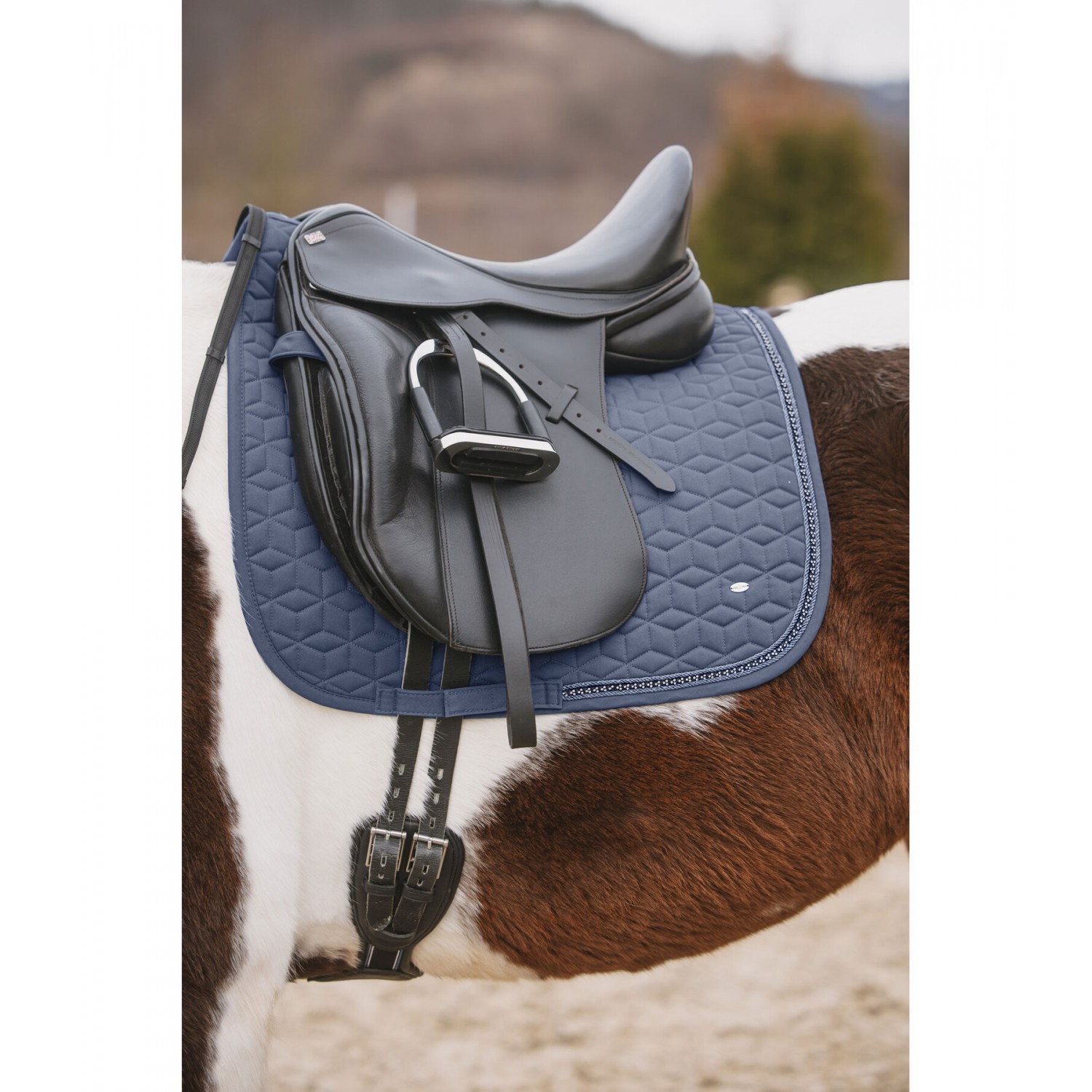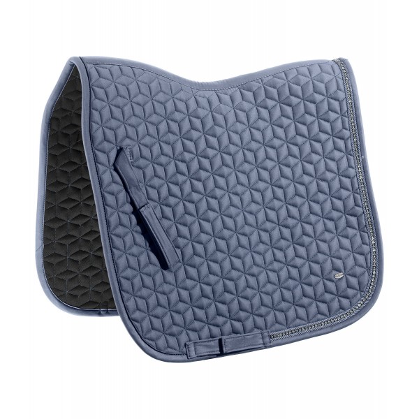 Блестящий вальтрап, украшенный мелкими стразами и двойным мерцающим декоративным шнуром. Изящная серебряная пластинка с логотипом и изысканная стёжка. Нижняя часть изготовлена из влагоотводящей и воздухопроницаемой сетчатой ткани. 100% полиэстер.