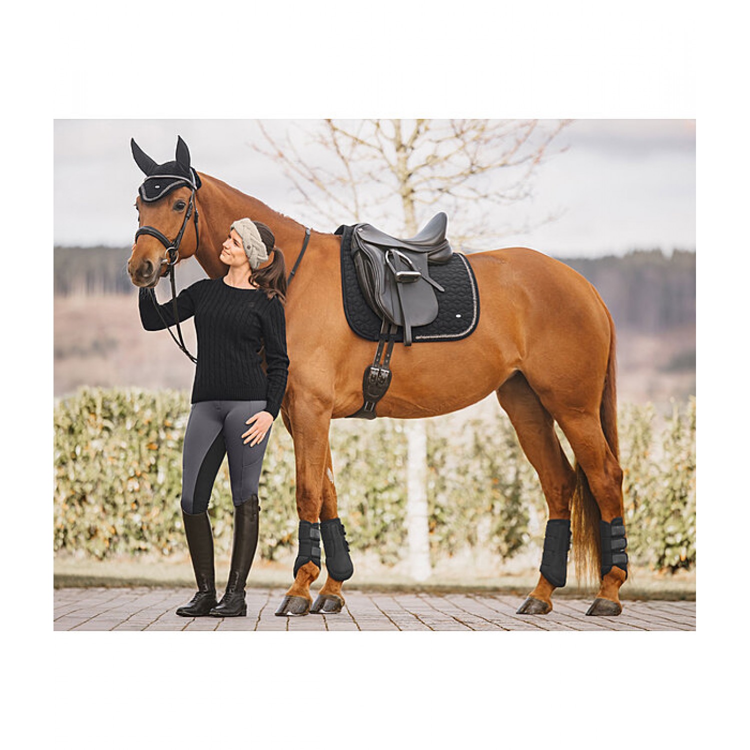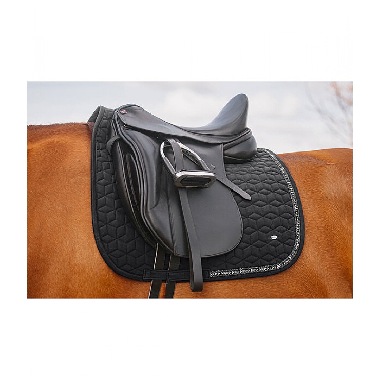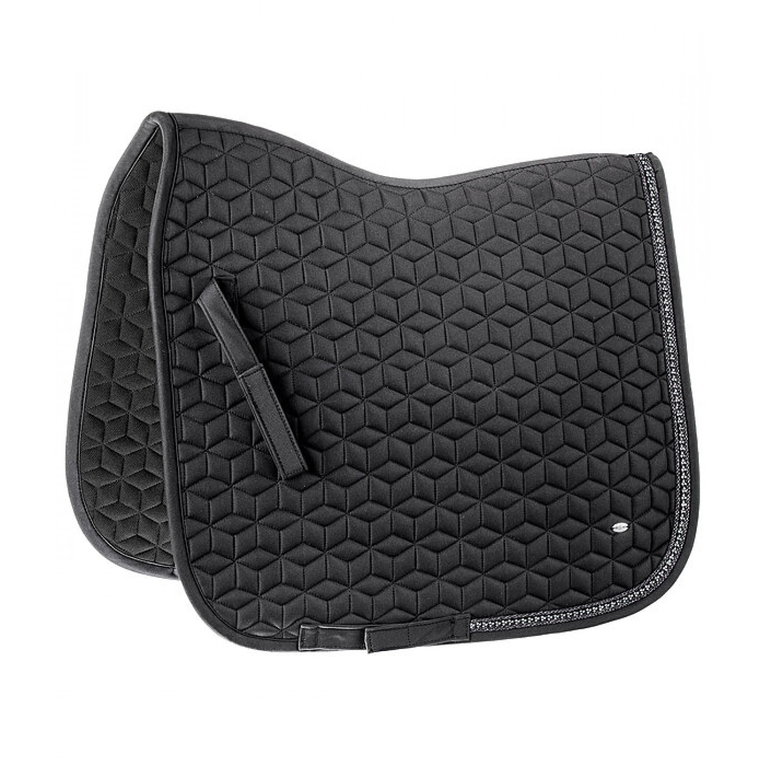 Блестящий вальтрап, украшенный мелкими стразами и двойным мерцающим декоративным шнуром. Изящная серебряная пластинка с логотипом и изысканная стёжка. Нижняя часть изготовлена из влагоотводящей и воздухопроницаемой сетчатой ткани. 100% полиэстер.