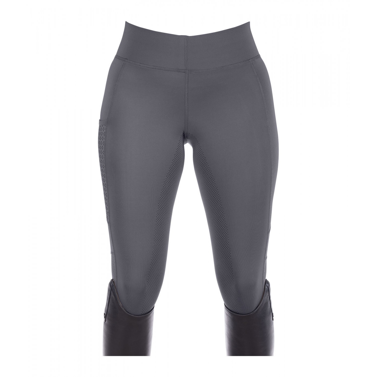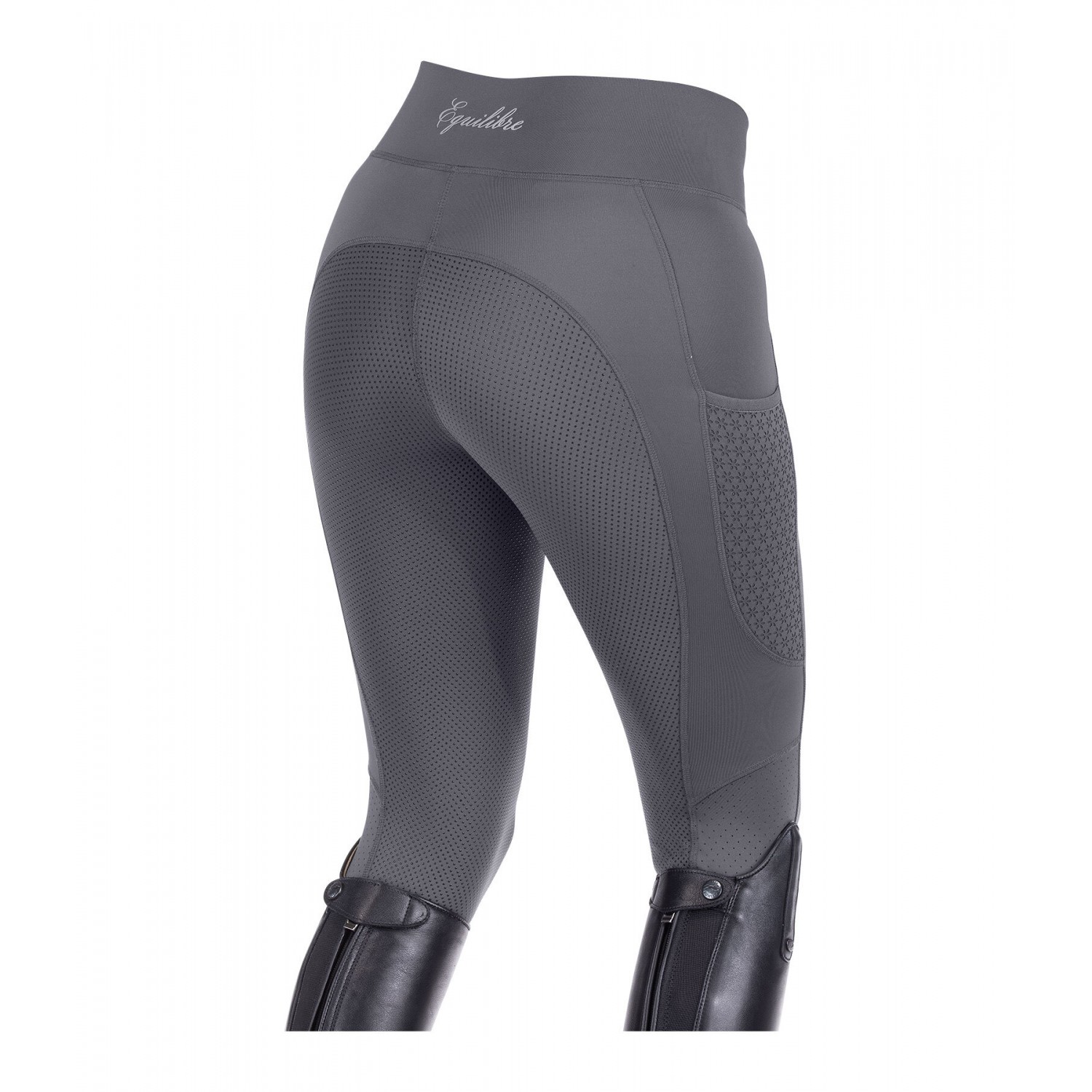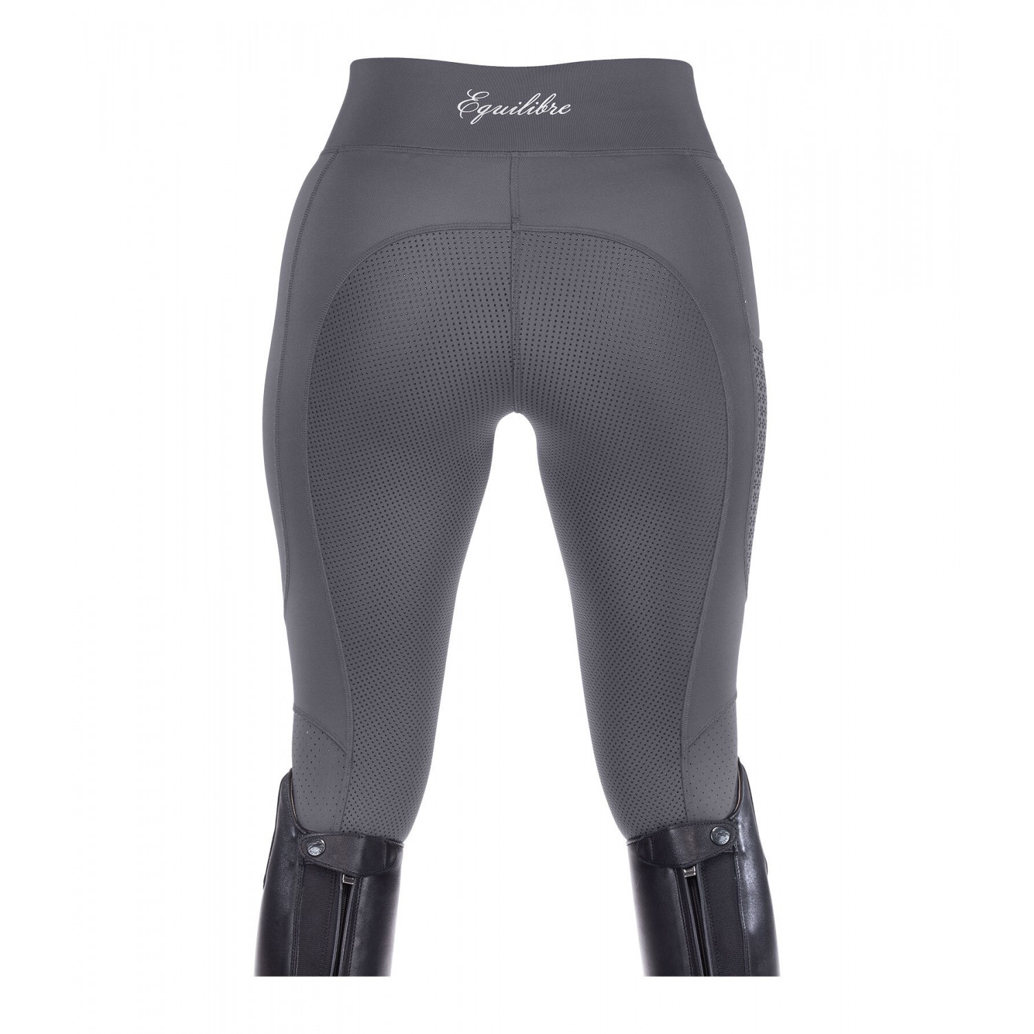 Удобные летние леггинсы для верховой езды из эластичного в четырех направлениях материала с перфорацией на штанинах. Полная силиконовая лея, очень дышащие и быстросохнущие. Удобный широкий пояс, один боковой карман для мобильного телефона с окантовкой цветочного дизайна, отсутствие коленных швов, тонкий принт Equilibre. 82% полиэстер, 18% эластан.