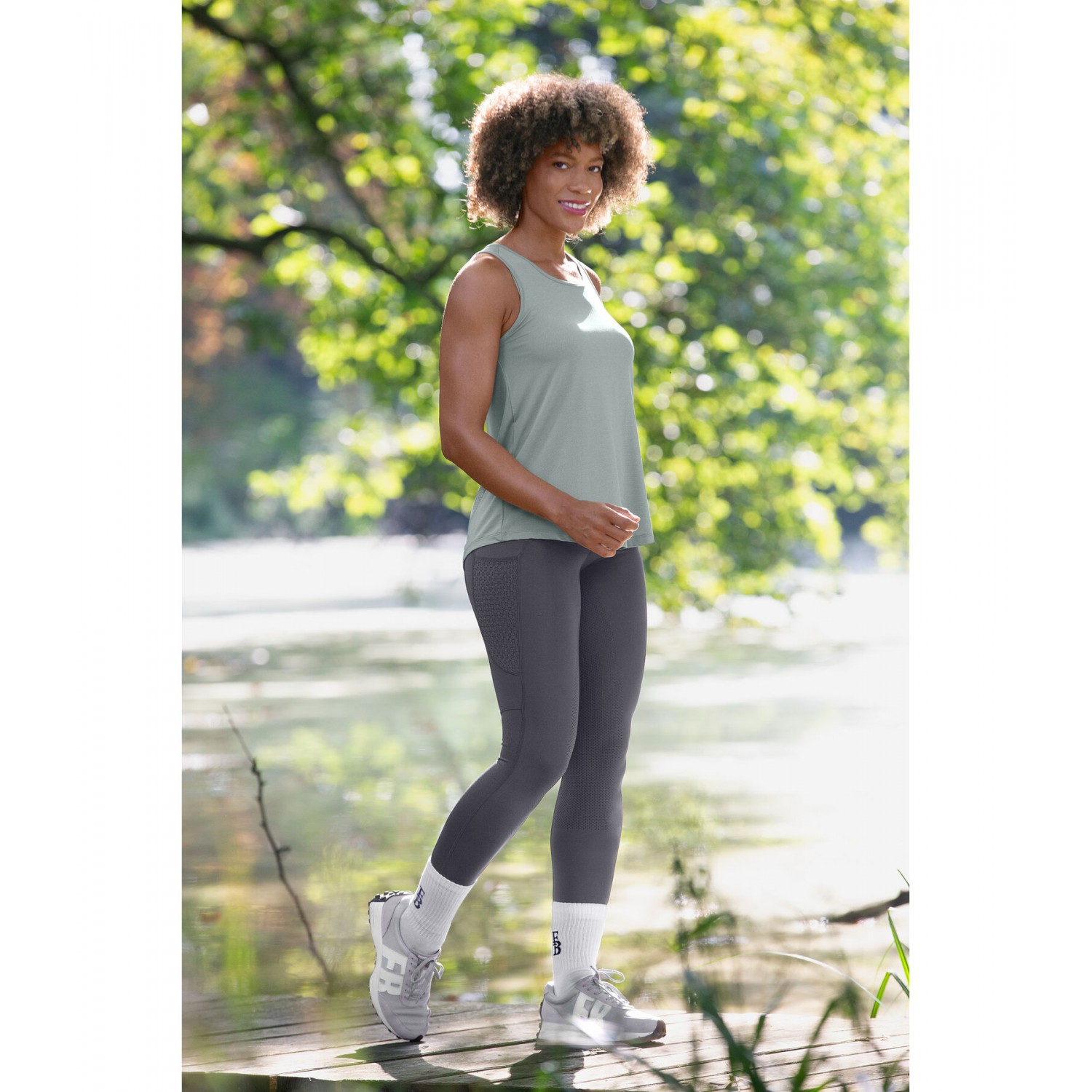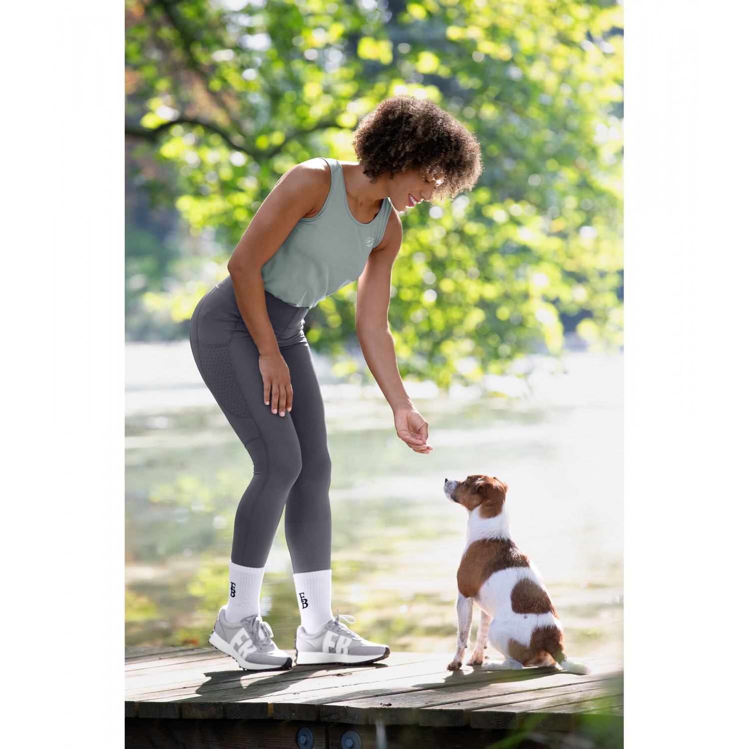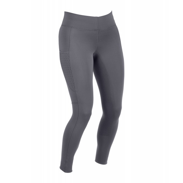 Удобные летние леггинсы для верховой езды из эластичного в четырех направлениях материала с перфорацией на штанинах. Полная силиконовая лея, очень дышащие и быстросохнущие. Удобный широкий пояс, один боковой карман для мобильного телефона с окантовкой цветочного дизайна, отсутствие коленных швов, тонкий принт Equilibre. 82% полиэстер, 18% эластан.