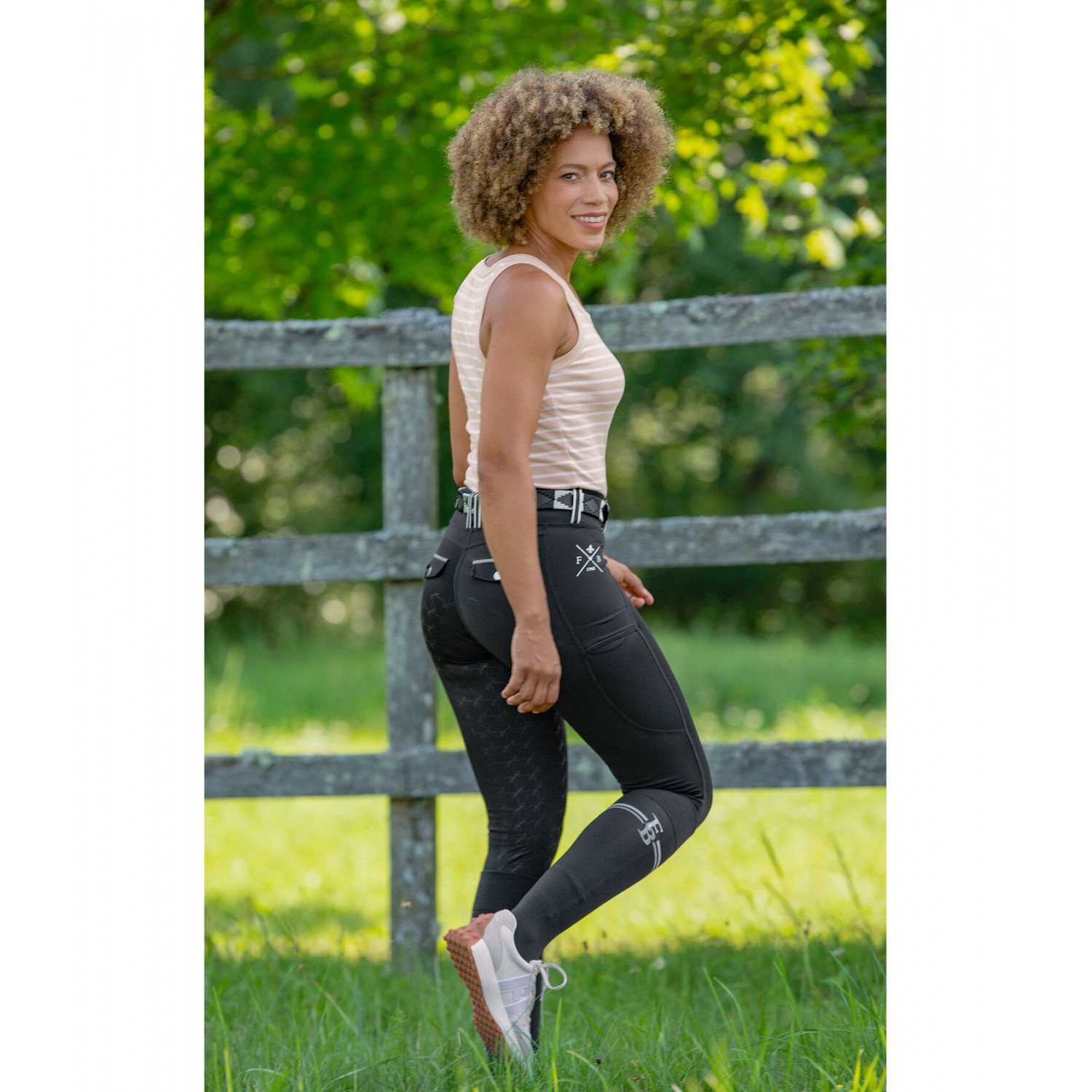 Спортивные леггинсы для верховой езды из высококачественного эластичного материала, растягивающегося в четырех направлениях, с полной леей из силикона. Дышащий и быстросохнущий материал. Широкий пояс со шлевками для ремня с отделкой тесьмой контрастного цвета. 2 боковых кармана для мобильного телефона, без швов на коленях, принты Felix Bühler. Идеальный внешний вид благодаря 2 ложным карманам с блестящей лентой сзади. 85% нейлон, 15% спандекс.