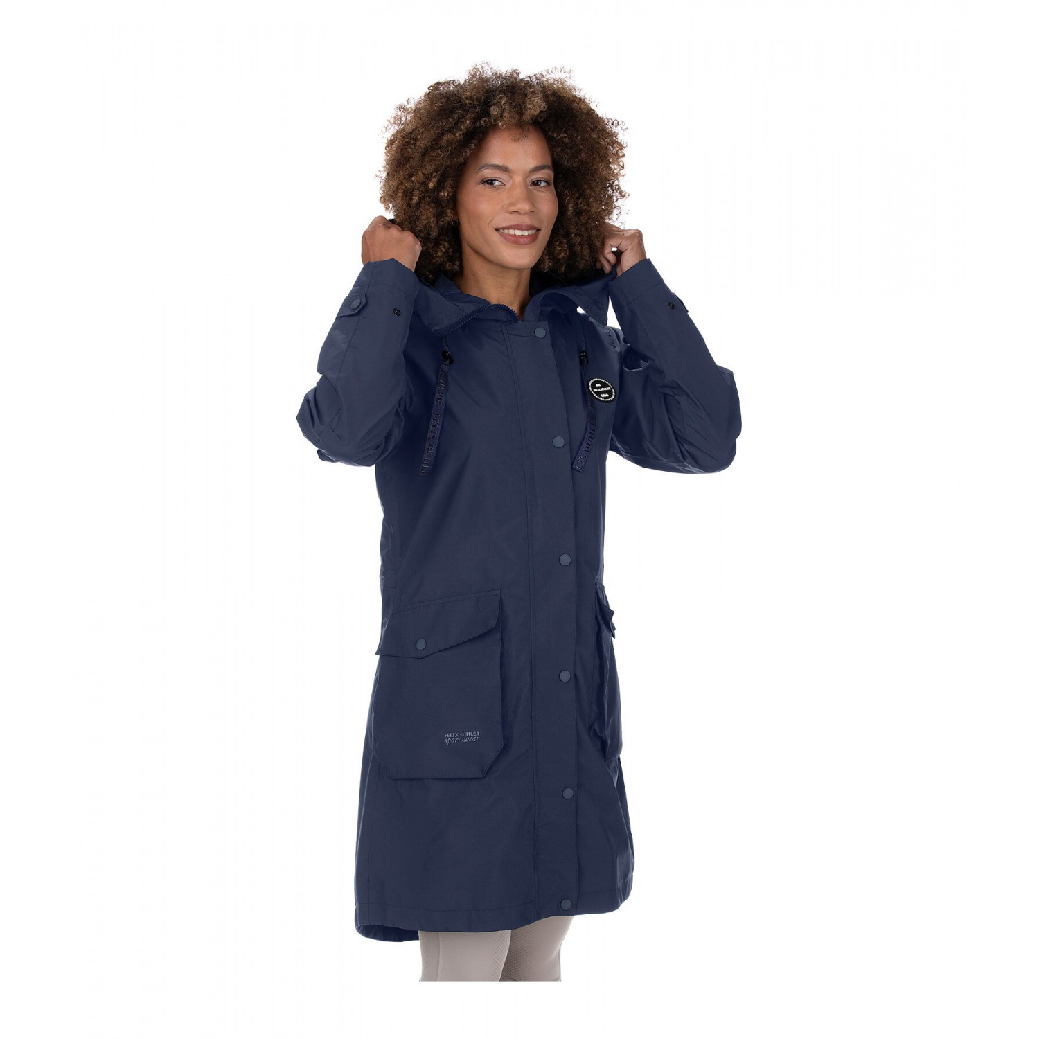 Повседневная с регулируемым капюшоном, который можно закрепить сзади. Очень удобный крой. Водонепроницаемая, ветрозащитная и дышащая. Скрытая двусторонняя молния, два больших накладных кармана с дополнительными боковыми карманами спереди, один карман на рукаве на молнии, один внутренний карман на молнии, регулируемая талия, регулируемые манжеты с эластичными ветрозащитными лентами и один длинный разрез с молнией сзади. 100% полиэстер.