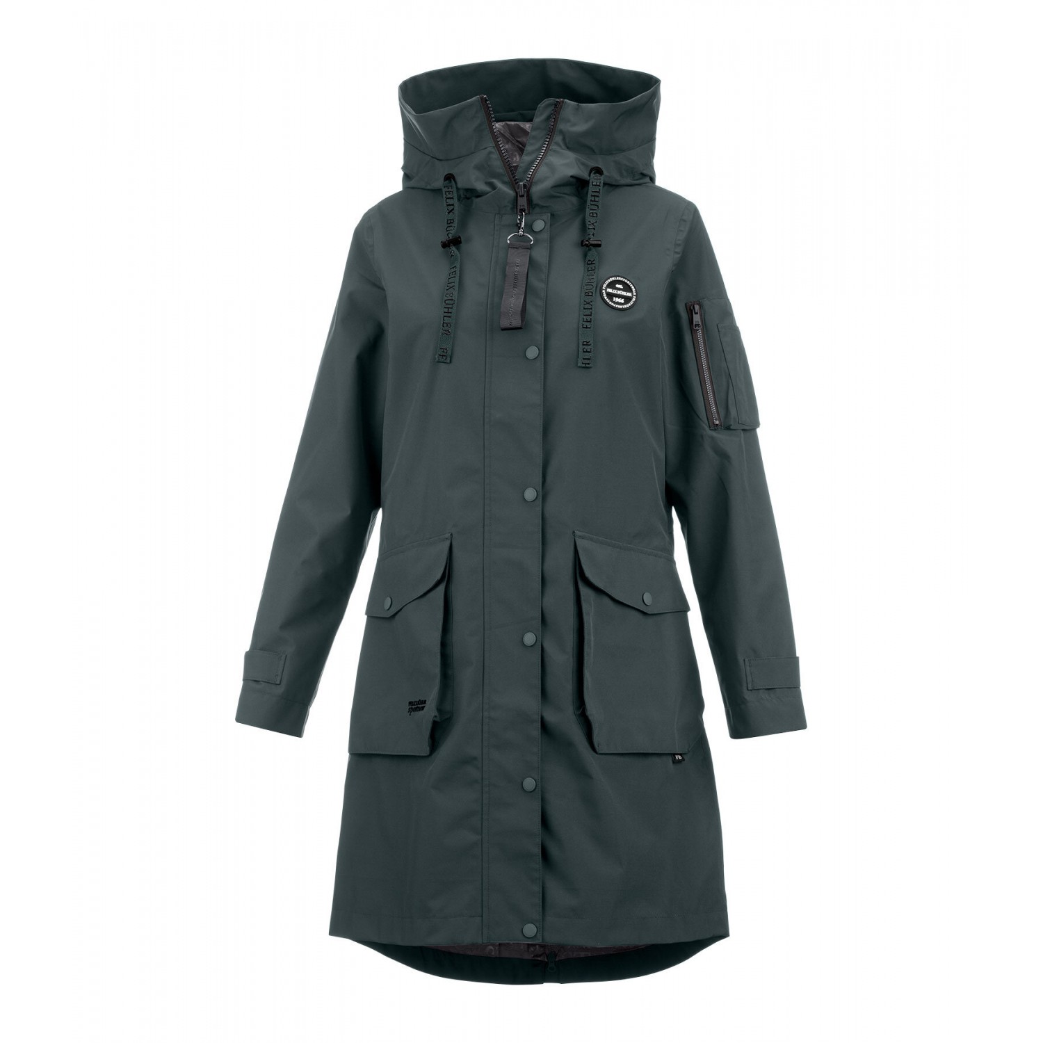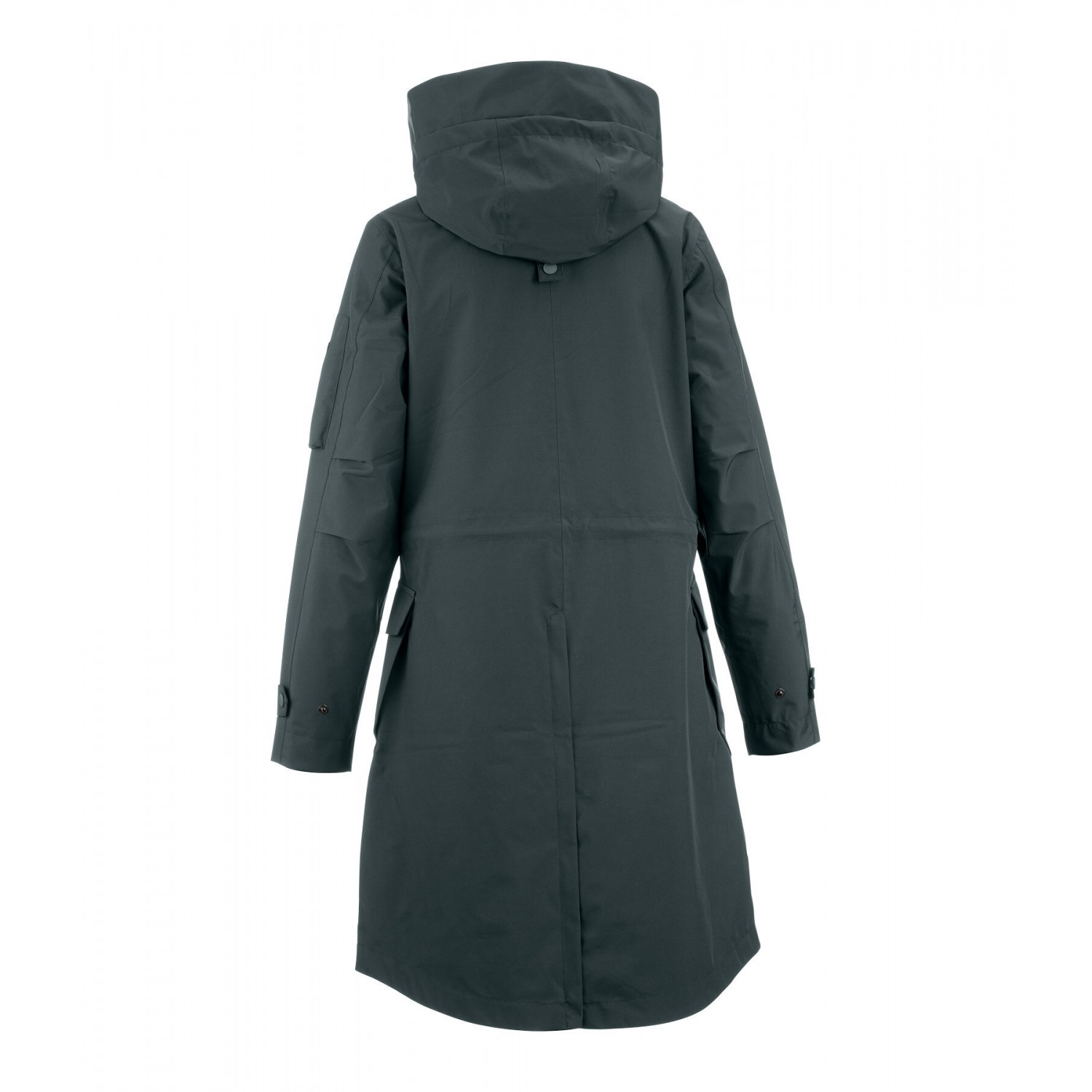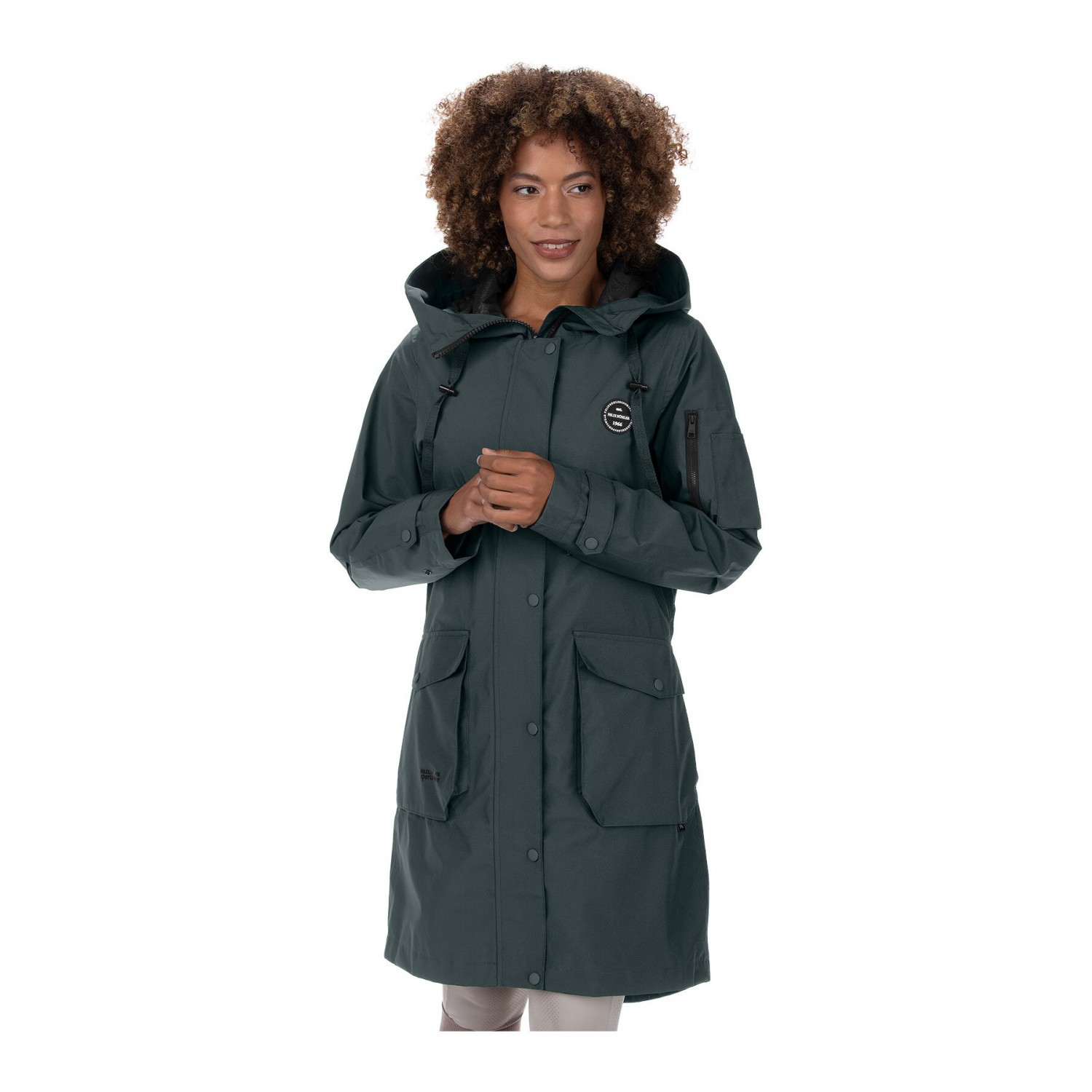 Повседневная с регулируемым капюшоном, который можно закрепить сзади. Очень удобный крой. Водонепроницаемая, ветрозащитная и дышащая. Скрытая двусторонняя молния, два больших накладных кармана с дополнительными боковыми карманами спереди, один карман на рукаве на молнии, один внутренний карман на молнии, регулируемая талия, регулируемые манжеты с эластичными ветрозащитными лентами и один длинный разрез с молнией сзади. 100% полиэстер.