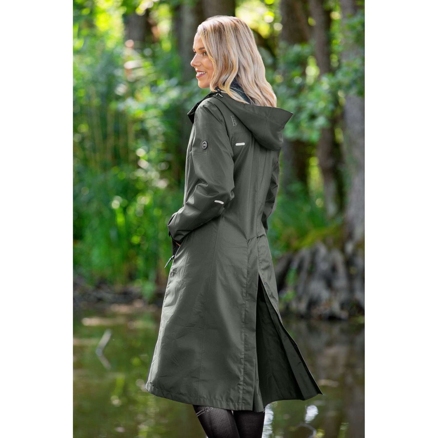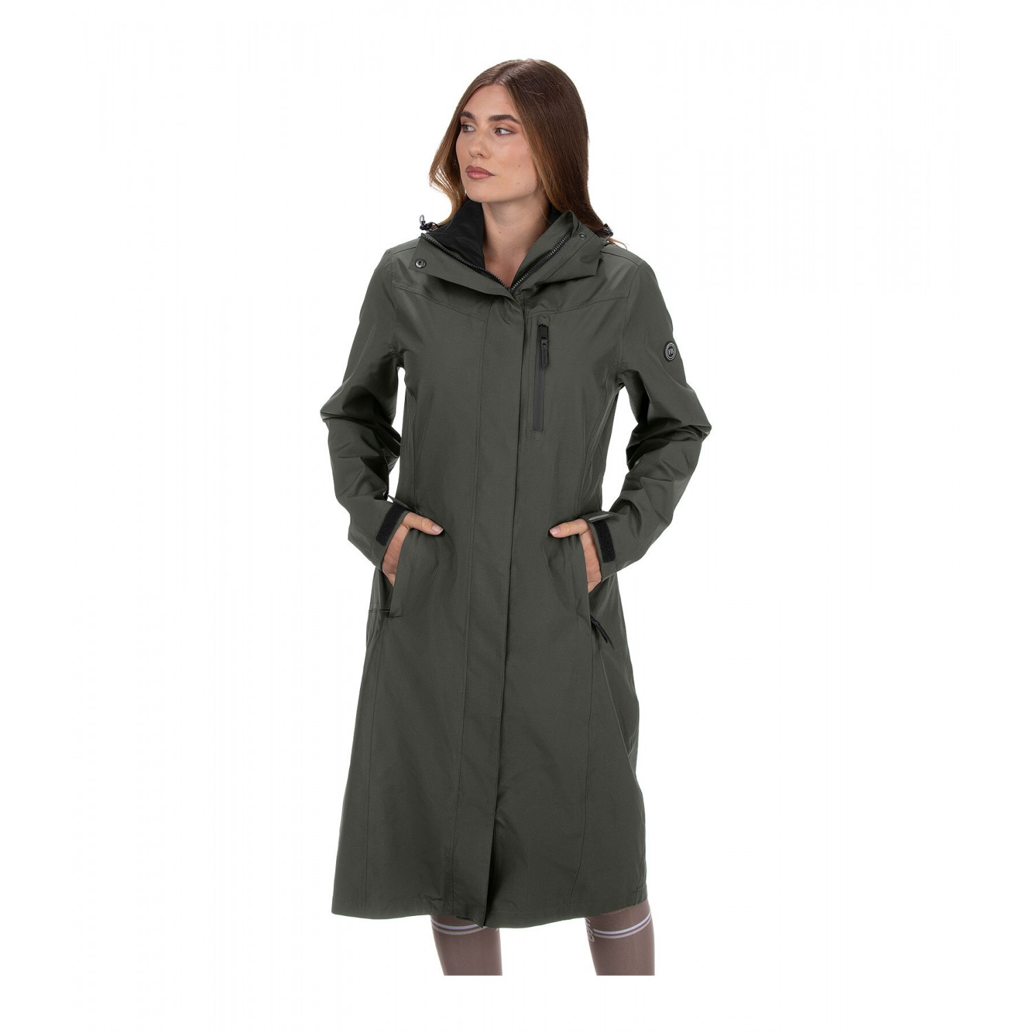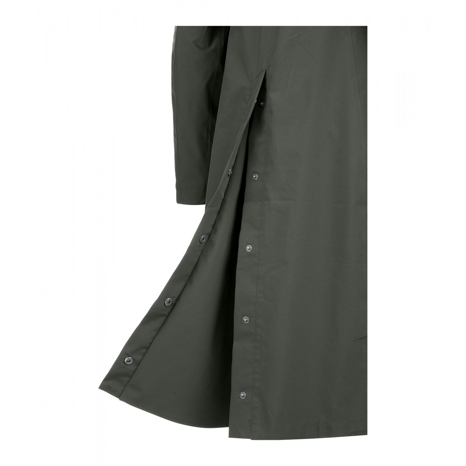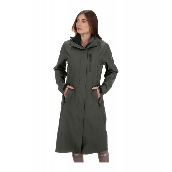 Плащ из высококачественной функциональной ткани, с подкладкой из дышащей сетки до пояса. Водонепроницаемая, ветрозащитная и дышащая ткань. Съемный и регулируемый капюшон, который можно закрепить сзади, двусторонняя молния с подкладкой и защитой подбородка, два передних кармана на молнии с подкладкой, один водонепроницаемый нагрудный карман на молнии, регулируемые манжеты, светоотражающие элементы и удлиненный разрез для верховой езды с застежками-кнопками сзади. 100% полиэстер.