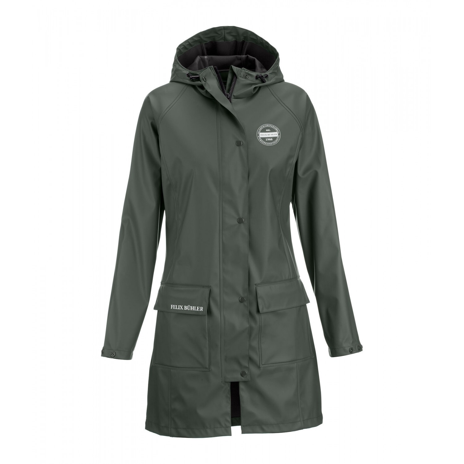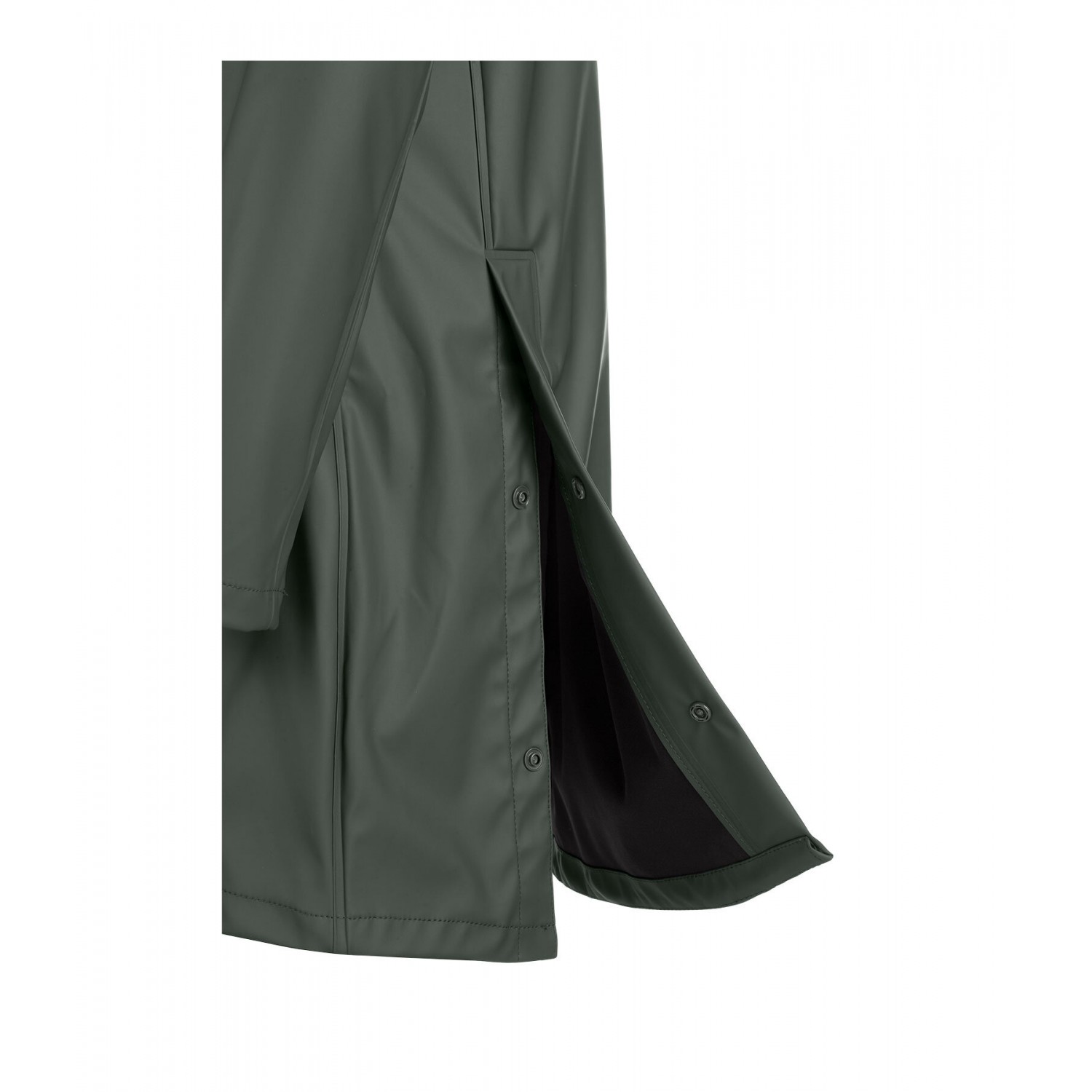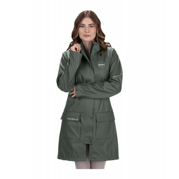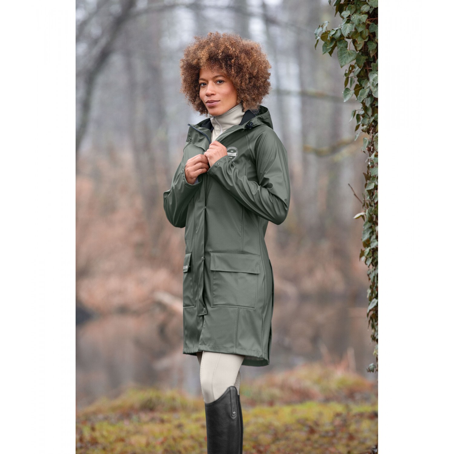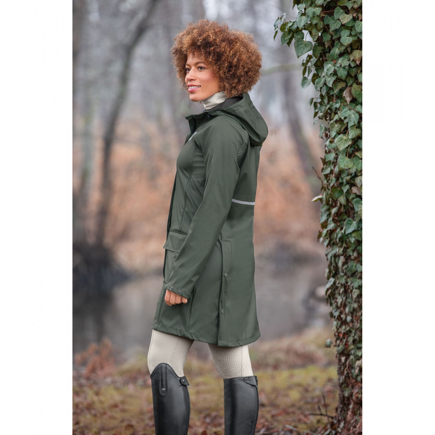 Длинный плащ с контрастной подкладкой. Водонепроницаемый и ветрозащитный. Скрытая 2-полосная передняя застежка-молния, 2 прорези для верховой езды с кнопками сзади, 2 кармана с клапанами, регулируемая ширина капюшона и рукава, защита подбородка, светоотражающие элементы спереди и сзади. 100% полиуретан.