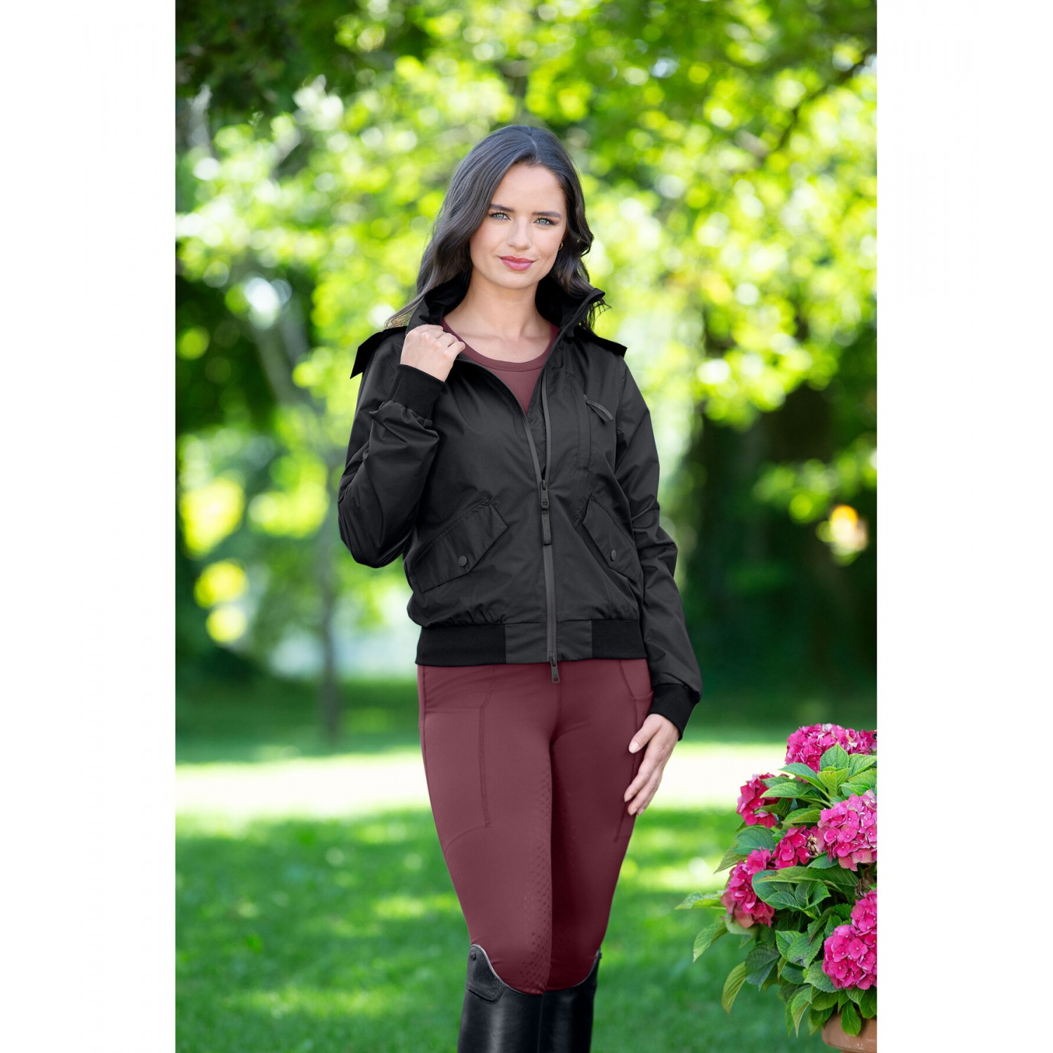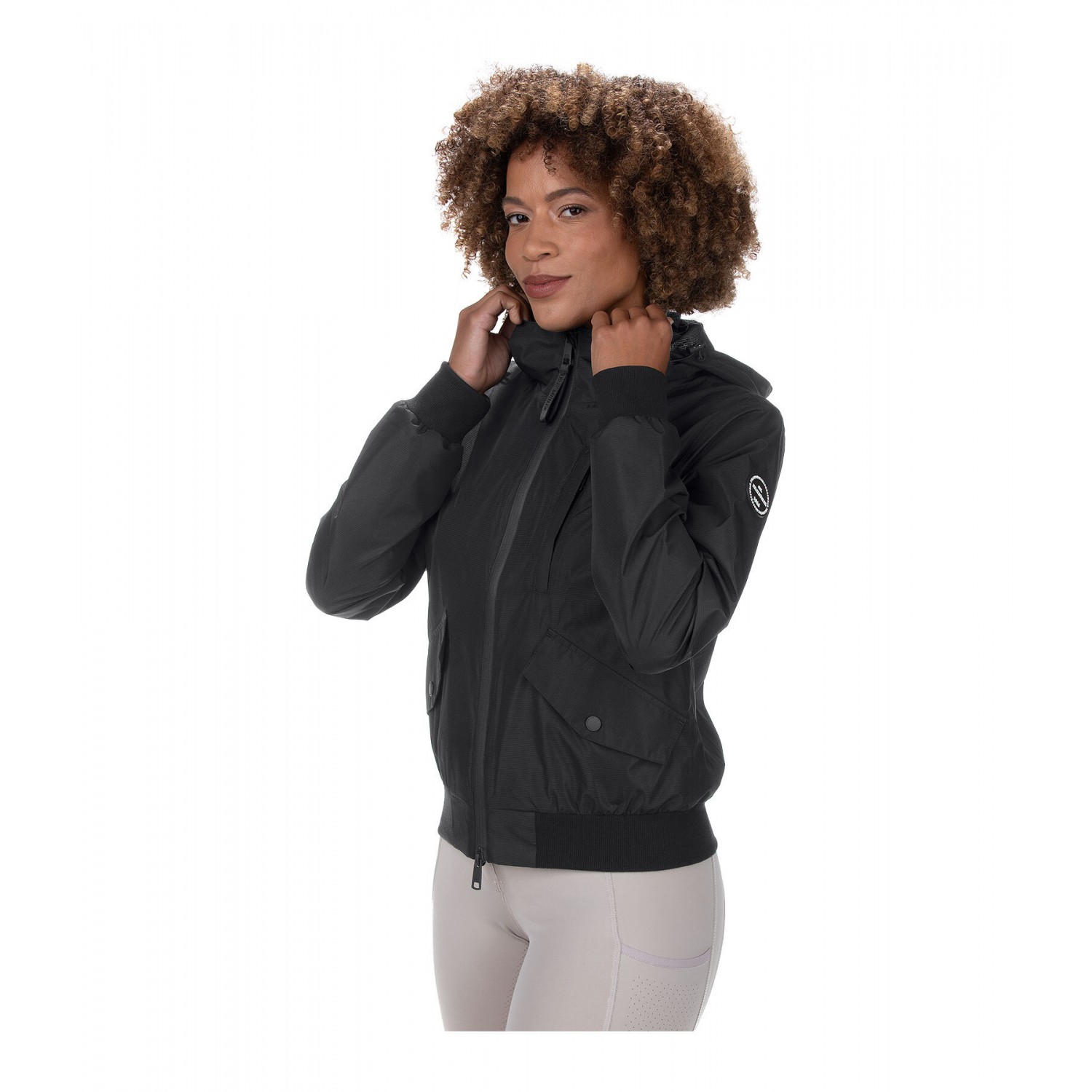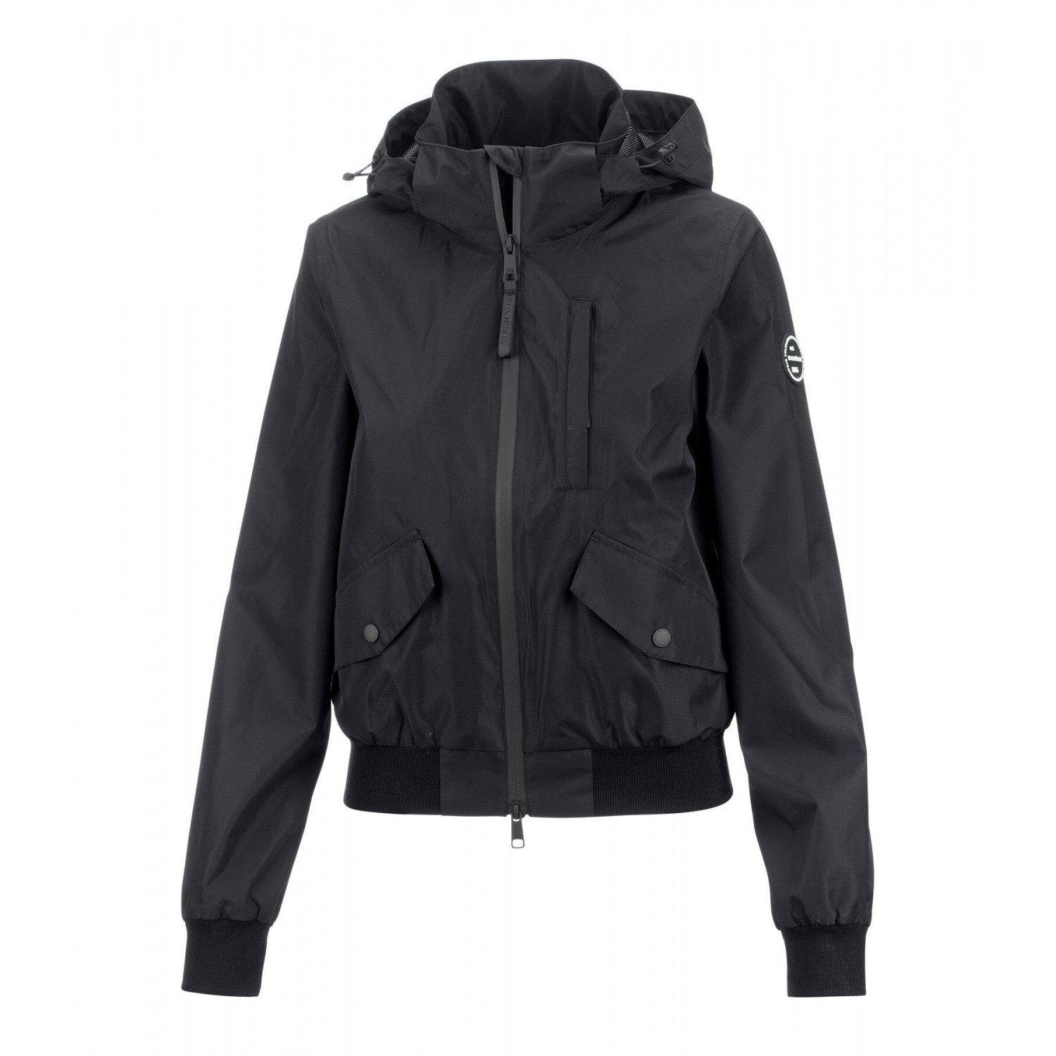 Водонепроницаемая и ветрозащитная куртка для верховой езды из дышащей, функциональной ткани с воротником-стойкой и регулируемым капюшоном, который можно отстегнуть или застегнуть на кнопки сзади. Дышащая сетчатая подкладка. Имеет подкладку, водонепроницаемую двустороннюю молнию спереди с защитой подбородка, два накладных кармана с застежками на кнопках и нагрудный карман на молнии. Мягкие трикотажные манжеты и нижний край. 100% полиэстер.