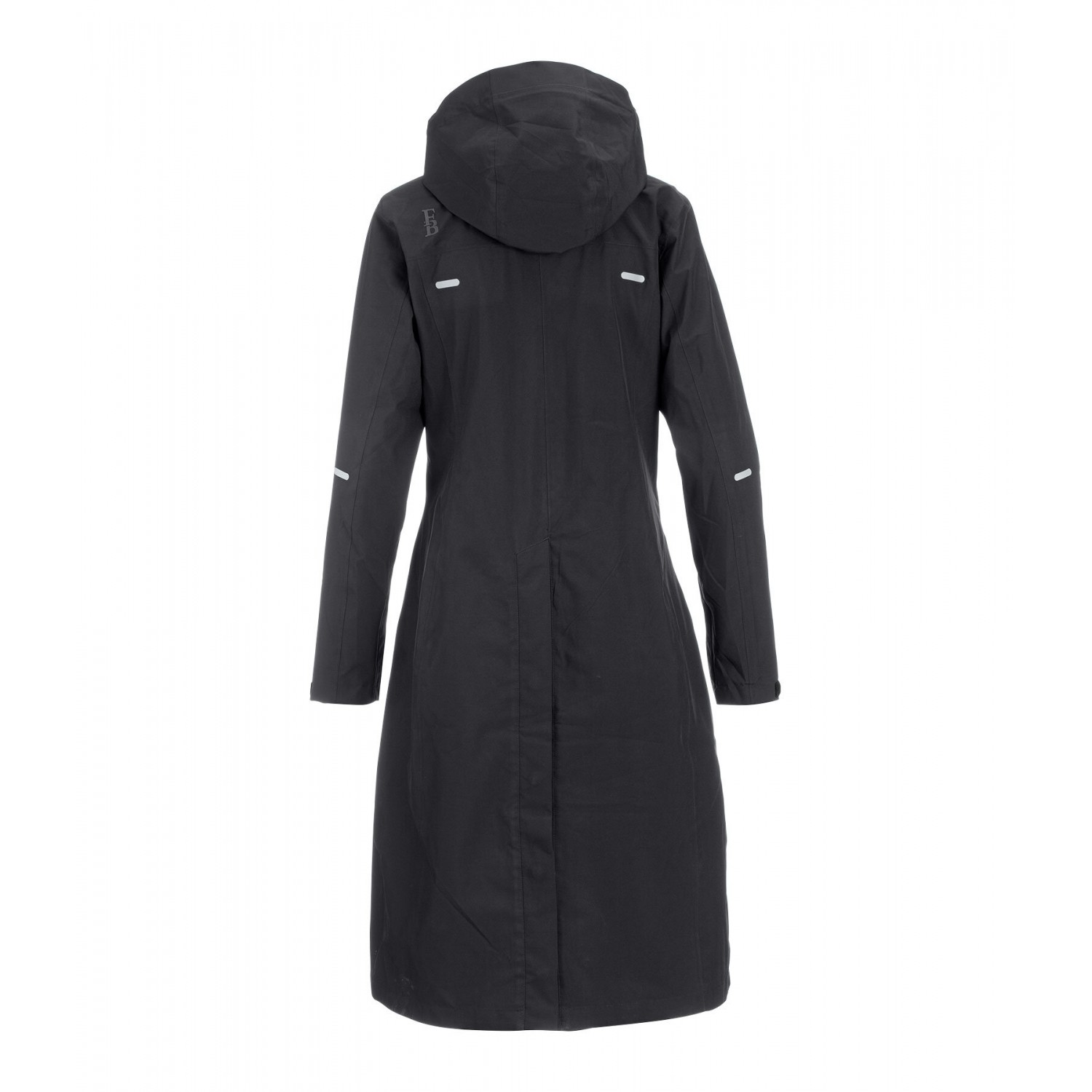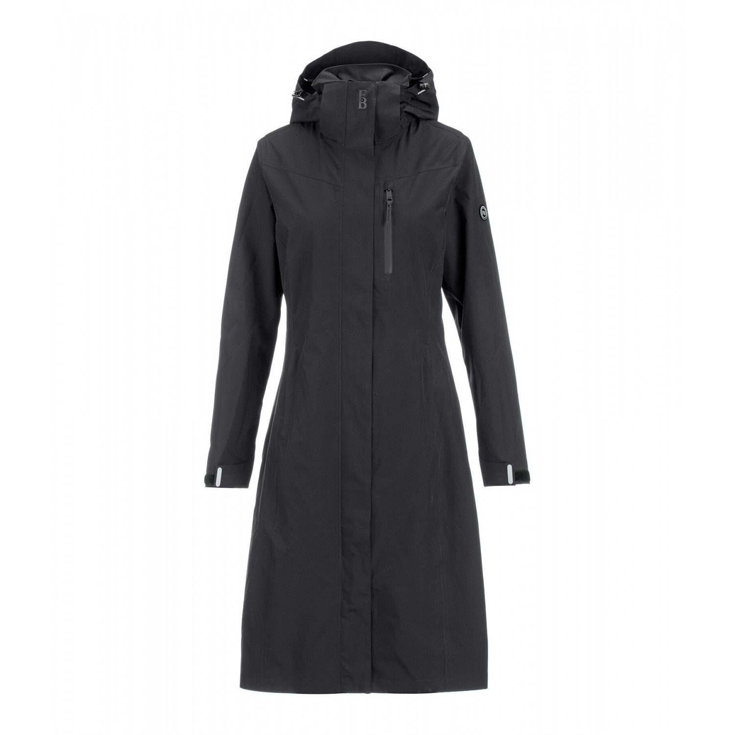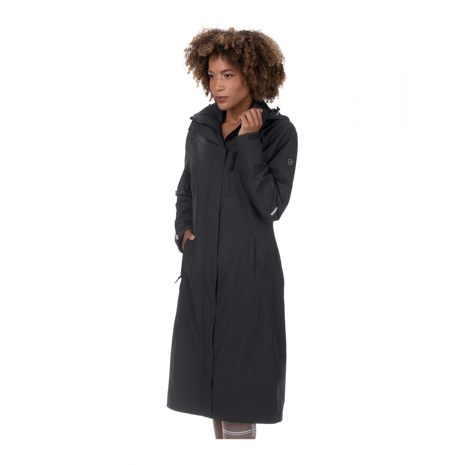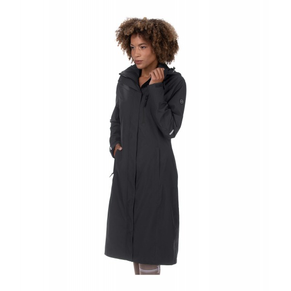 Плащ из высококачественной функциональной ткани, с подкладкой из дышащей сетки до пояса. Водонепроницаемая, ветрозащитная и дышащая ткань. Съемный и регулируемый капюшон, который можно закрепить сзади, двусторонняя молния с подкладкой и защитой подбородка, два передних кармана на молнии с подкладкой, один водонепроницаемый нагрудный карман на молнии, регулируемые манжеты, светоотражающие элементы и удлиненный разрез для верховой езды с застежками-кнопками сзади. 100% полиэстер.