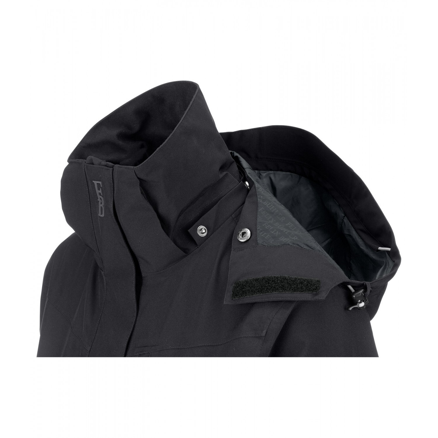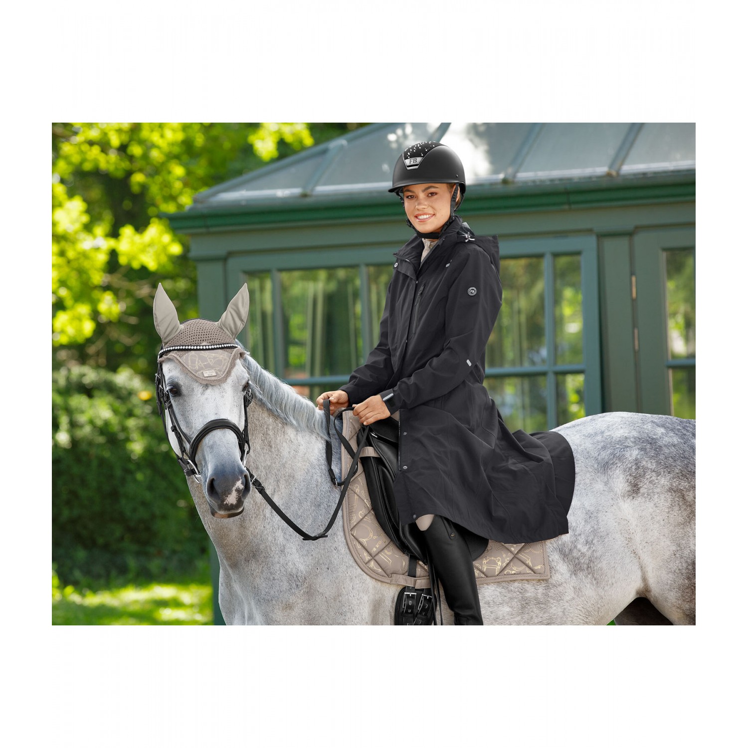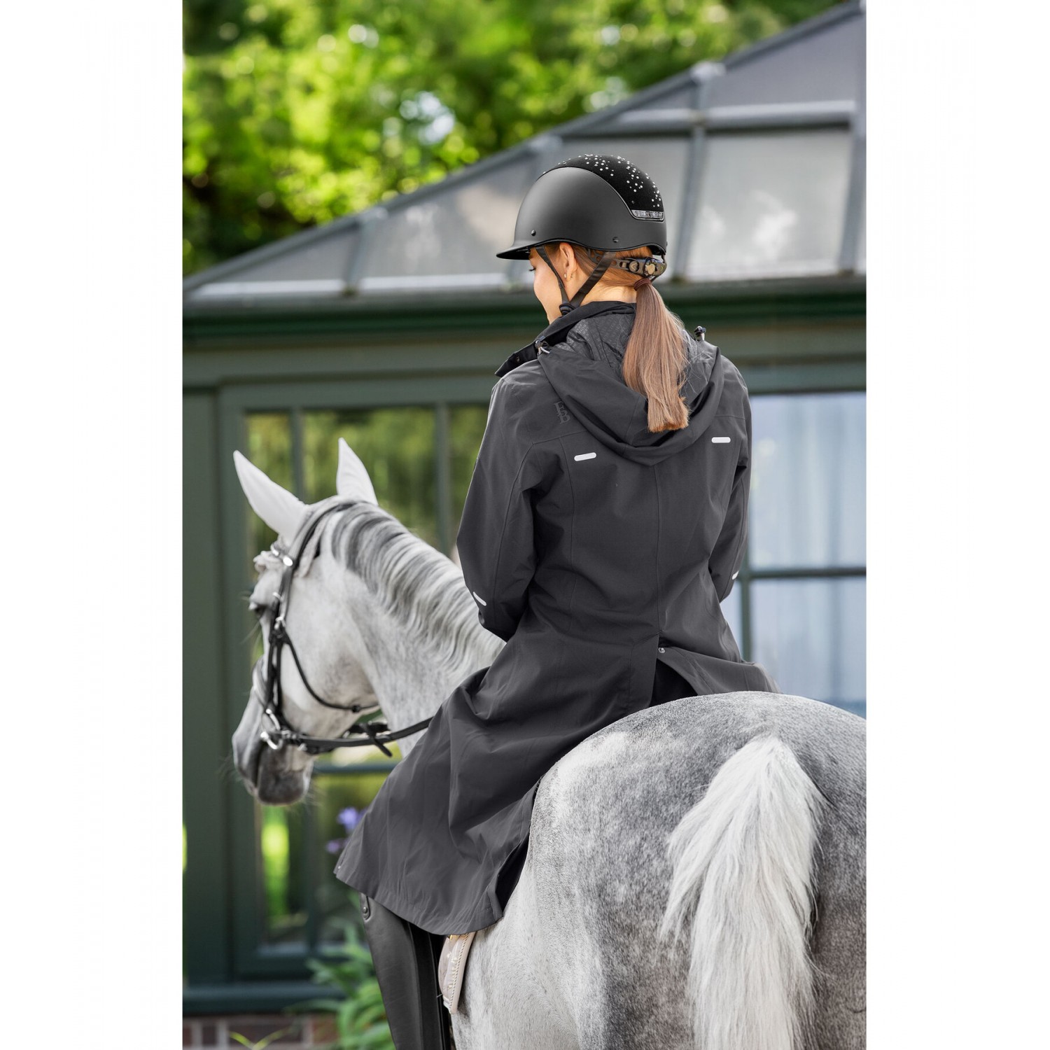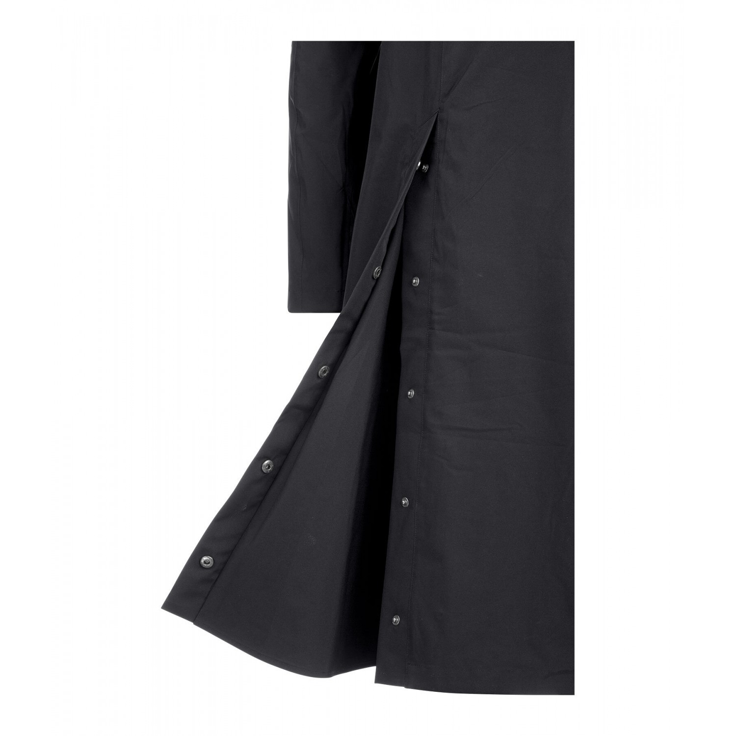 Плащ из высококачественной функциональной ткани, с подкладкой из дышащей сетки до пояса. Водонепроницаемая, ветрозащитная и дышащая ткань. Съемный и регулируемый капюшон, который можно закрепить сзади, двусторонняя молния с подкладкой и защитой подбородка, два передних кармана на молнии с подкладкой, один водонепроницаемый нагрудный карман на молнии, регулируемые манжеты, светоотражающие элементы и удлиненный разрез для верховой езды с застежками-кнопками сзади. 100% полиэстер.