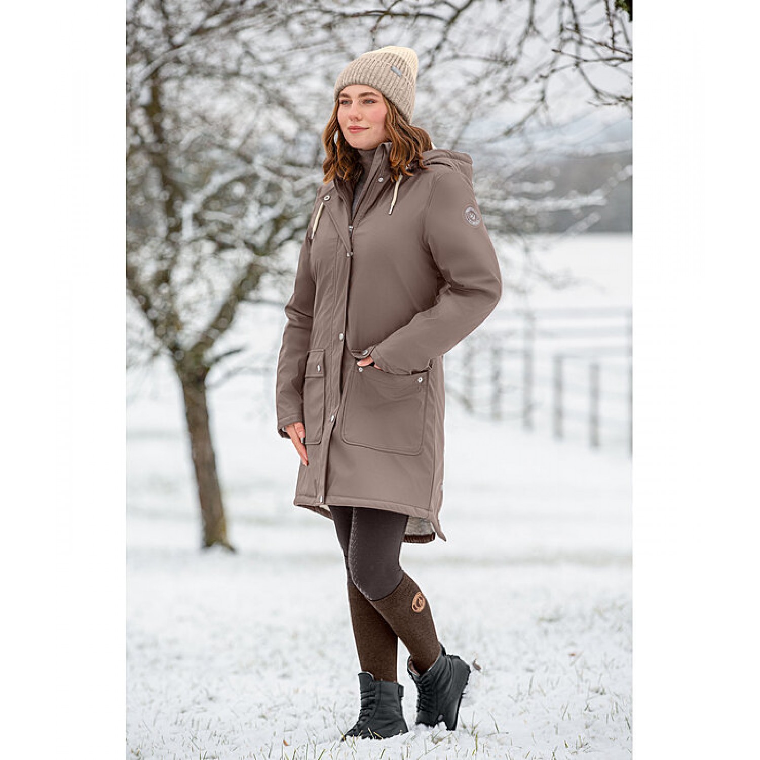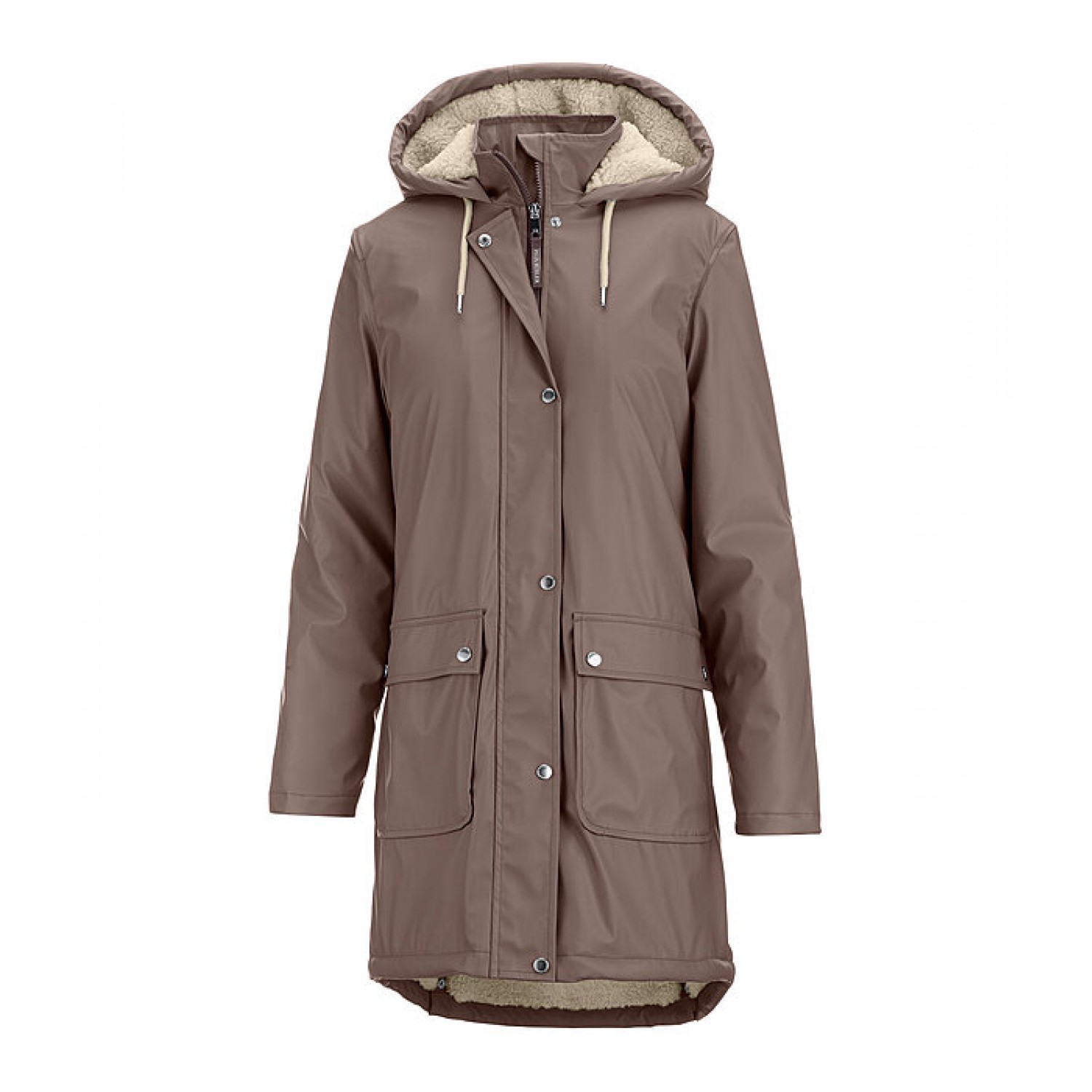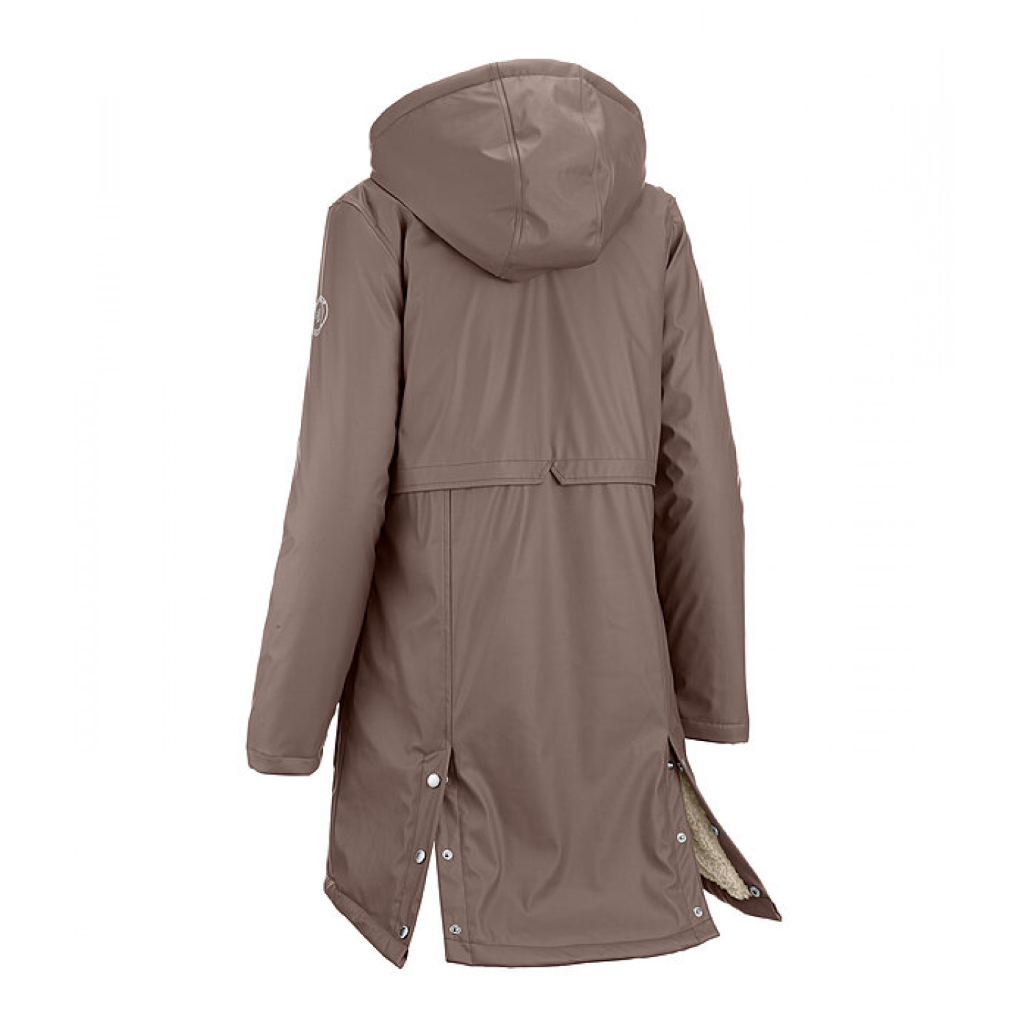 Супер стильный плащ с капюшоном и теплой внутренней частью из приятного мягкого плюша. Водо и ветрозащитный. Потайная двусторонняя молния спереди с защитой подбородка, 1 внутренний карман на молнии, 2 кармана с клапанами на кнопках спереди, регулируемый капюшон, который также имеет подкладку из плюшевого меха и может прикрепляться к спине, более длинный вырез сзади с 2 разрезы для верховой езды на кнопках, принт Felix Bühler на рукаве. Снаружи 100% полиуретан, внутри 100% полиэстер.