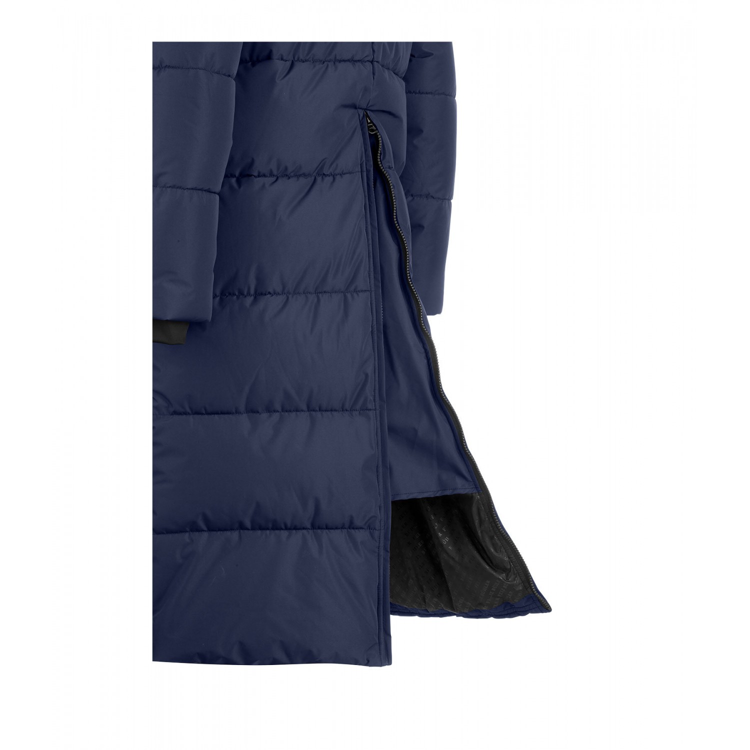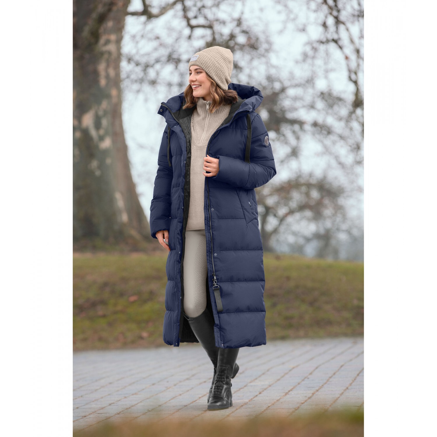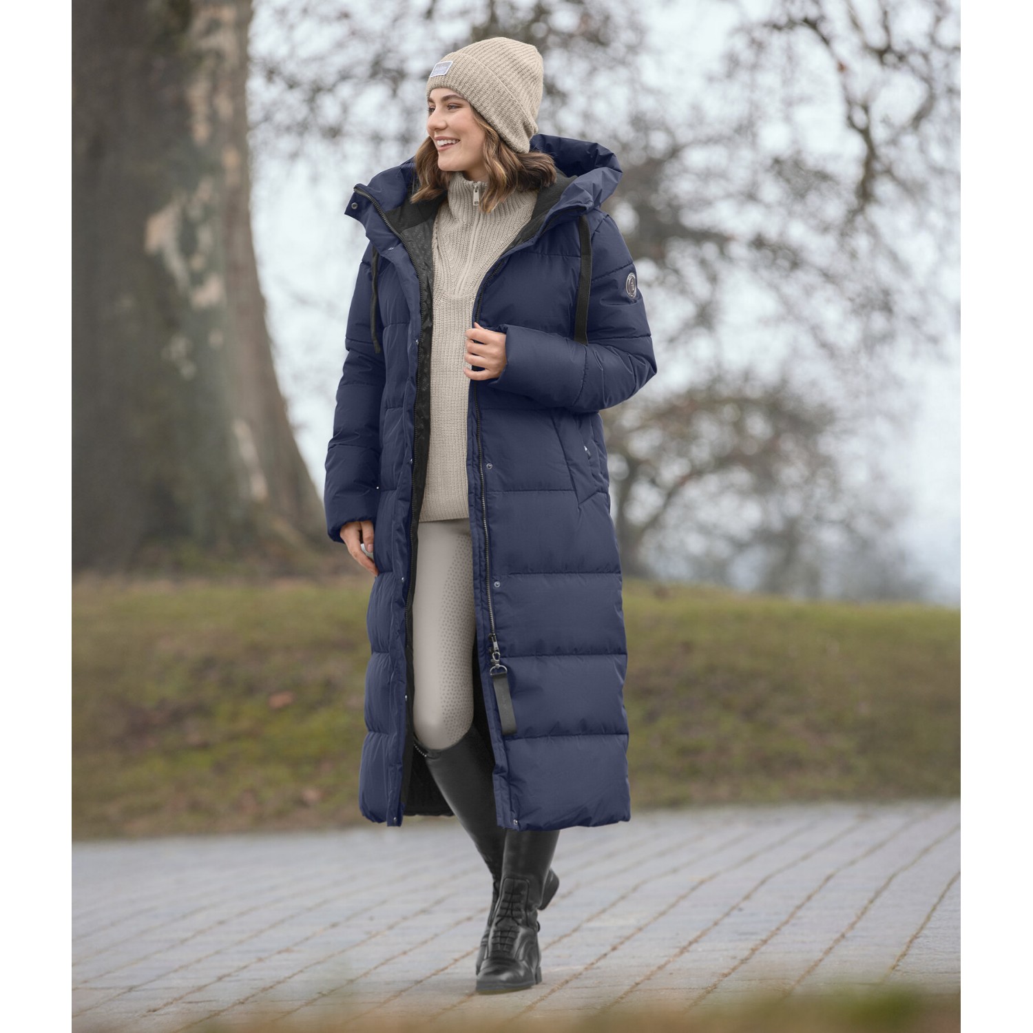 Чрезвычайно теплое пальто для верховой езды удобного повседневного кроя. Водо- и ветроустойчивость. Мягкая набивка из искусственного пуха, потайная двусторонняя молния спереди с защитой подбородка, 2 потайных кармана на молнии спереди с подкладкой из мягкого флиса, эластичные манжеты, шнур на талии и длинный разрез на молнии сзади. Очень высокий регулируемый капюшон с флисовой подкладкой можно прикрепить к спине. Высококачественный значок Felix Bühler на груди. 100% полиэстер.