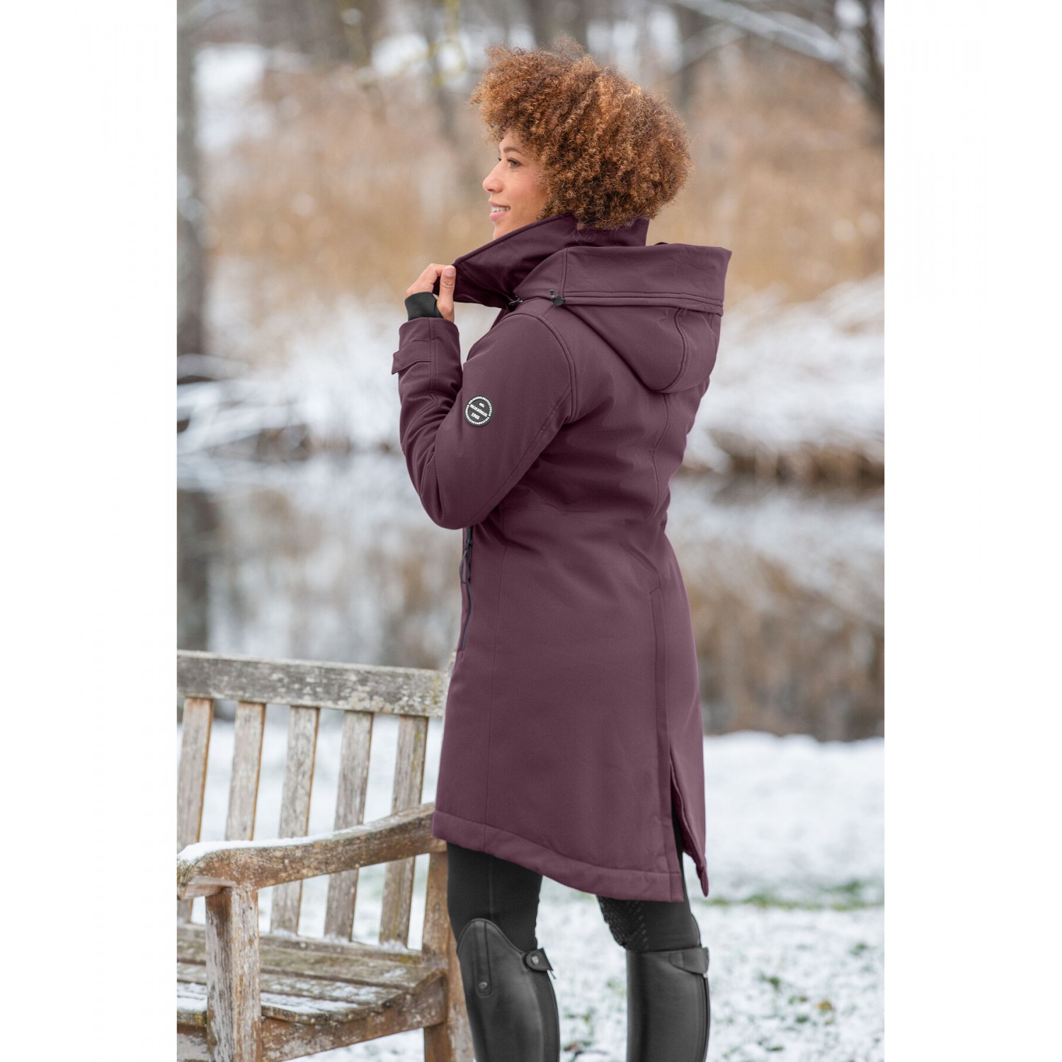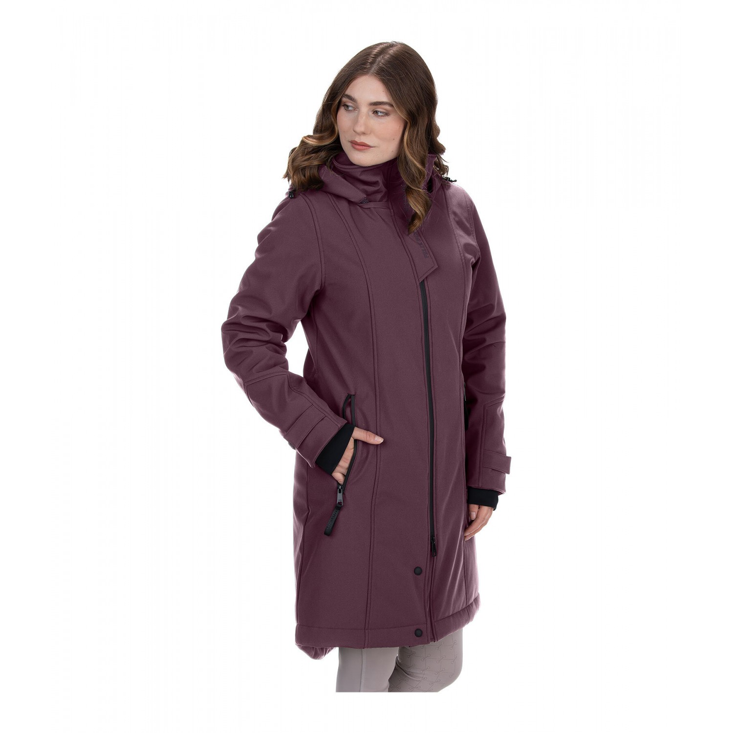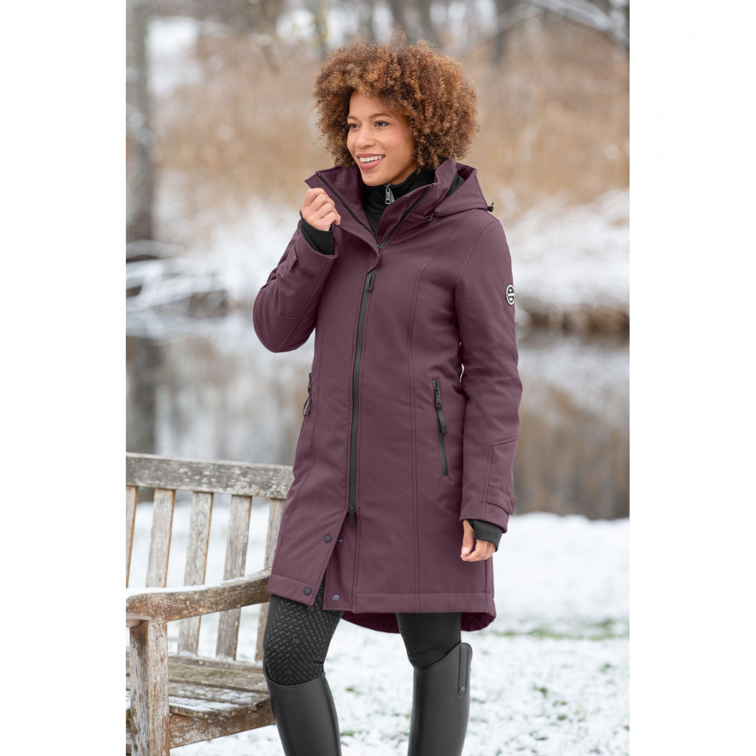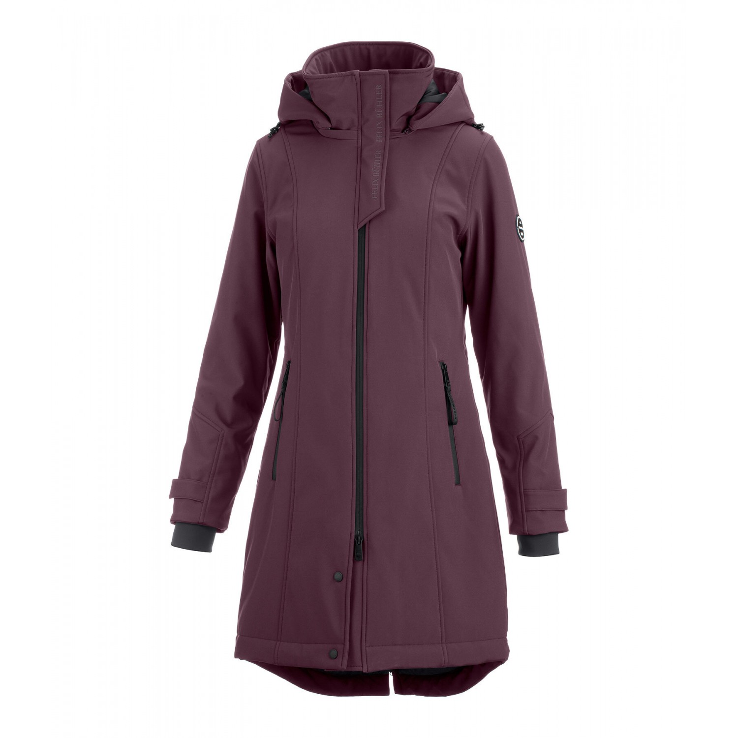 Водоотталкивающее и ветрозащитное пальто из софтшелла с воротником-стойкой, съемным регулируемым капюшоном на трикотажной подкладке, фиксируемым сзади на кнопке. Водонепроницаемые молнии, двусторонняя молния спереди, передние карманы на молнии, регулируемые манжеты с эластичной ветрозащитой, регулируемая ширина талии и 1 разрез для верховой езды на молнии сзади. Согревает благодаря стеганому наполнителю из мягкого искусственного пуха, 1 внутренний карман на молнии. Значок Felix Bühler на рукаве и принт на нахлесте воротника. 94% полиэстер, 6% эластан.