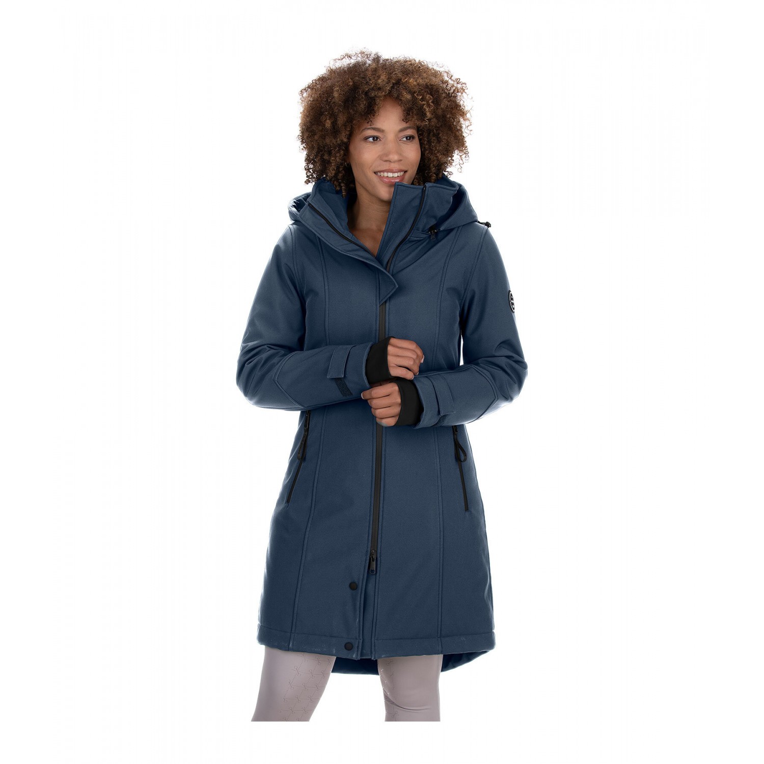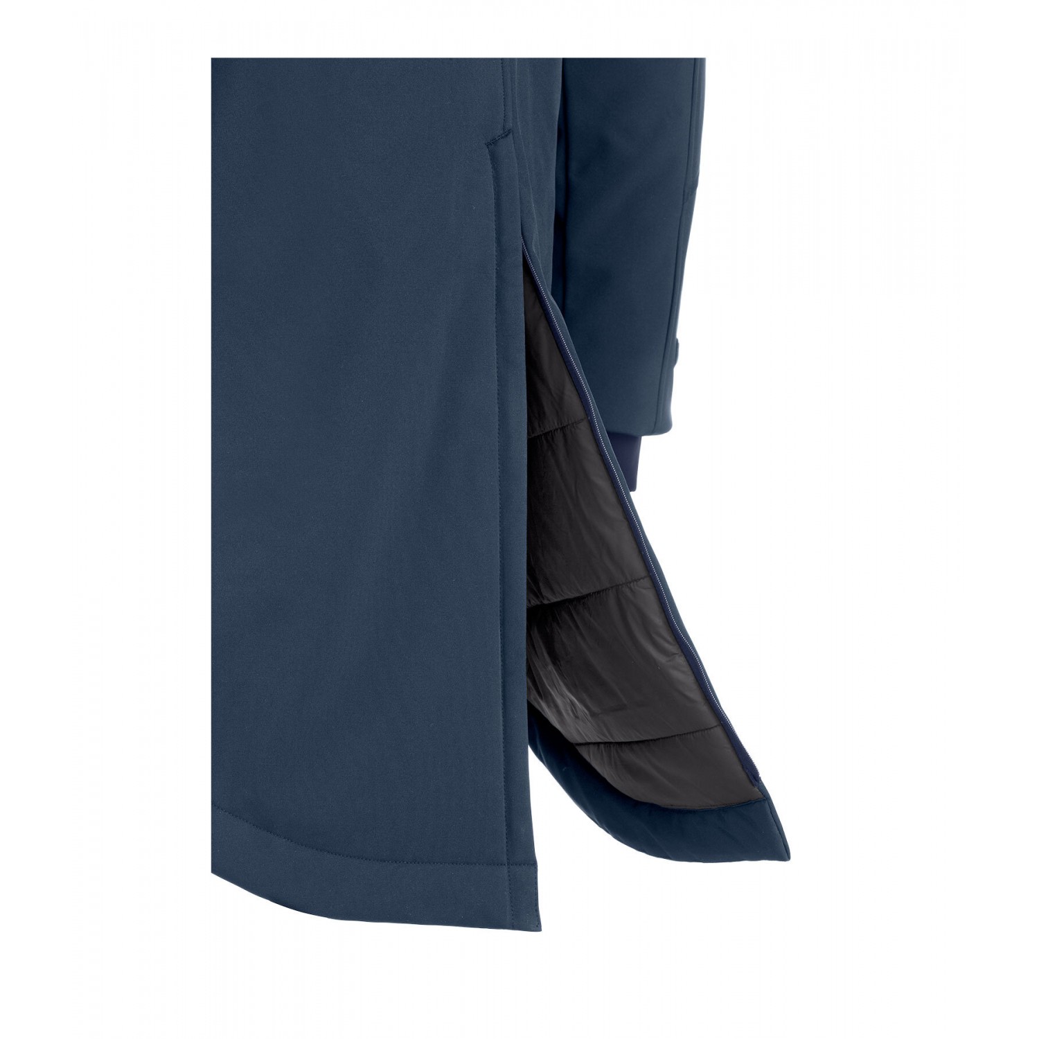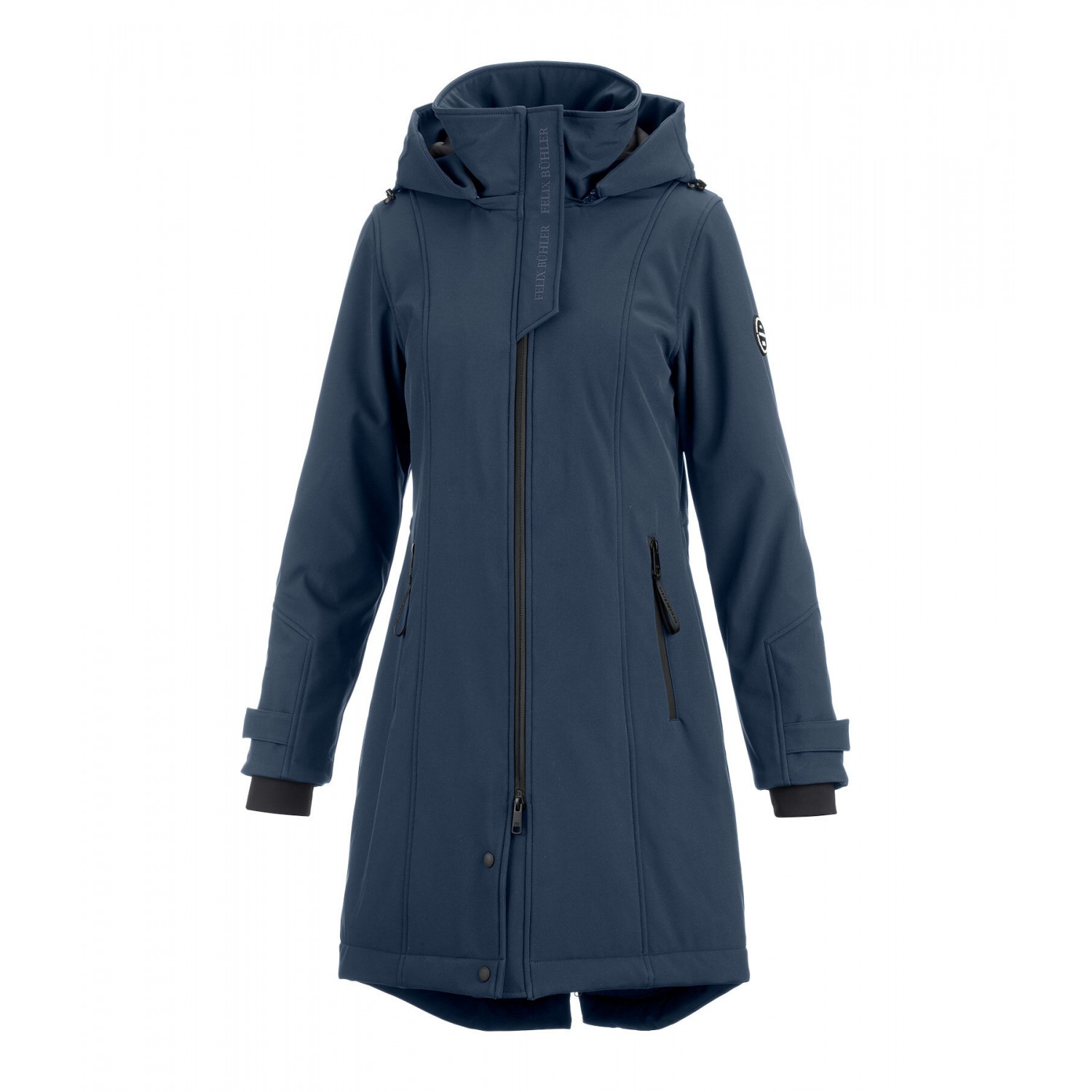 Водоотталкивающее и ветрозащитное пальто из софтшелла с воротником-стойкой, съемным регулируемым капюшоном на трикотажной подкладке, фиксируемым сзади на кнопке. Водонепроницаемые молнии, двусторонняя молния спереди, передние карманы на молнии, регулируемые манжеты с эластичной ветрозащитой, регулируемая ширина талии и 1 разрез для верховой езды на молнии сзади. Согревает благодаря стеганому наполнителю из мягкого искусственного пуха, 1 внутренний карман на молнии. Значок Felix Bühler на рукаве и принт на нахлесте воротника. 94% полиэстер, 6% эластан.