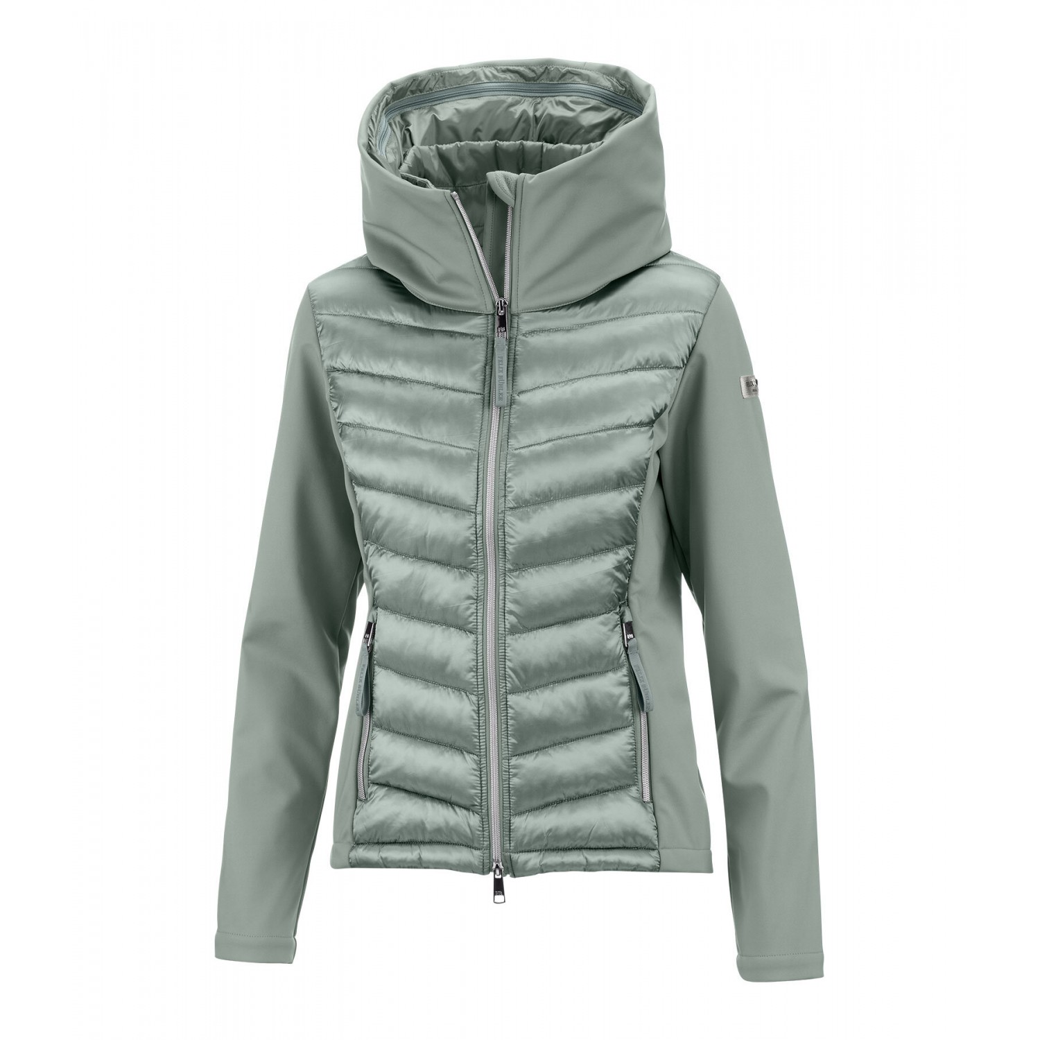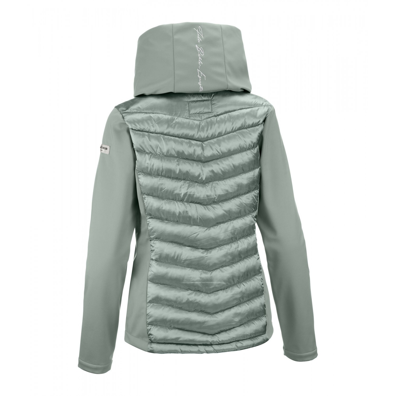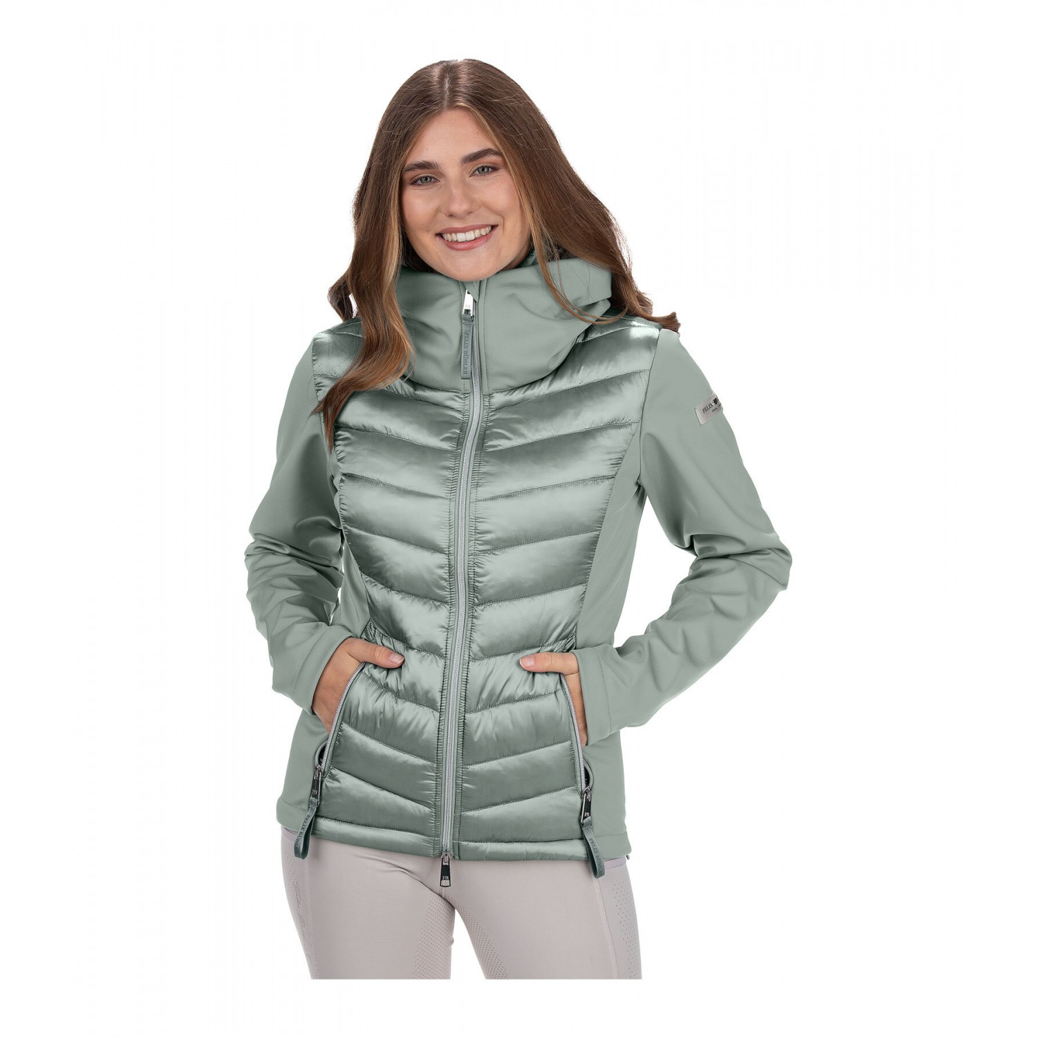 Ветрозащитная комбинированная куртка для верховой езды из мягкого, мерцающего стеганого материала с легким наполнителем из искусственного пуха, рукавами и боковыми вставками из эластичного софтшелла. Двойной воротник, убирающийся, стеганый капюшон, с застежкой-молнией и красивой вышивкой. Блестящая двухсторонняя молния спереди с подкладкой, защитой подбородка и 2 карманами на молнии спереди. Регулируемая ширина подола. Стеганый материал 100% нейлон, вставки softshell 92% полиэстер и 8% эластан.