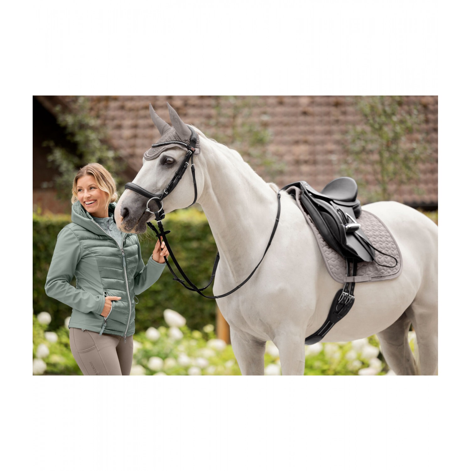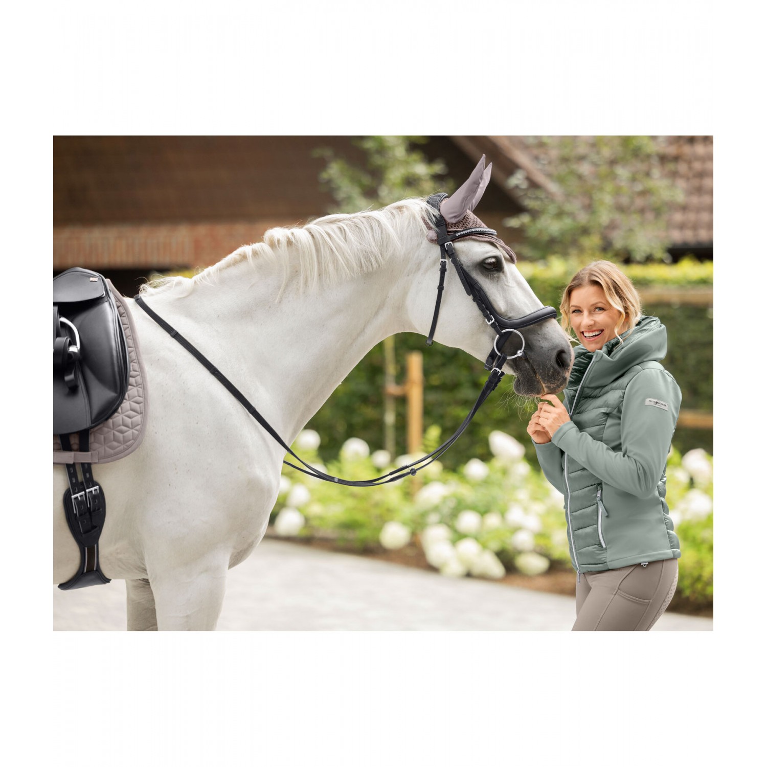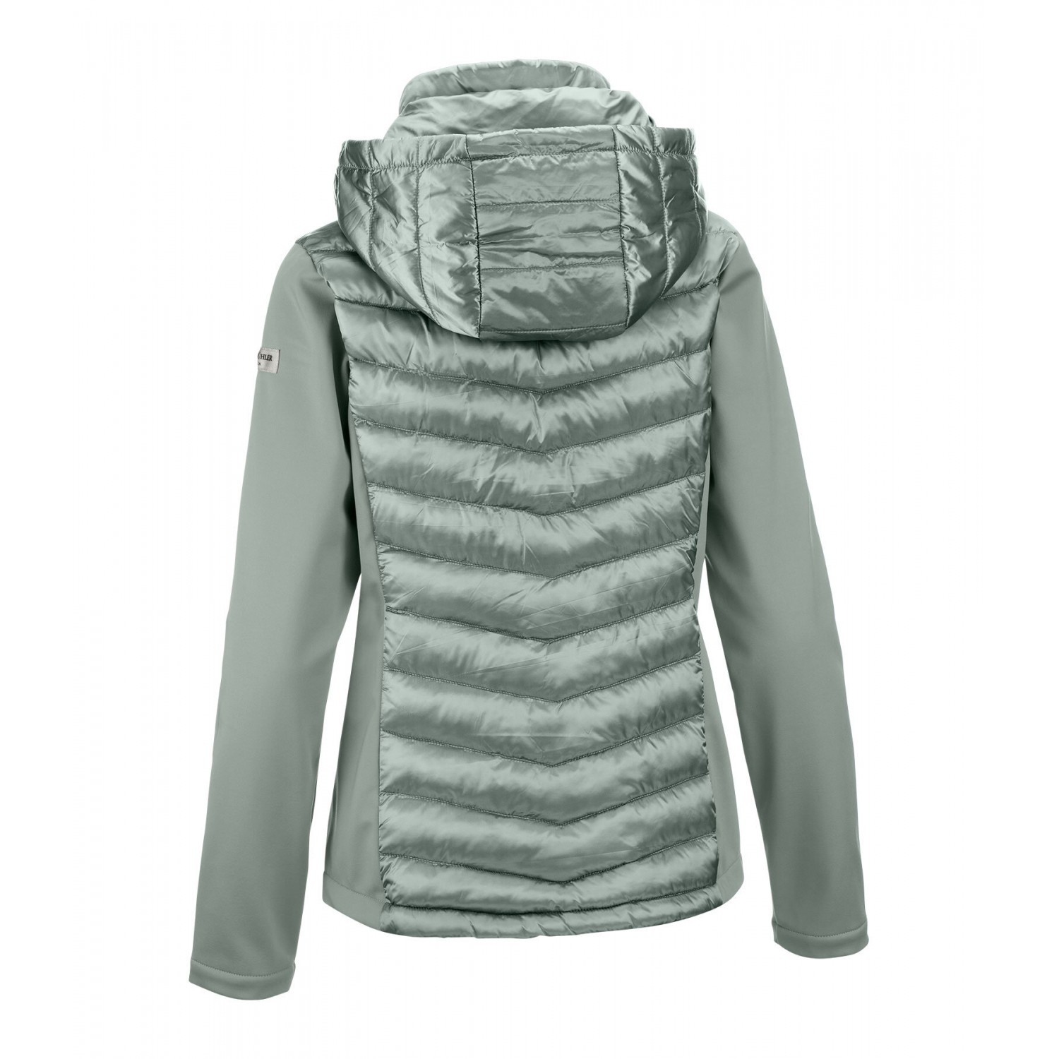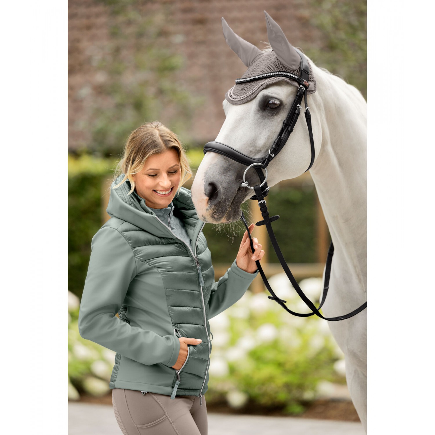 Ветрозащитная комбинированная куртка для верховой езды из мягкого, мерцающего стеганого материала с легким наполнителем из искусственного пуха, рукавами и боковыми вставками из эластичного софтшелла. Двойной воротник, убирающийся, стеганый капюшон, с застежкой-молнией и красивой вышивкой. Блестящая двухсторонняя молния спереди с подкладкой, защитой подбородка и 2 карманами на молнии спереди. Регулируемая ширина подола. Стеганый материал 100% нейлон, вставки softshell 92% полиэстер и 8% эластан.