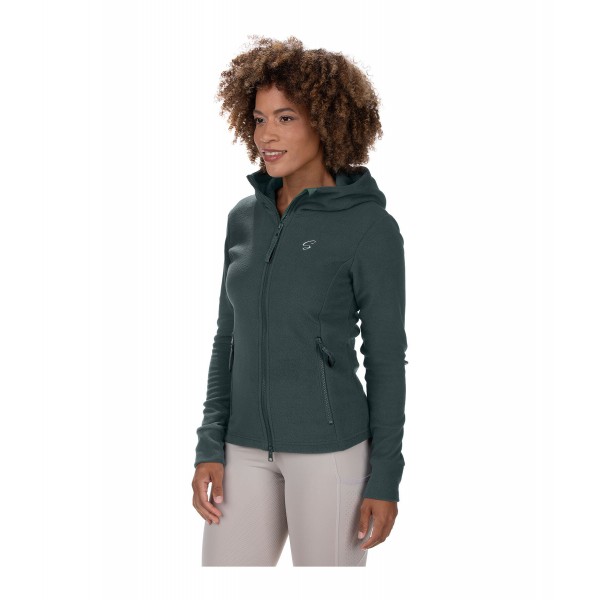 Мягкая флисовая куртка с капюшоном. Двусторонняя молния на подкладке спереди, с защитой подбородка, 2 кармана на молнии спереди и изящная вышивка логотипа на груди. Немного длиннее сзади и обработано антипиллинговой обработкой. 100% полиэстер.