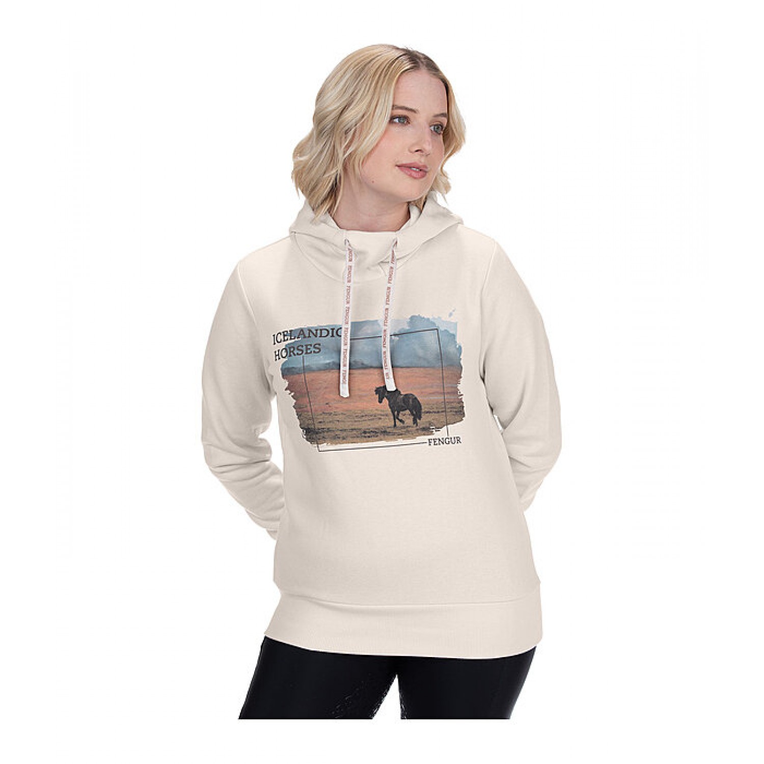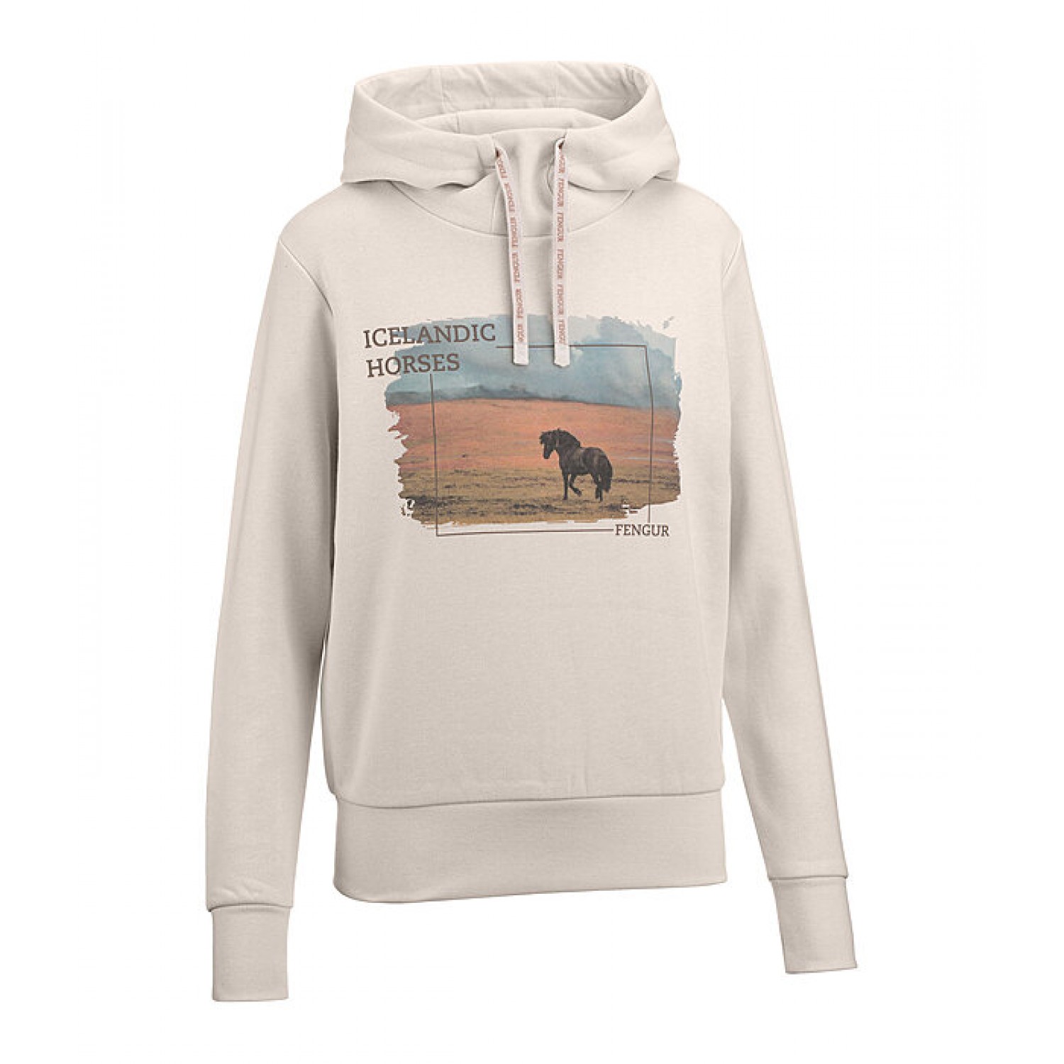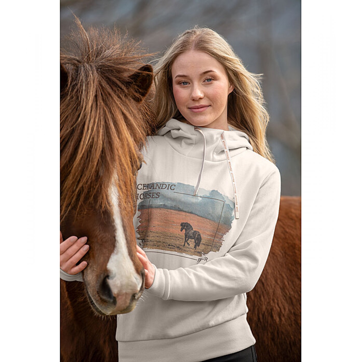 Супермягкая толстовка с капюшоном и изображением исландской лошади на груди. Регулируемый капюшон с завязками. Воротник, подол и манжеты – резинка. Состав: 65% полиэстер, 35% хлопок.