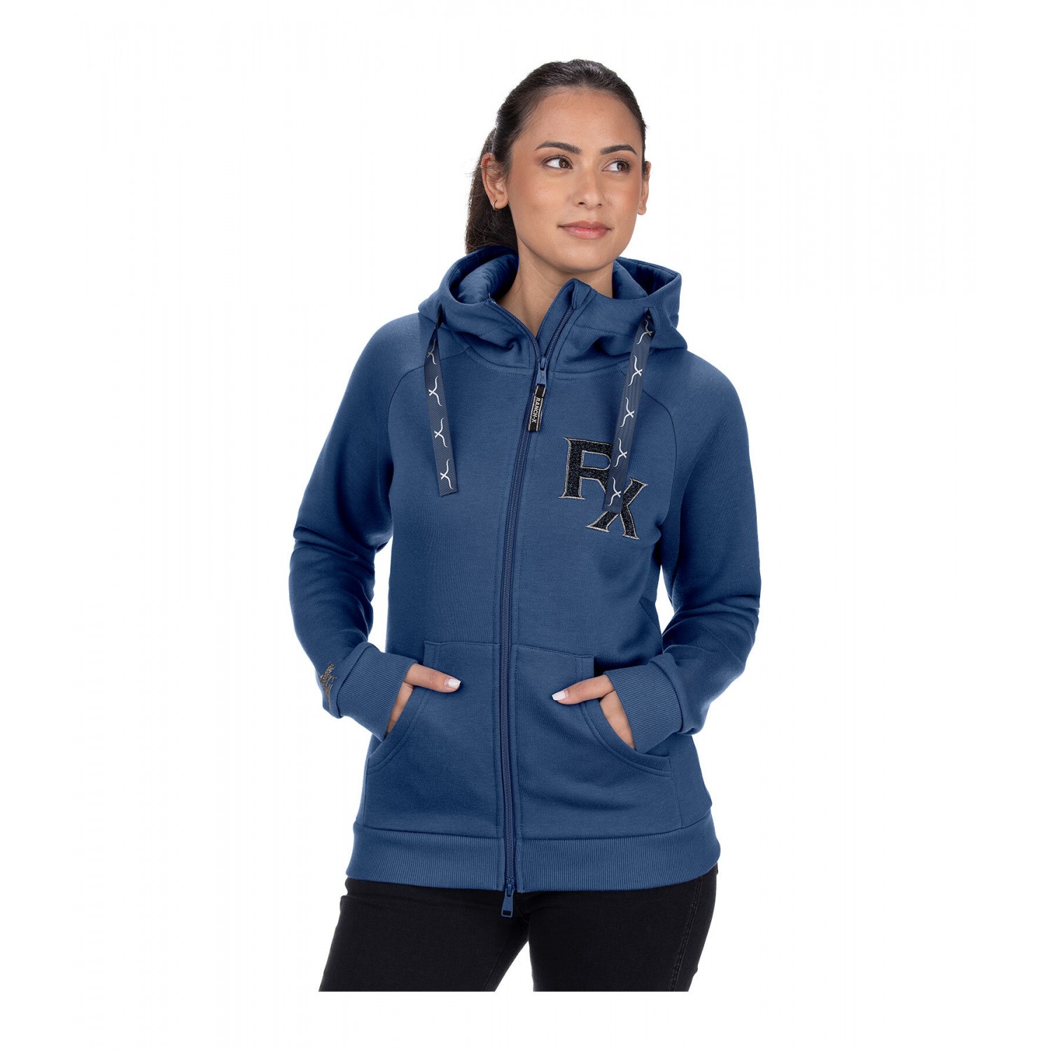 Стильная толстовка с капюшоном, большим блестящим логотипом на груди, карманом-кенгуру спереди и двусторонней молнией. Блестящая вышивка на капюшоне и рукавах. 65% полиэстер, 35% хлопок.