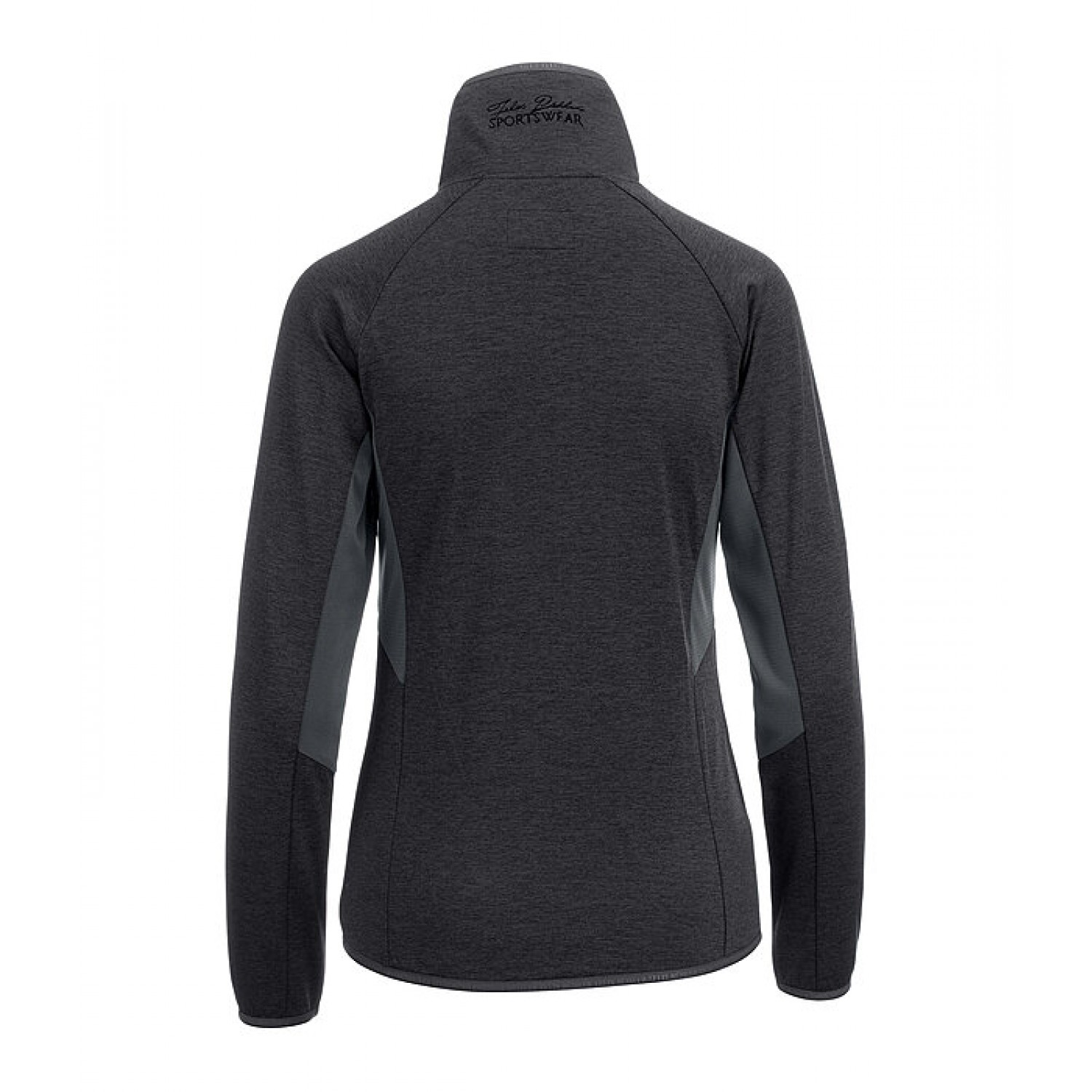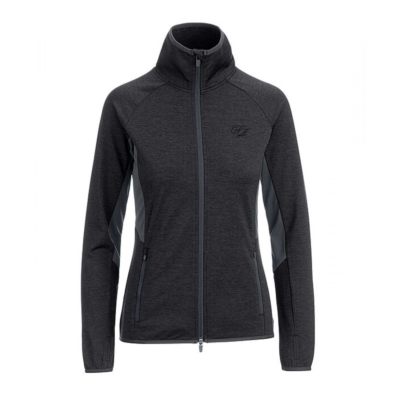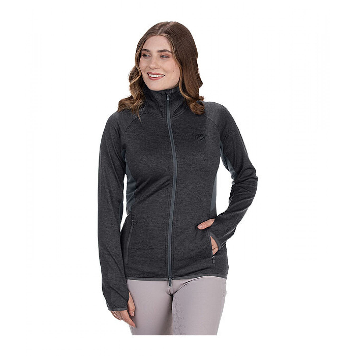 Мягкая, эластичная спортивная куртка меланжевого цвета. Дышащая и быстросохнущая. Сетчатые вставки под мышками и по бокам, начес на внутренней стороне, два передних кармана на молнии, двусторонняя молния спереди с защитой подбородка, эластичные манжеты на воротнике-стойке, подоле и рукавах. 92% полиэстер, 8% эластан.