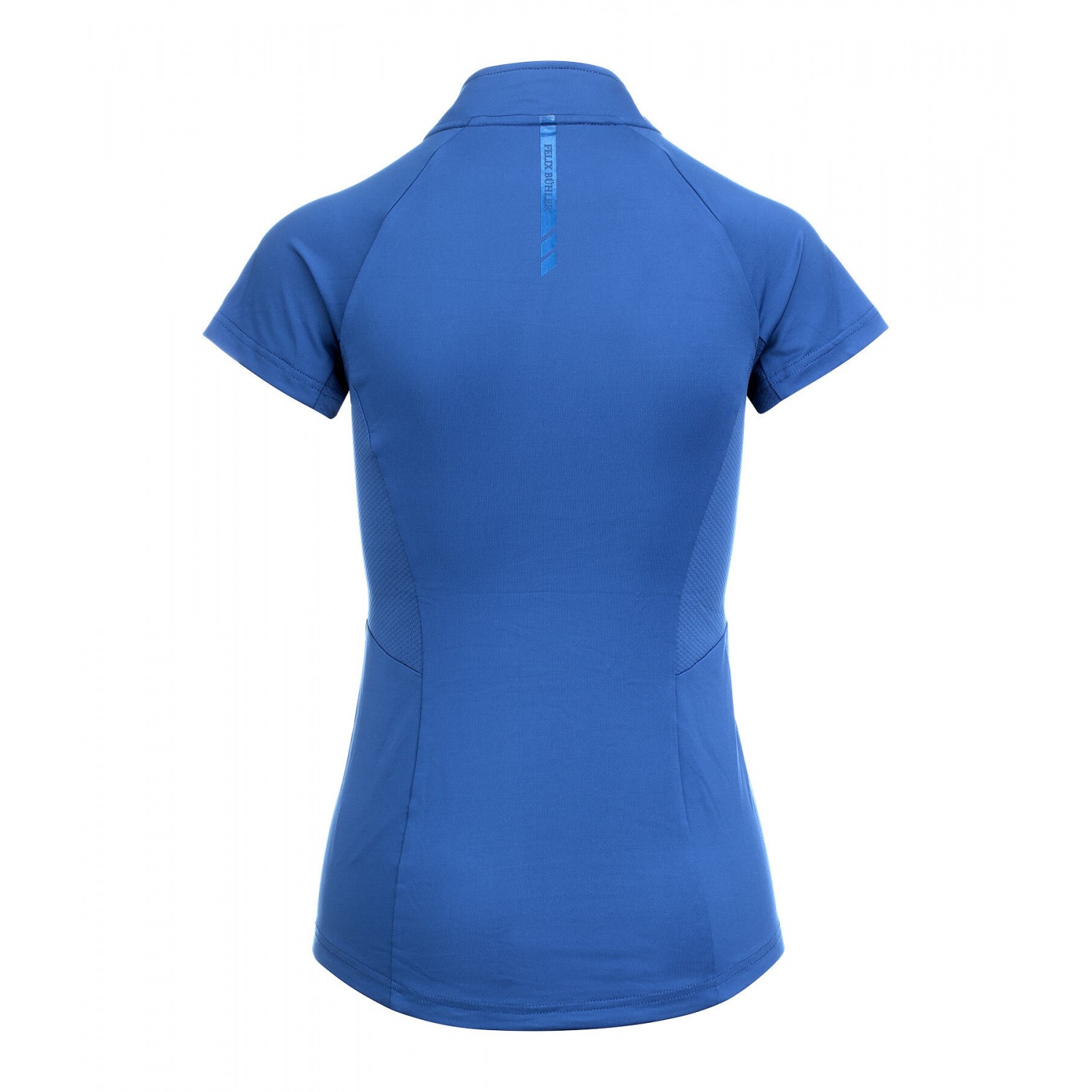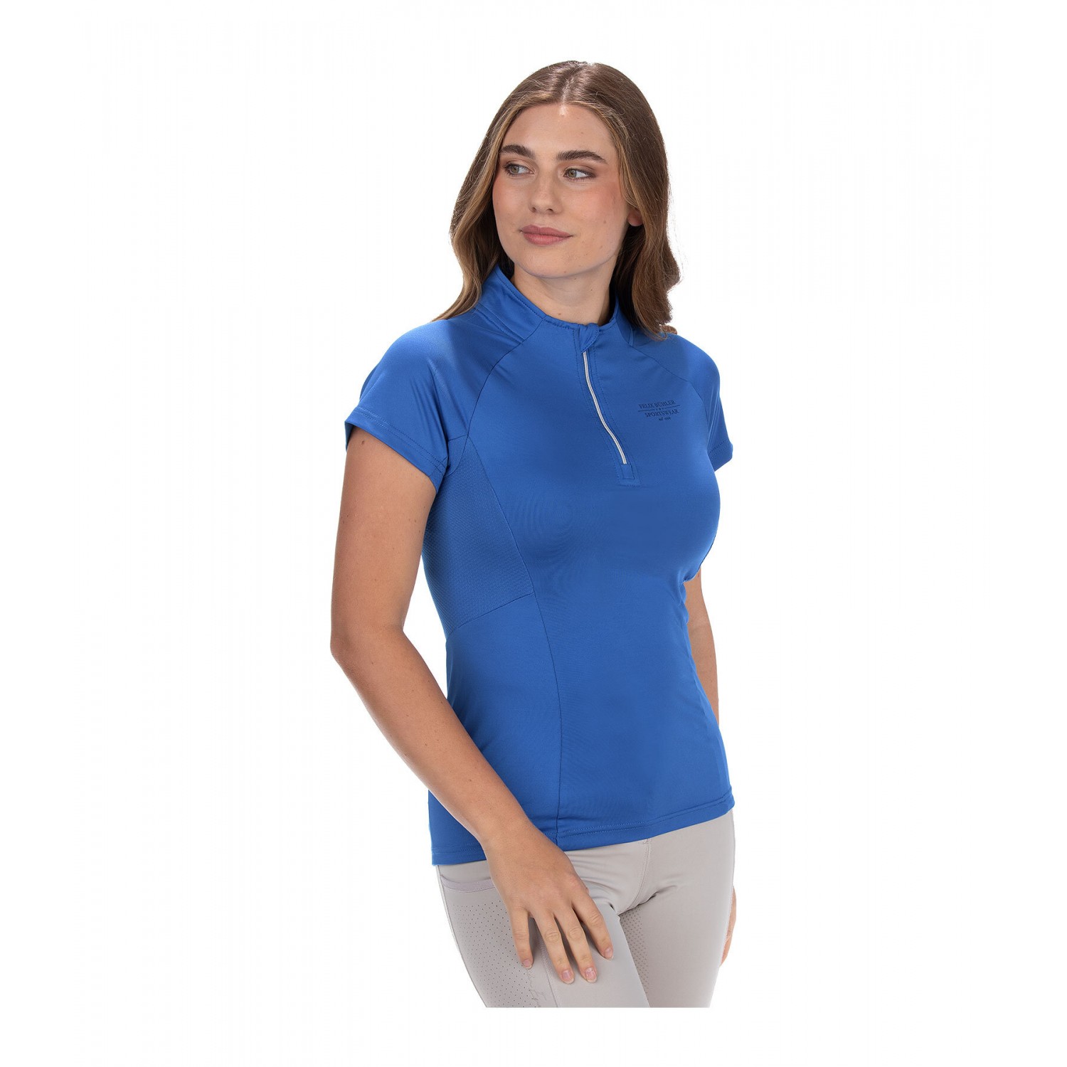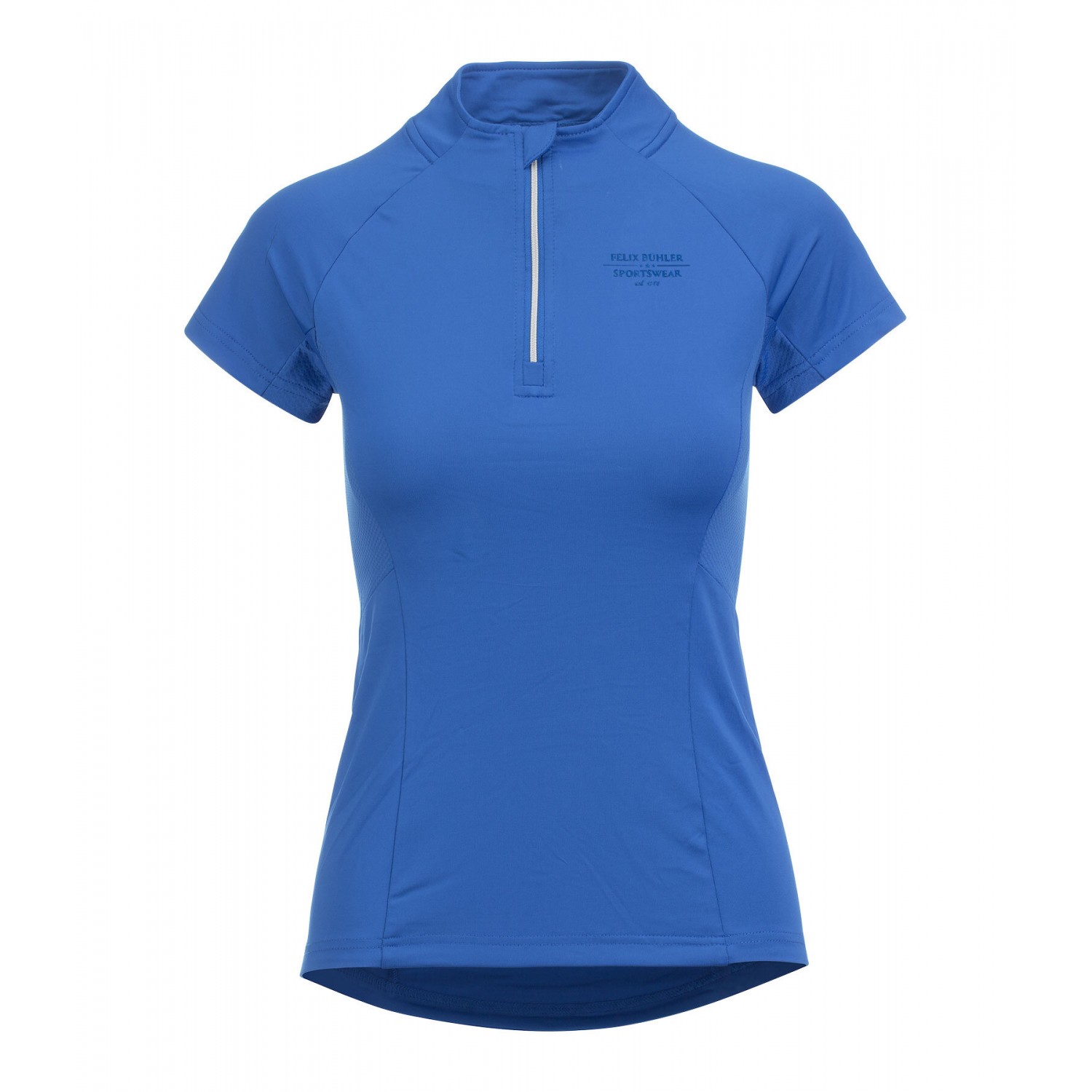 Эластичная и мягкая футболка на молнии с люрексом и воротником-стойкой. Отличная воздухопроницаемость благодаря боковым сетчатым вставкам. Быстросохнущая. 88% полиэстер, 12% эластан.