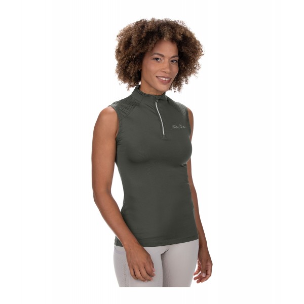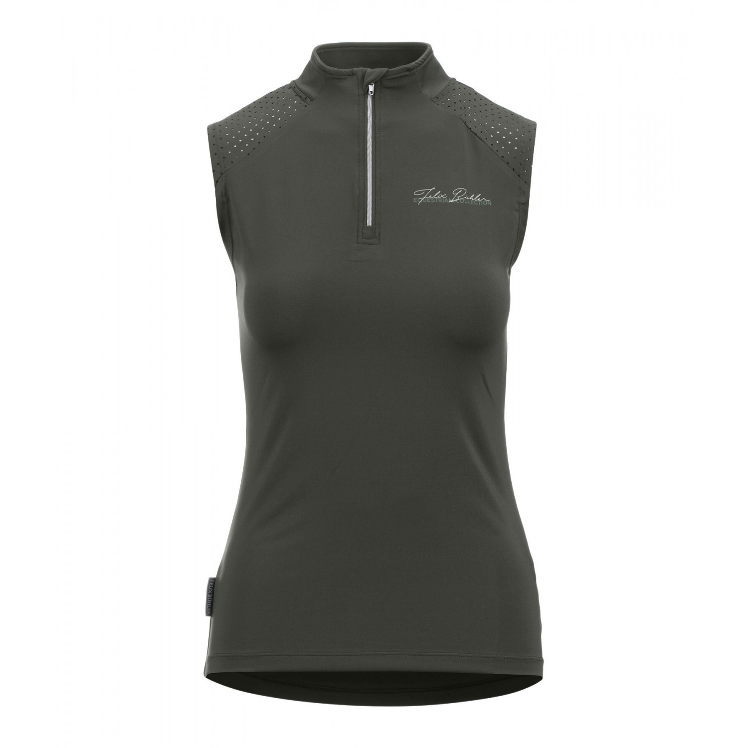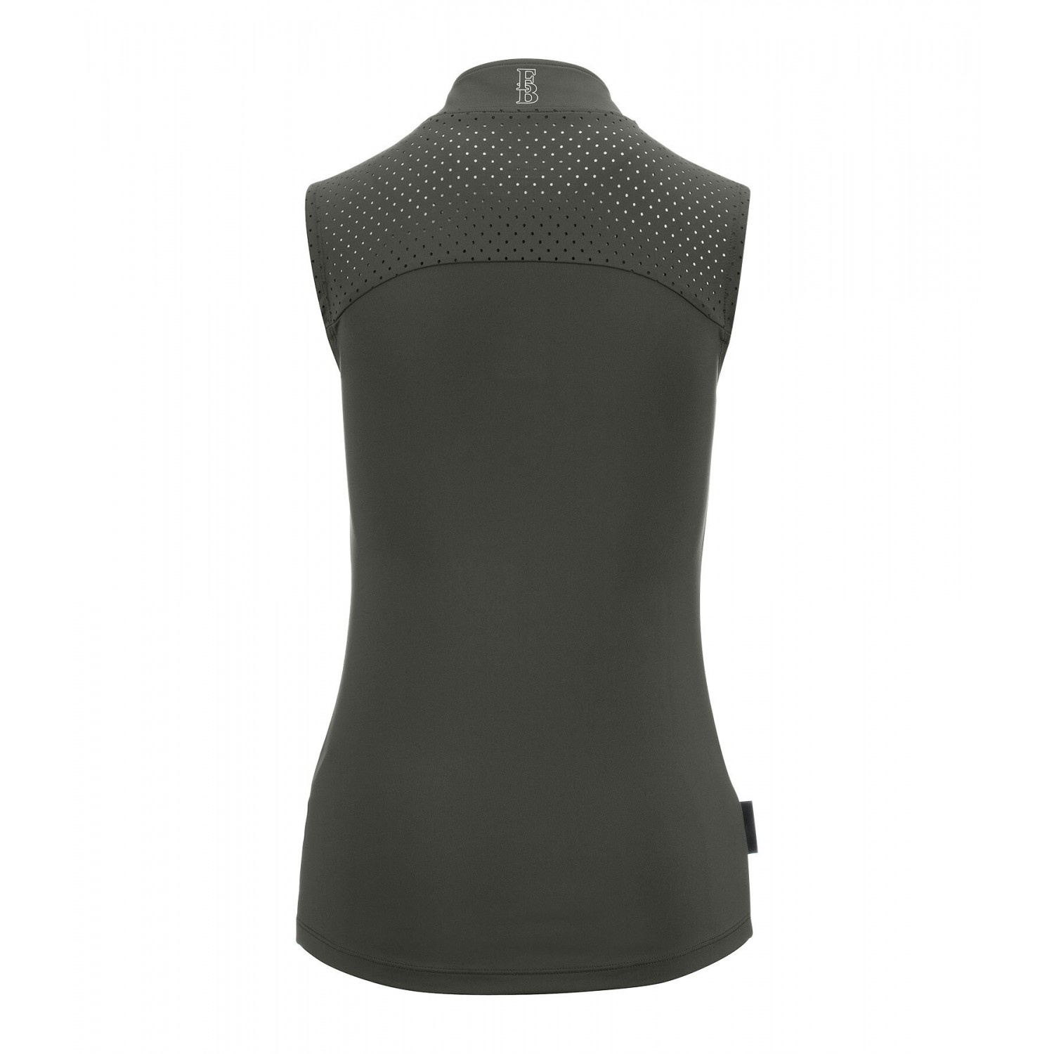 Спортивная футболка без рукавов, со стоячим воротником, застежкой-молнией и защитой подбородка. Оптимальная вентиляция благодаря функциональной перфорации в области плеч и верхней части спины. Дышащая и быстросохнущая. С логотипом. 88% полиэстер, 12% эластан.